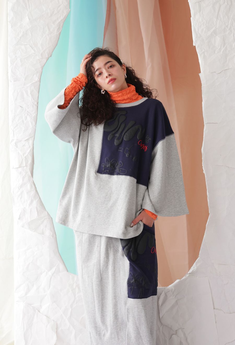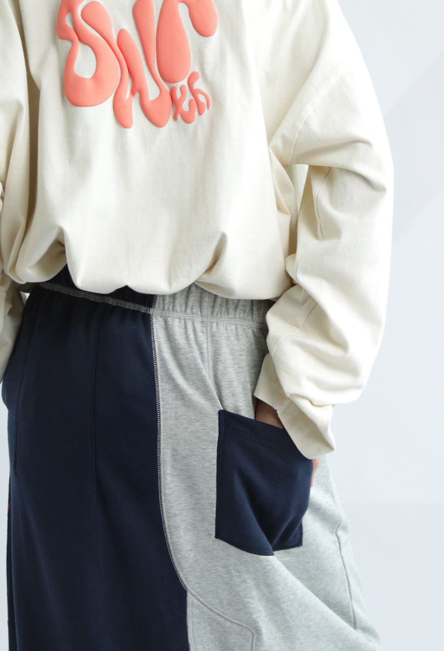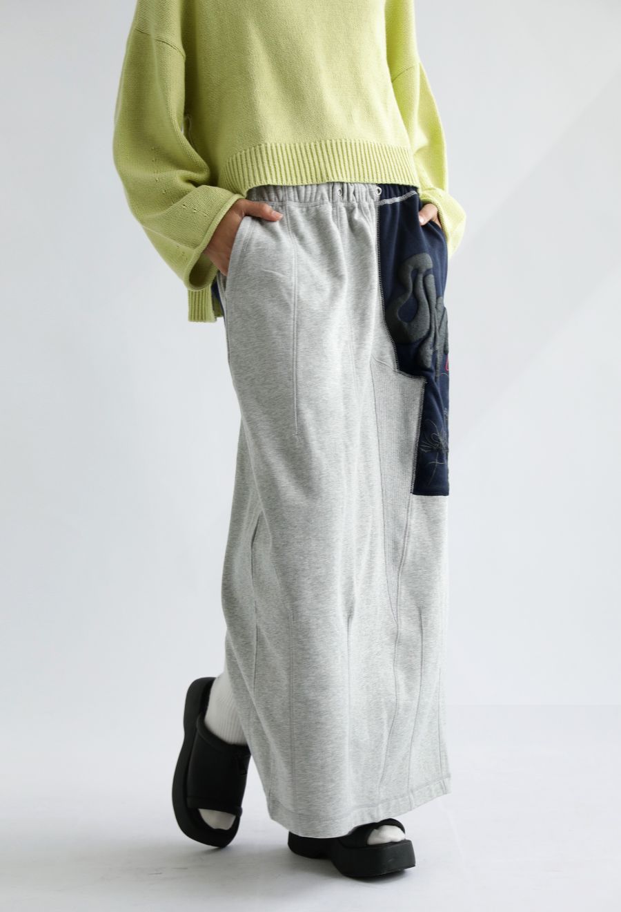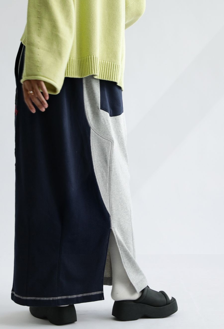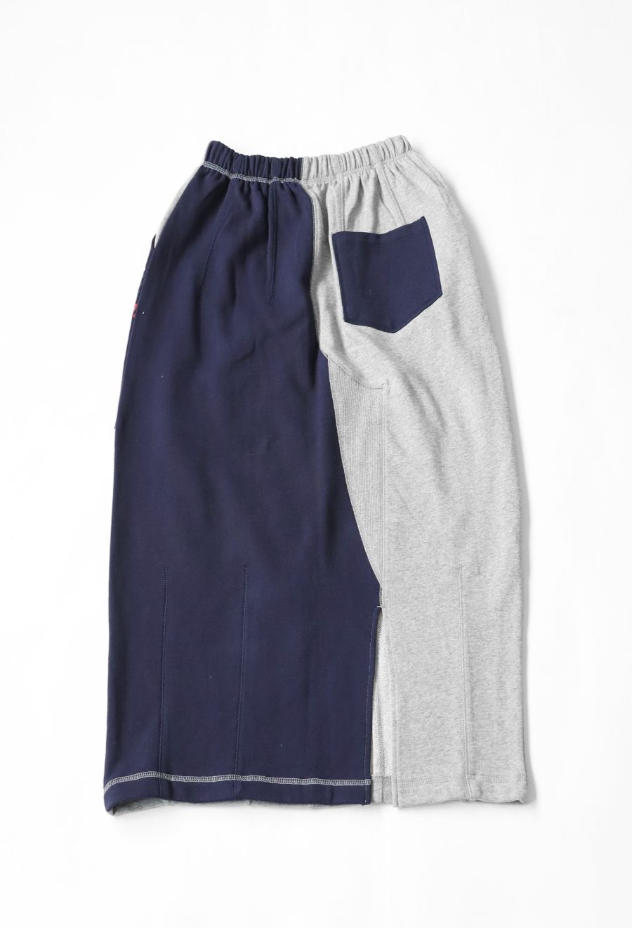 大胆な前後切替とロゴデザインが目を引く、OWNthの裏毛ロングスカート。