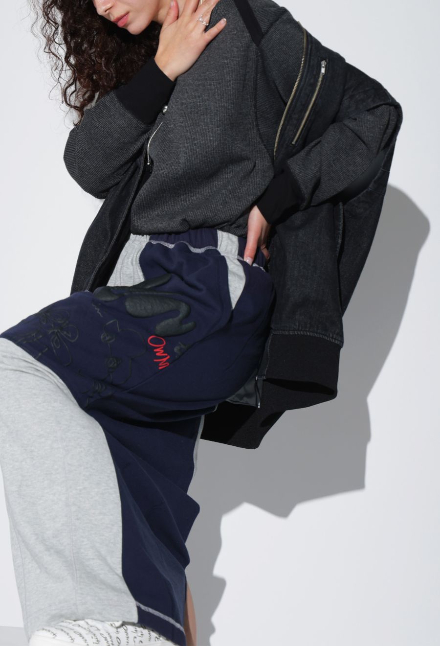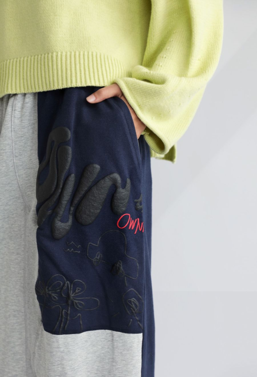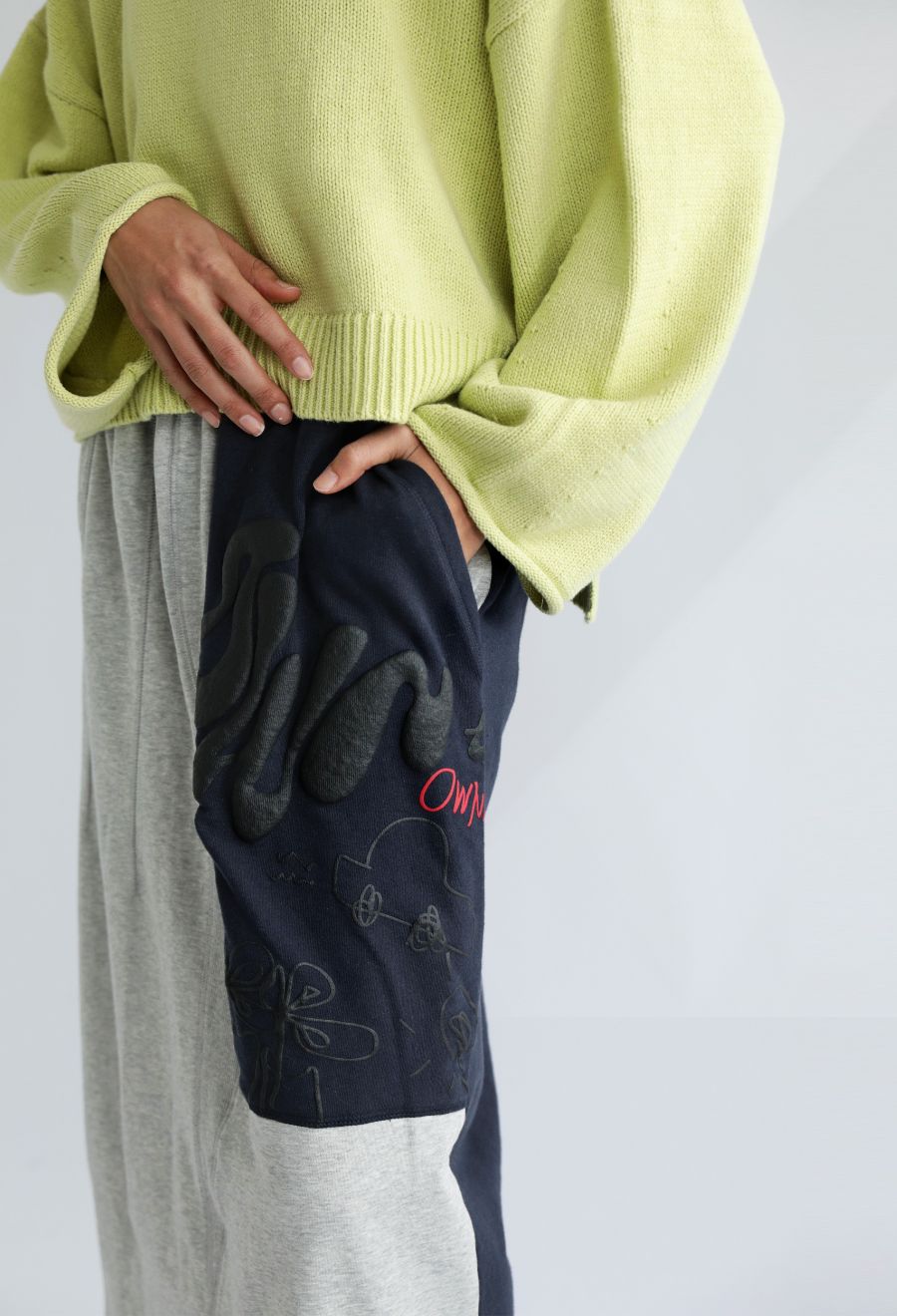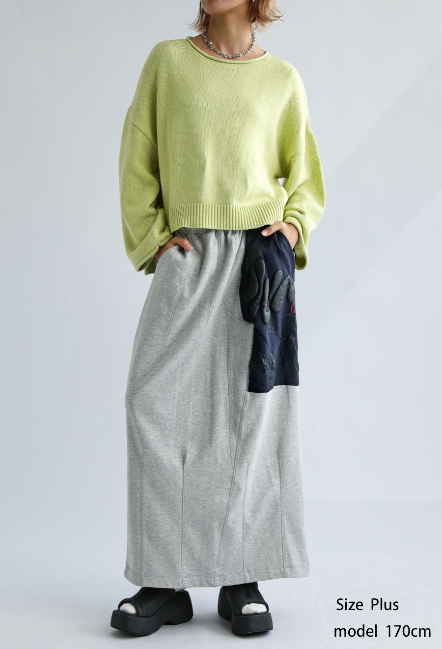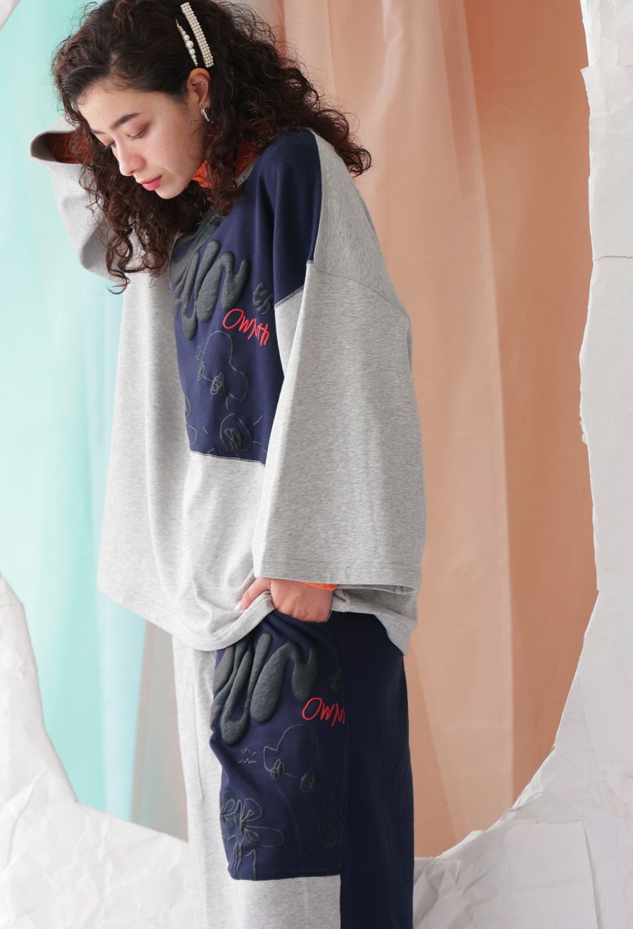 大胆な前後切替とロゴデザインが目を引く、OWNthの裏毛ロングスカート。