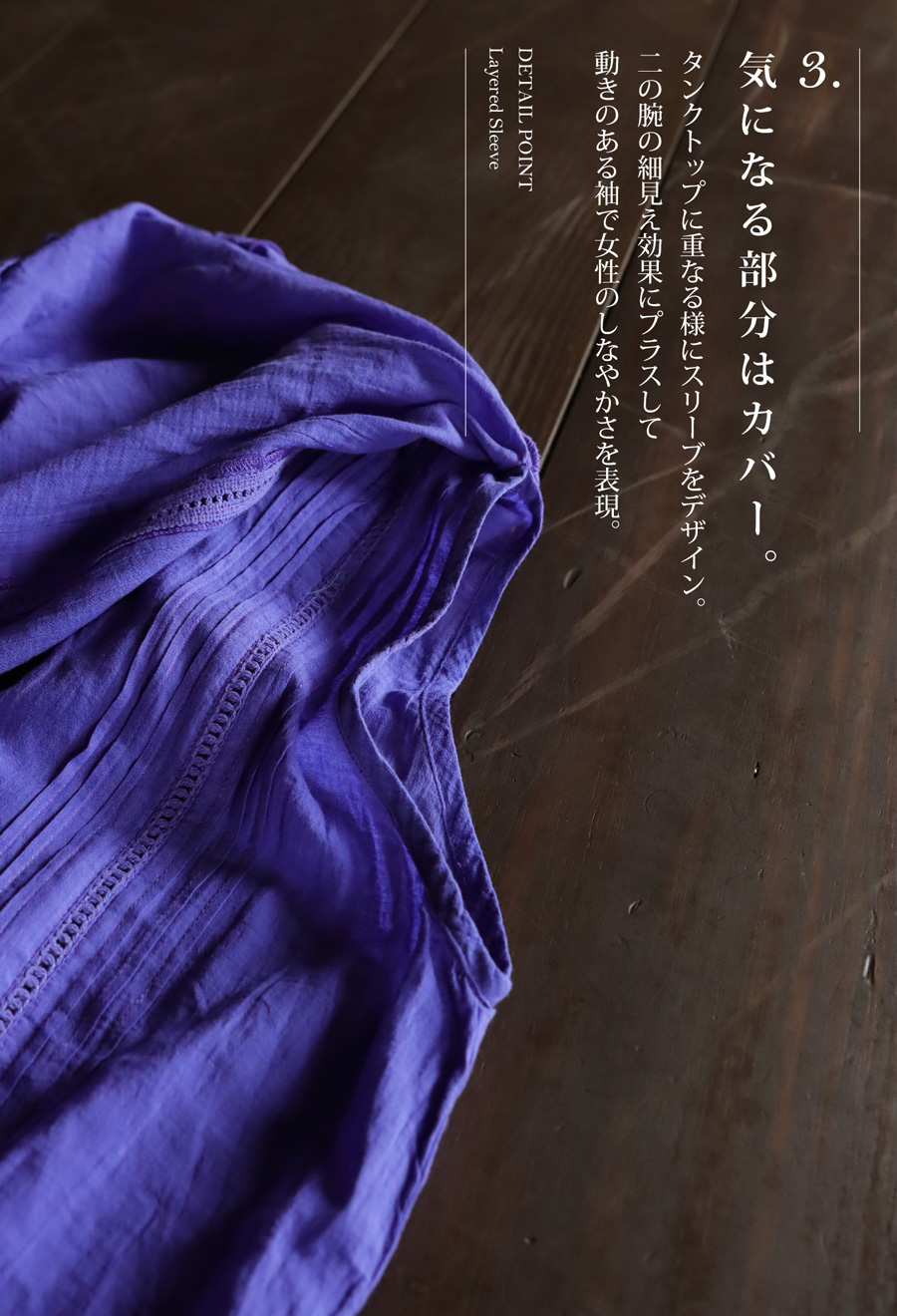 重なったスリーブデザインで気になる二の腕もカバーしてくれる優秀アイテムです。