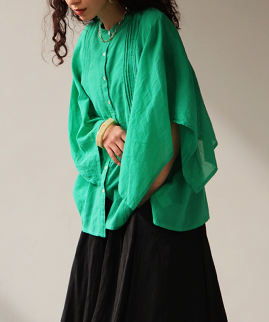 ・襟元はスタンドカラーでスッキリ魅せを叶える。