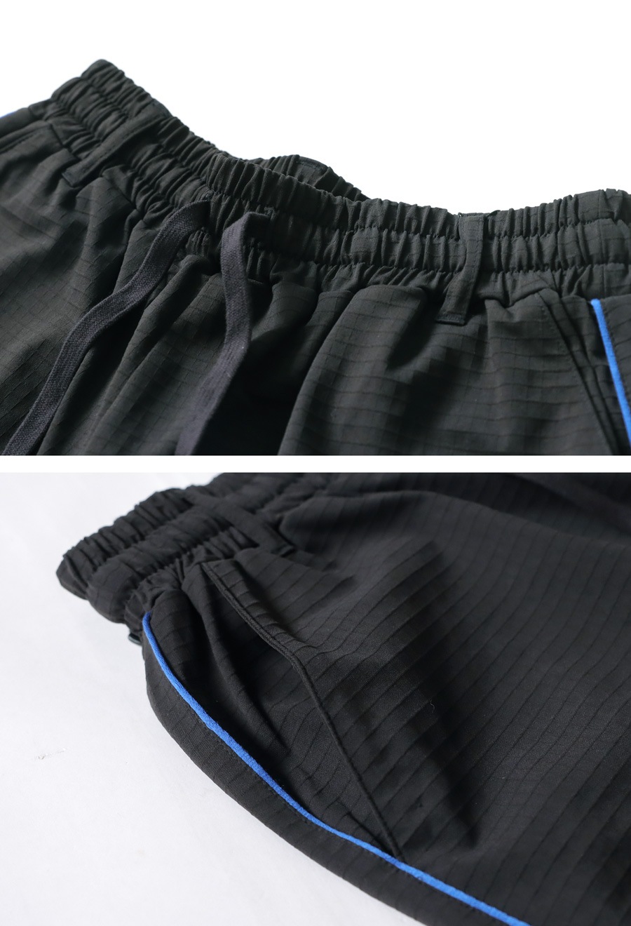 ・目を惹く青のパイピングデザイン。