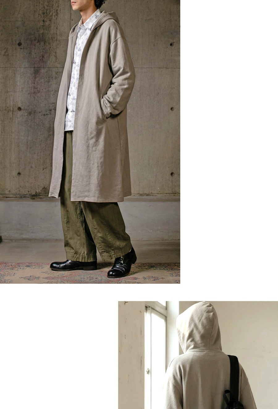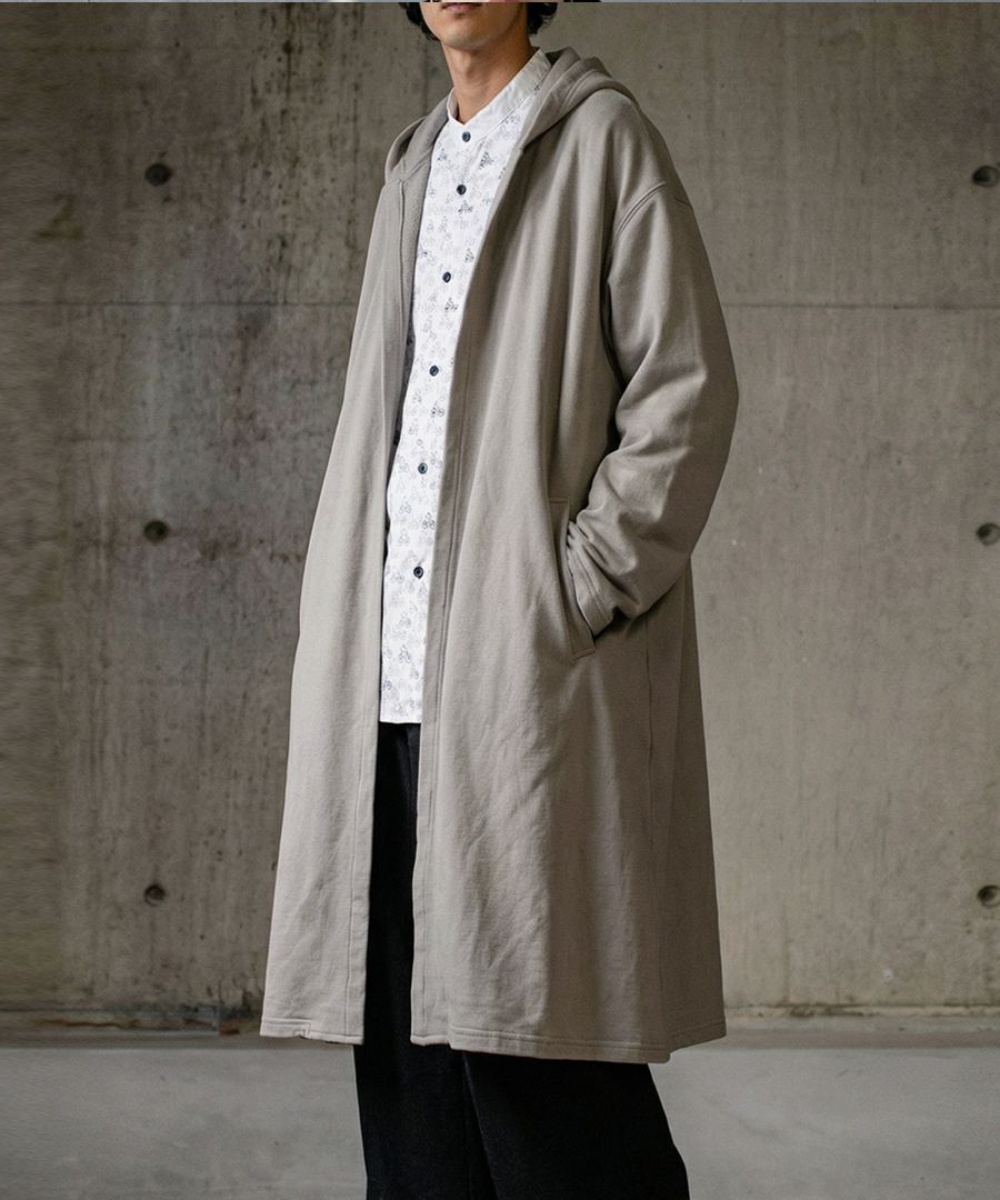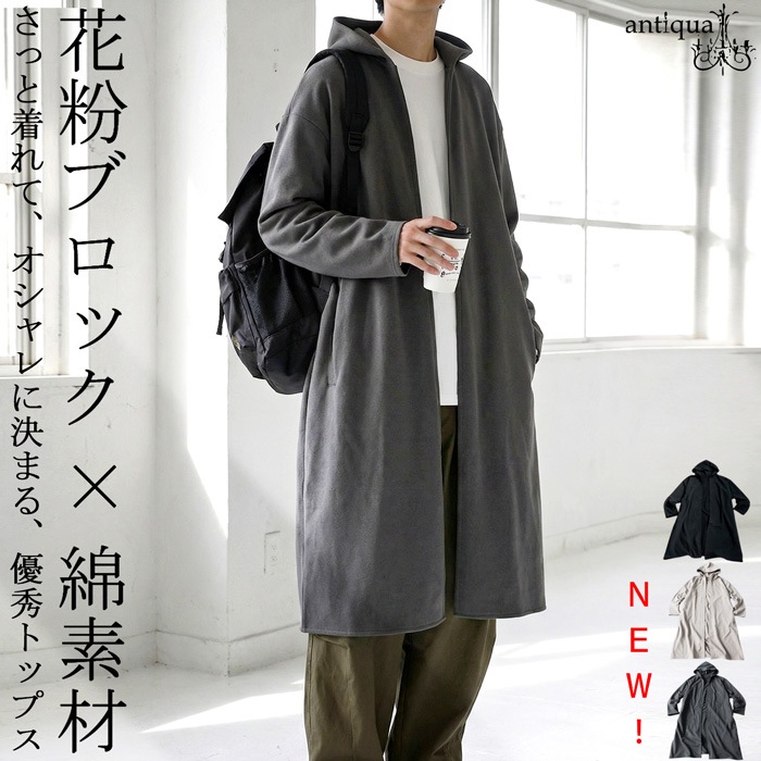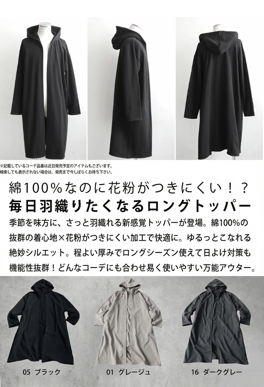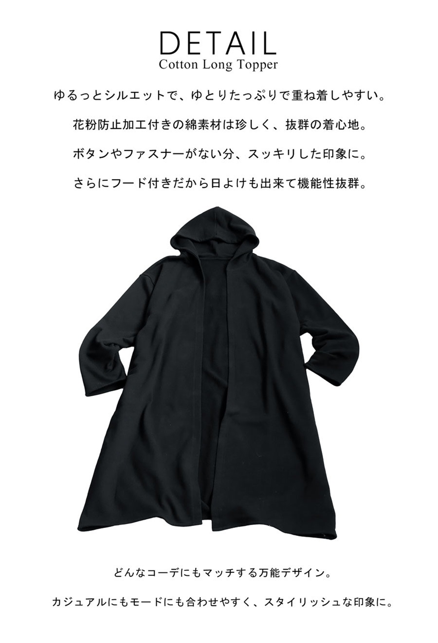 花粉が付きにくい特殊加工を施した綿(コットン)100%素材で仕立てたロングトッパー(羽織り)です。