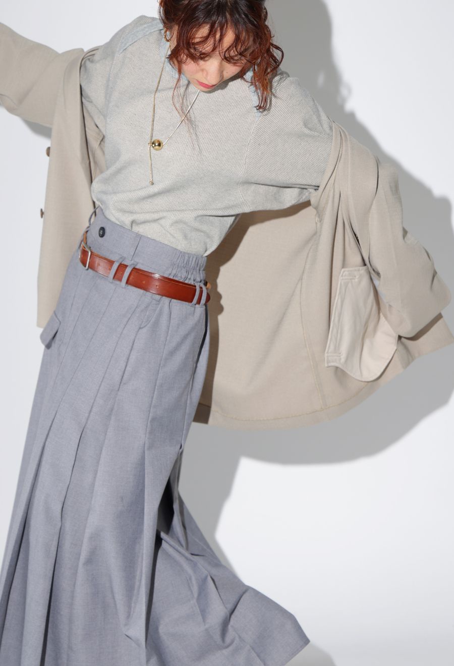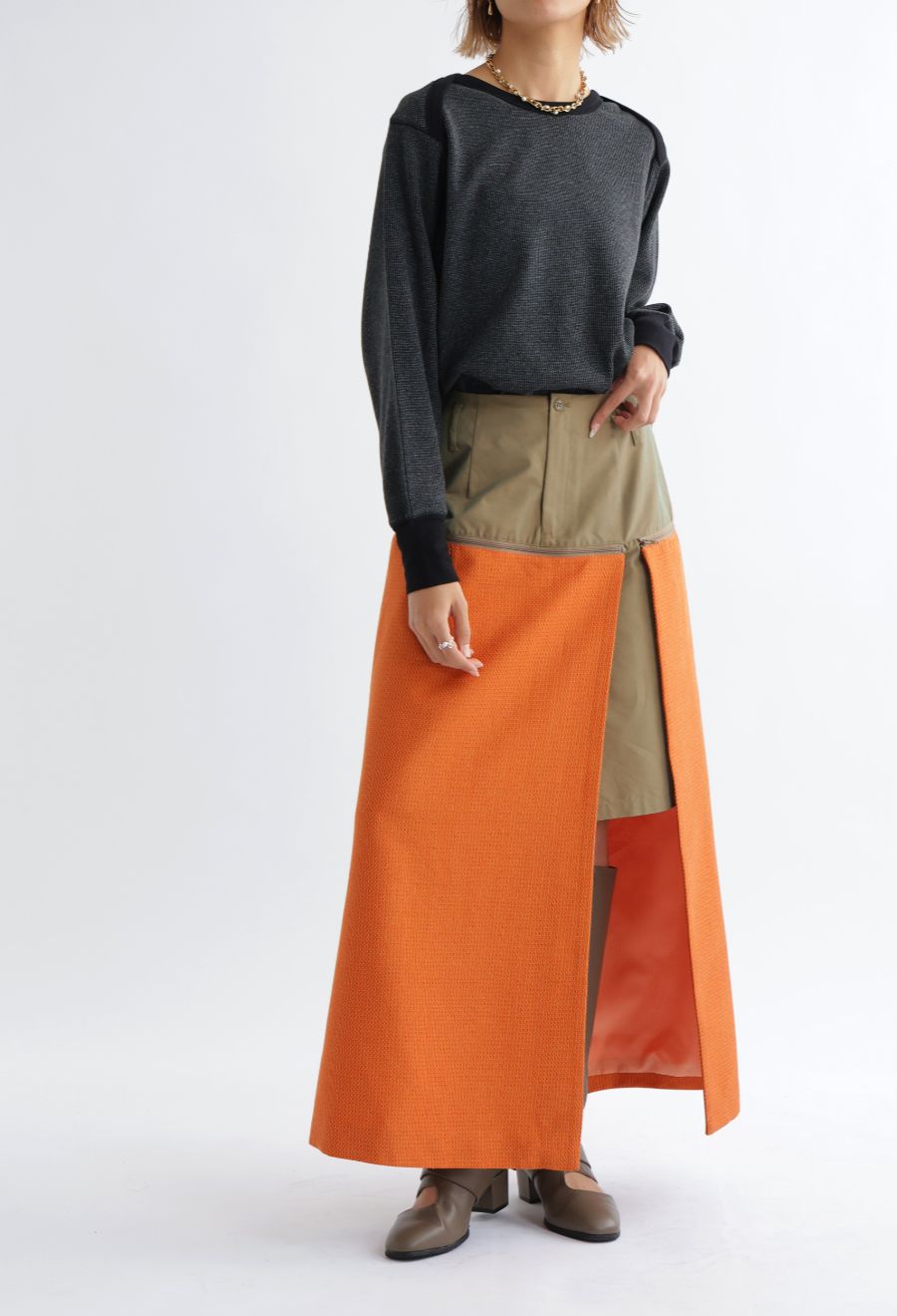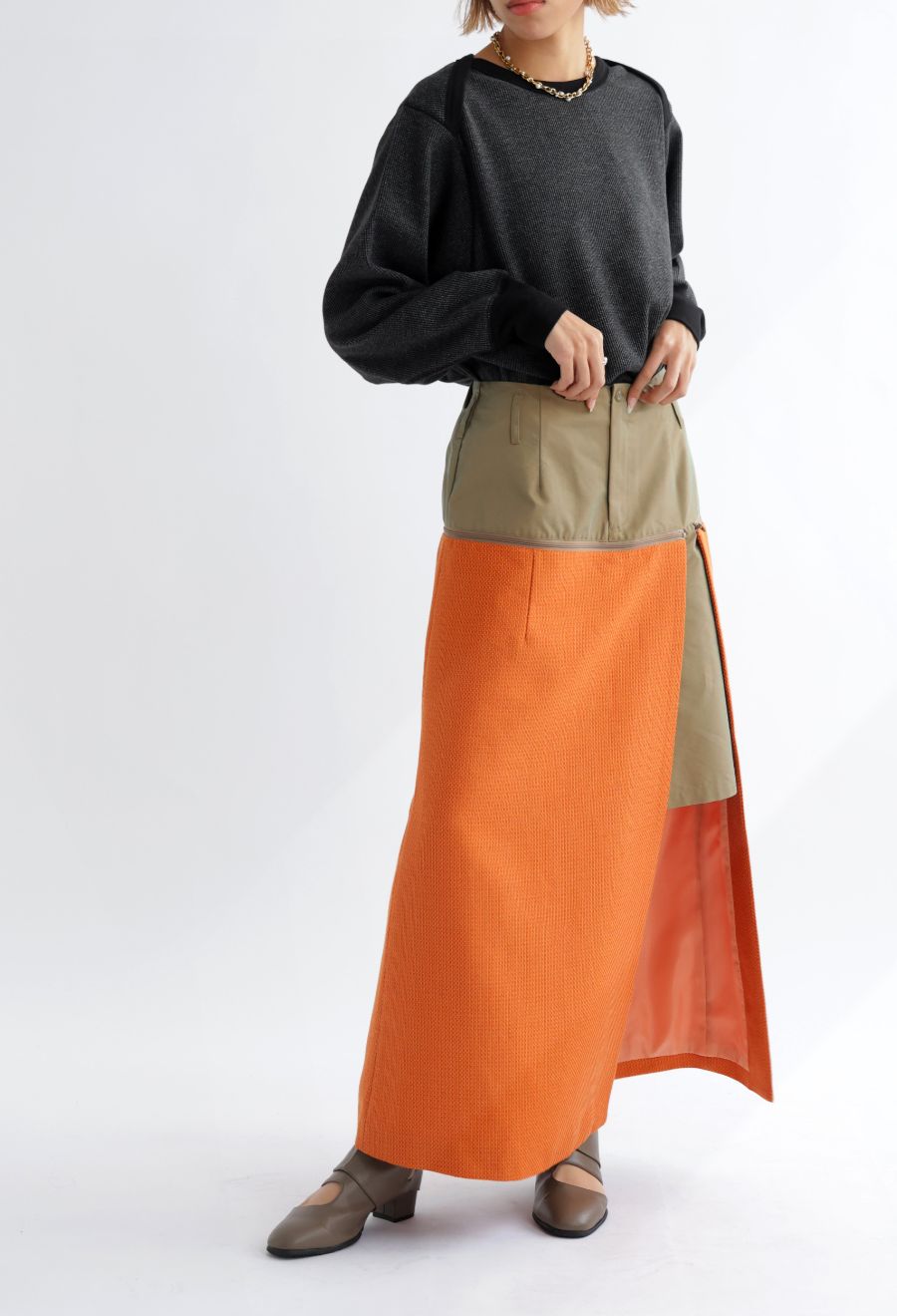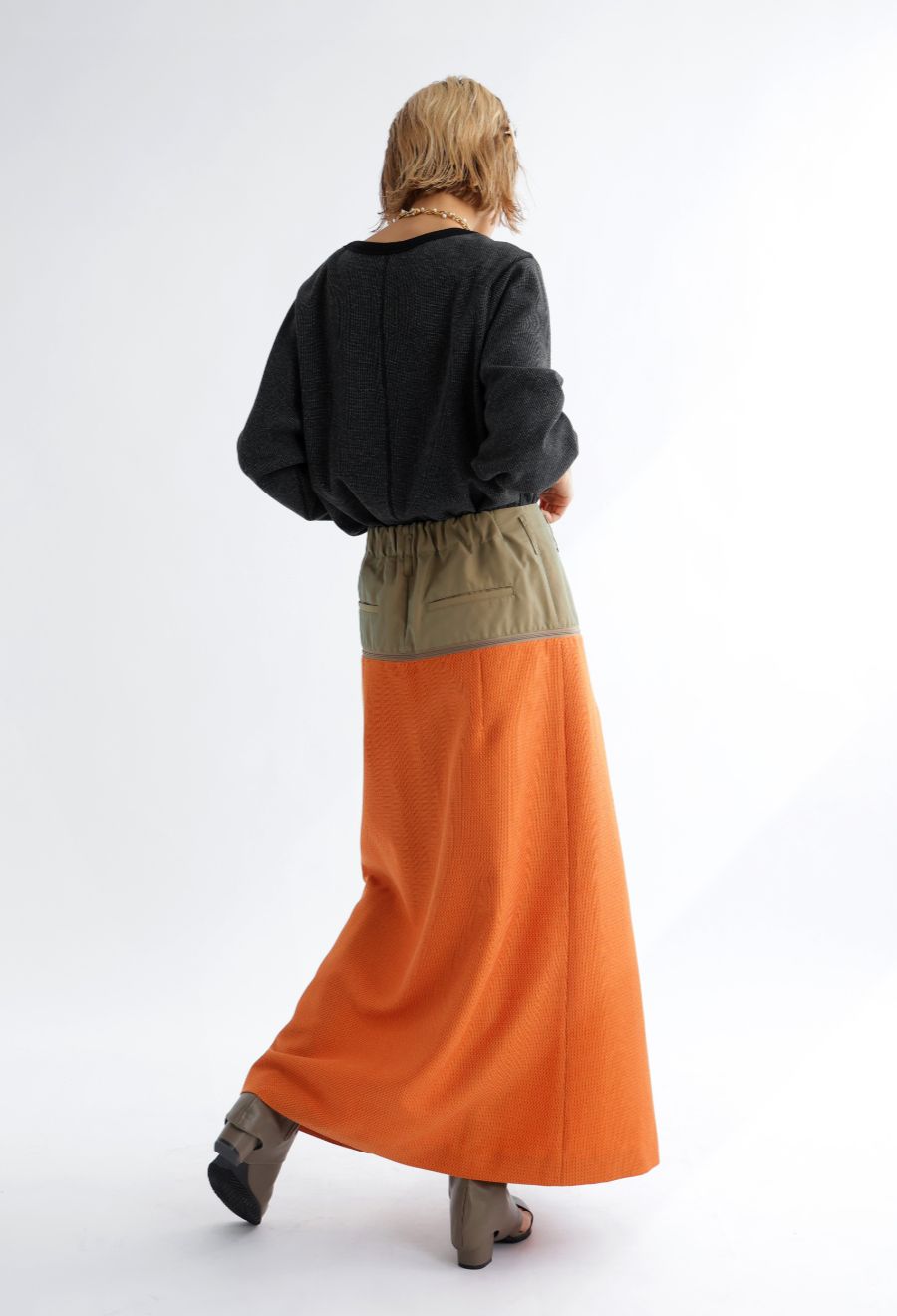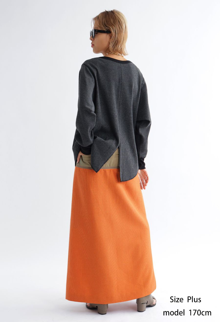 バックスタイルには深めのスリットを入れ、動きやすさと抜け感をプラス。
