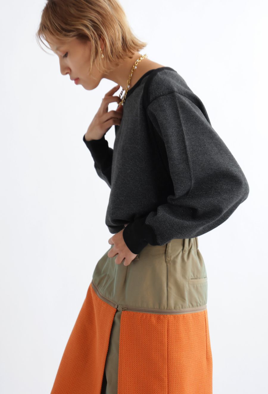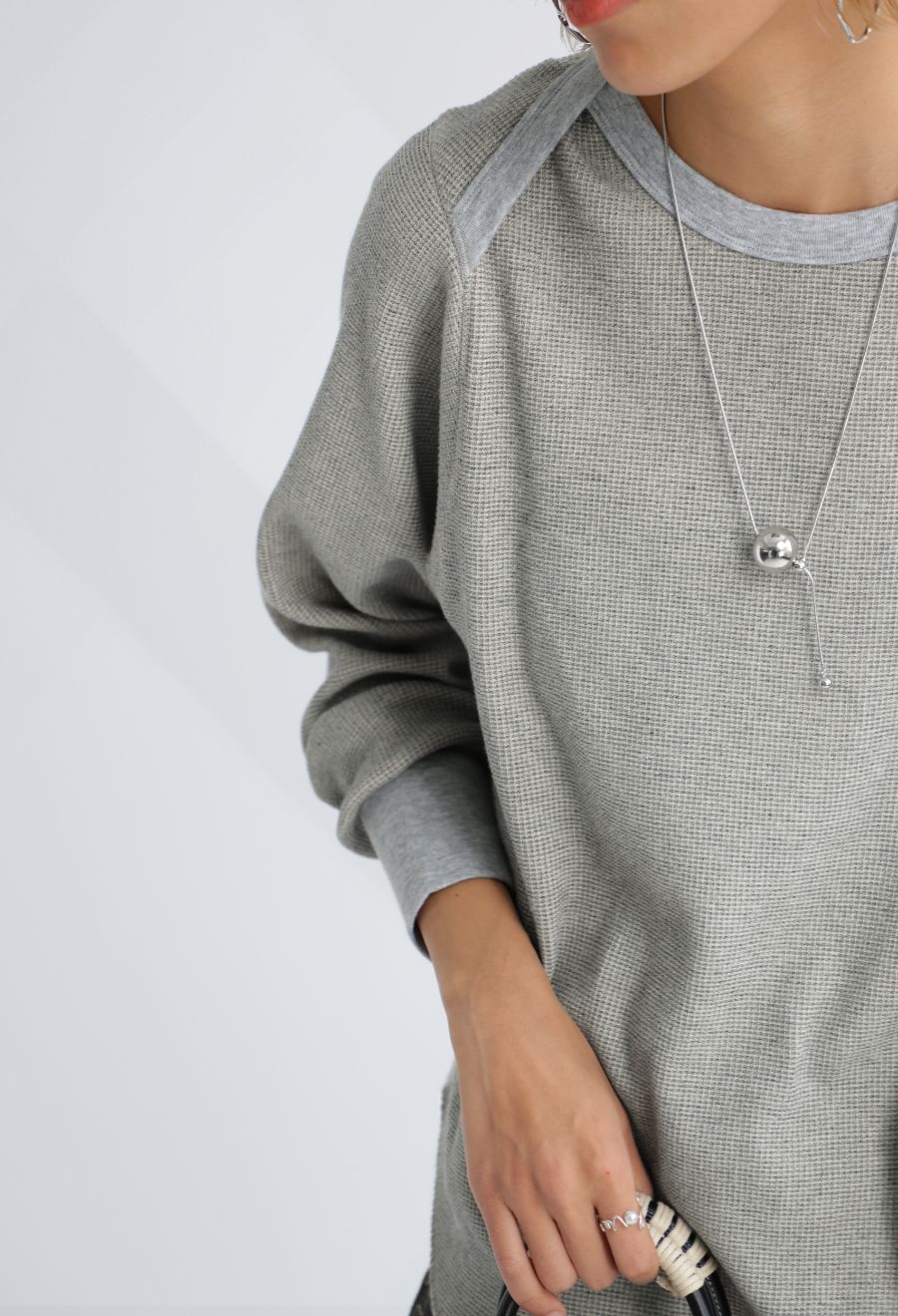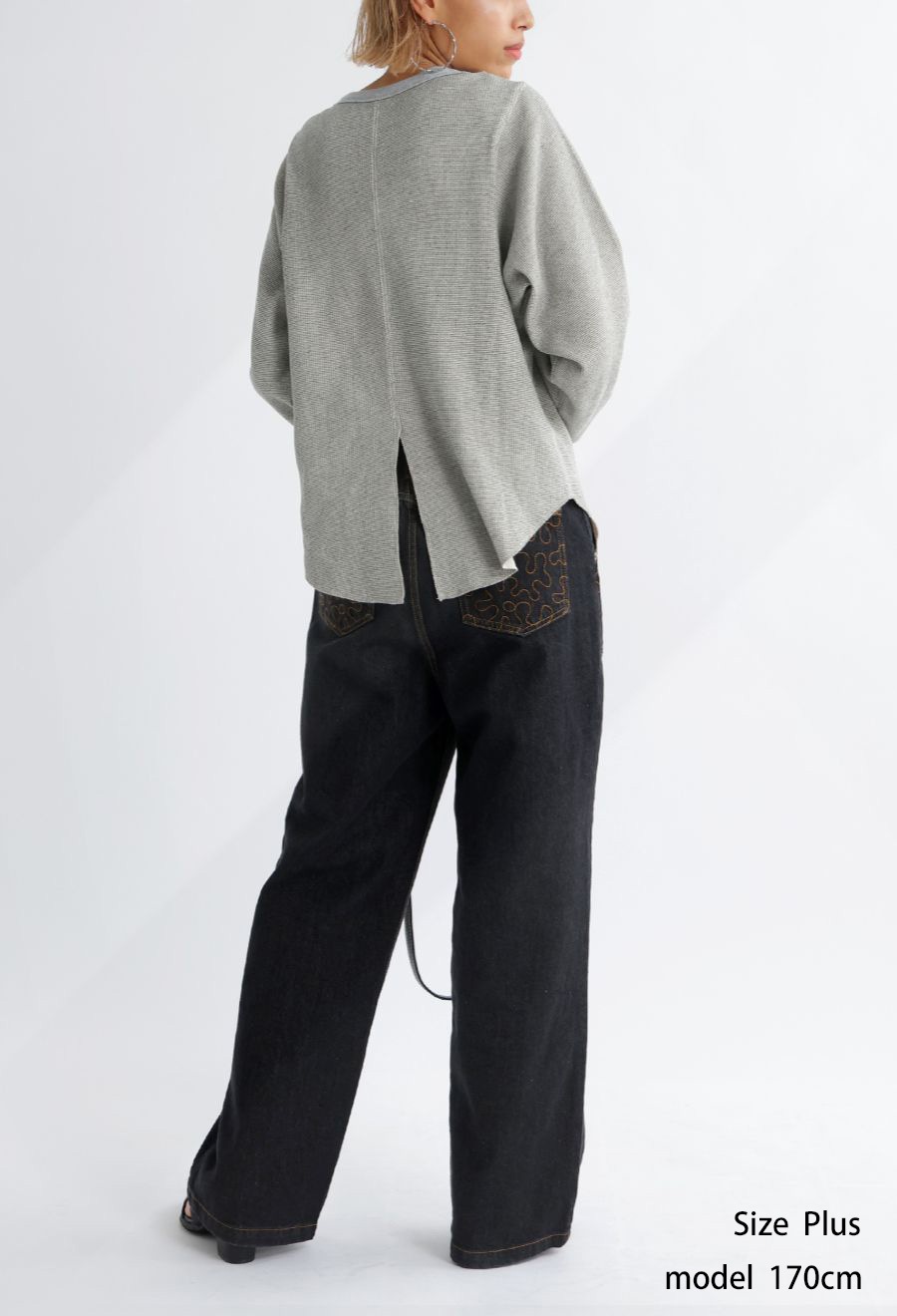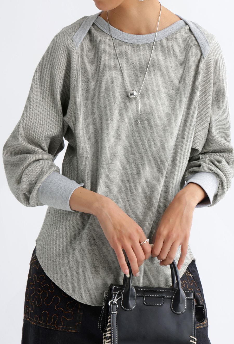 ラウンドカットの裾と相まって、レイヤードスタイルにも最適です。