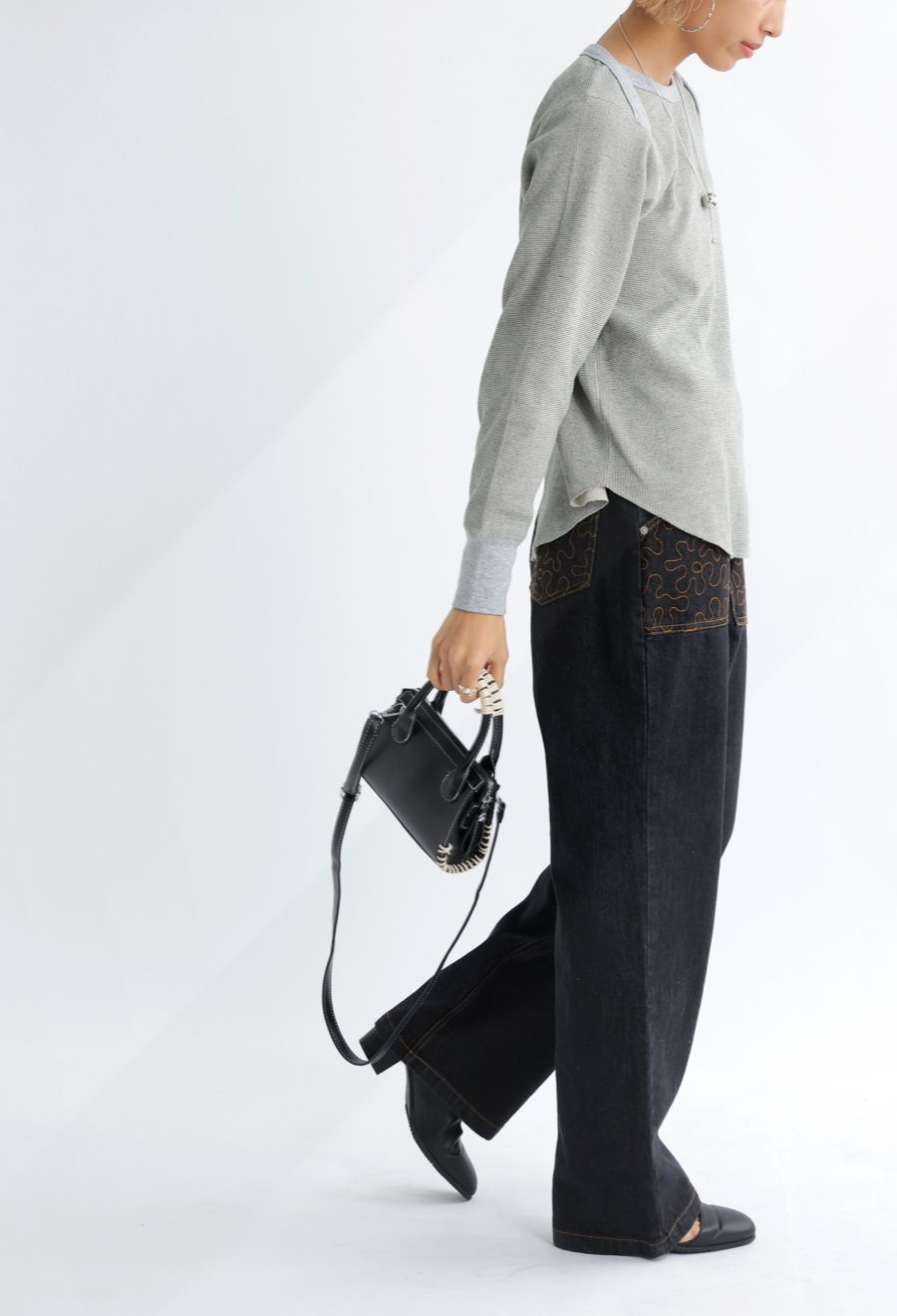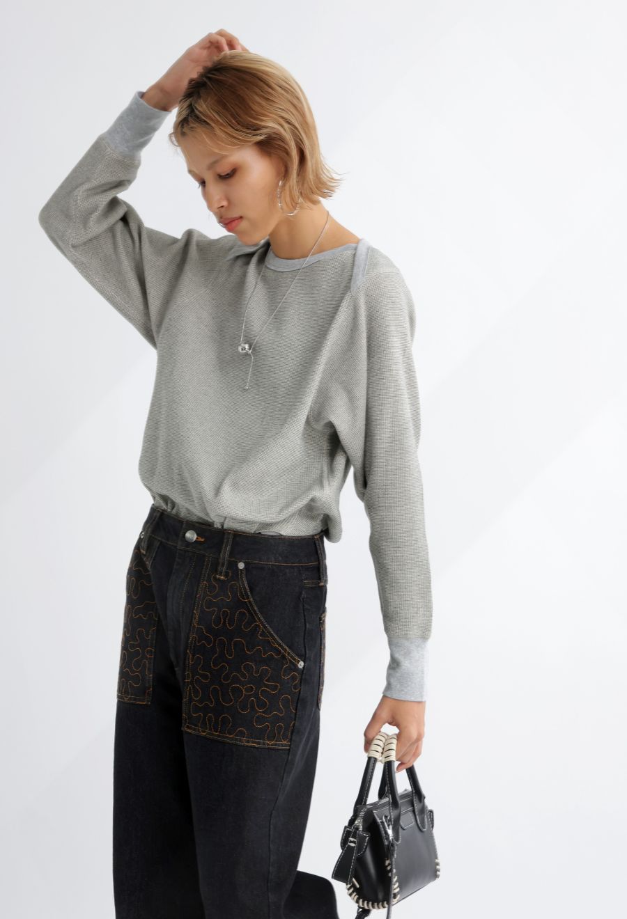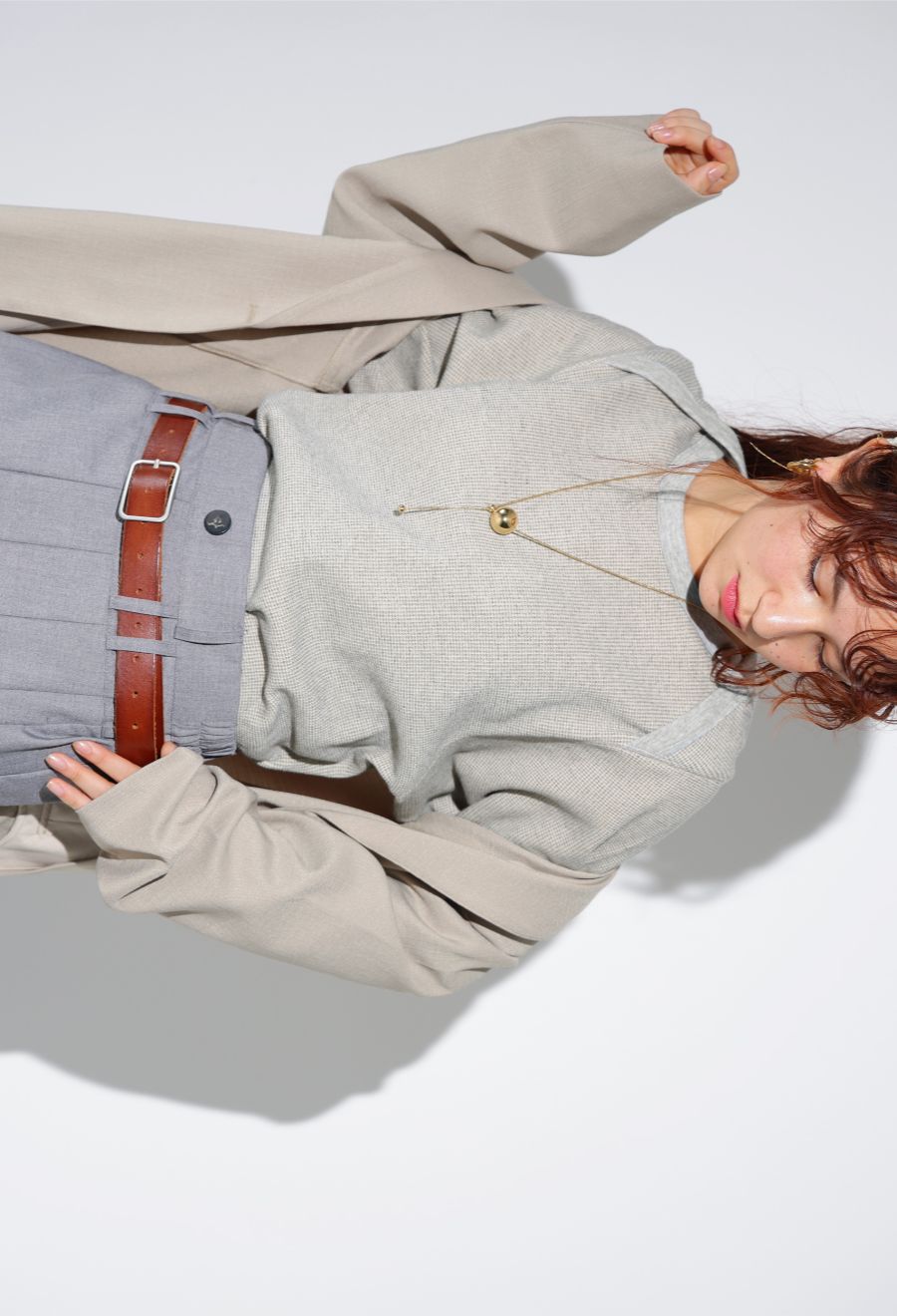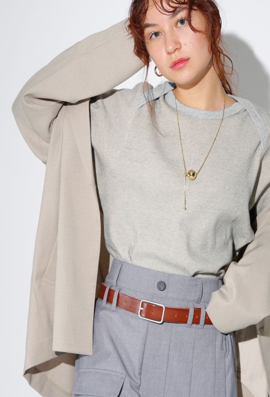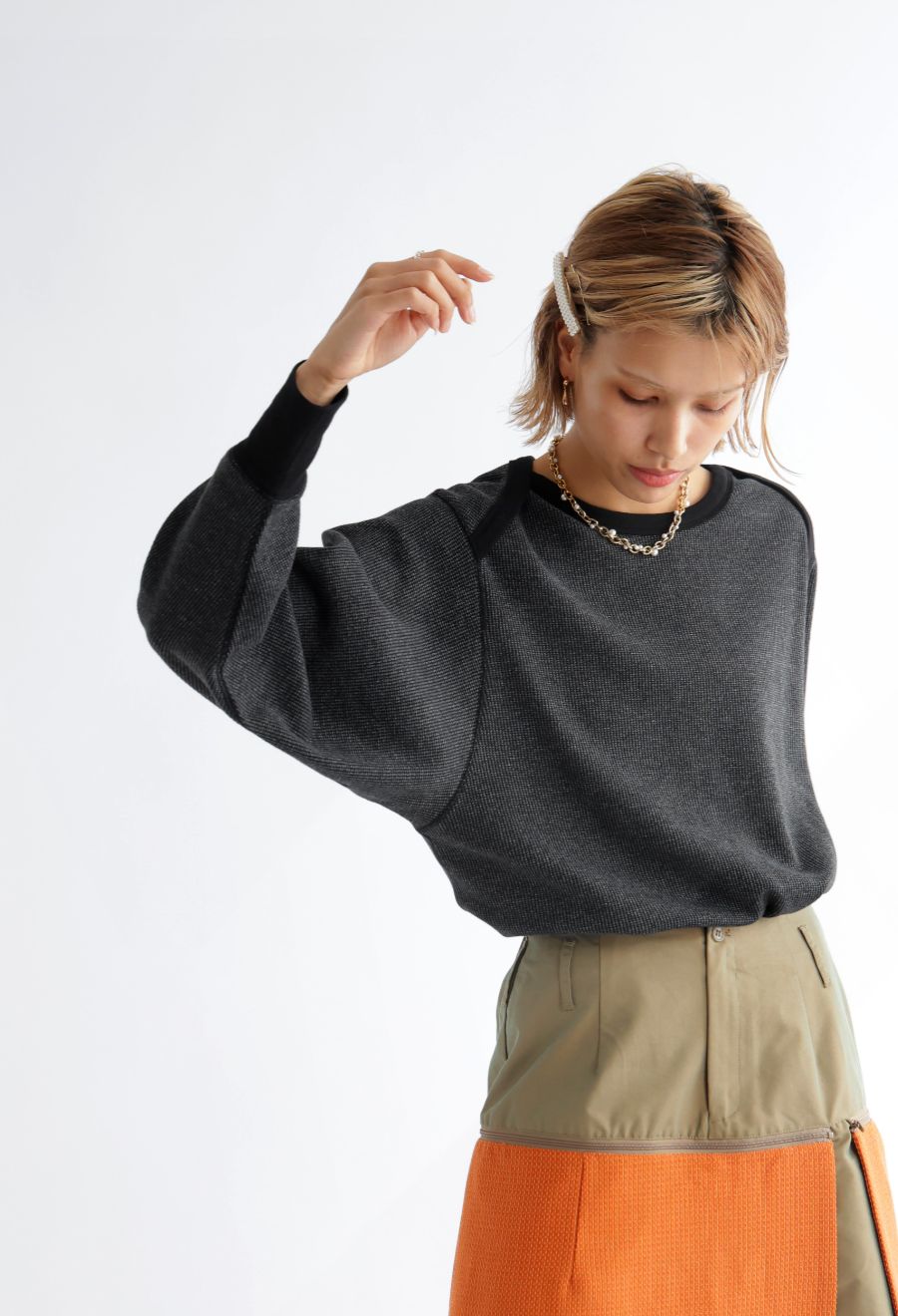 ラウンドカットの裾と相まって、レイヤードスタイルにも最適です。