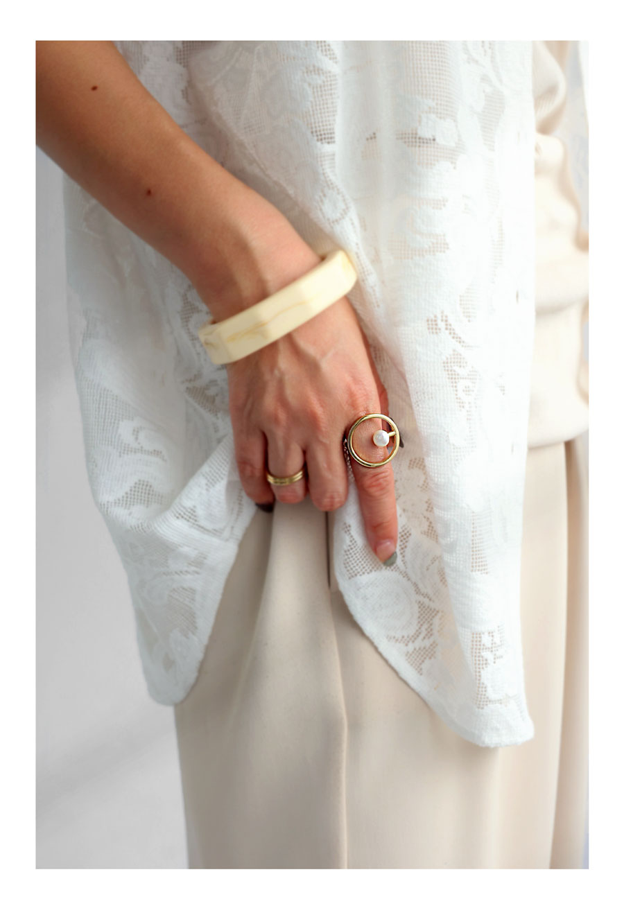 パールとゴールドの組み合わせが、レディ感を高めてくれるデザインリング。