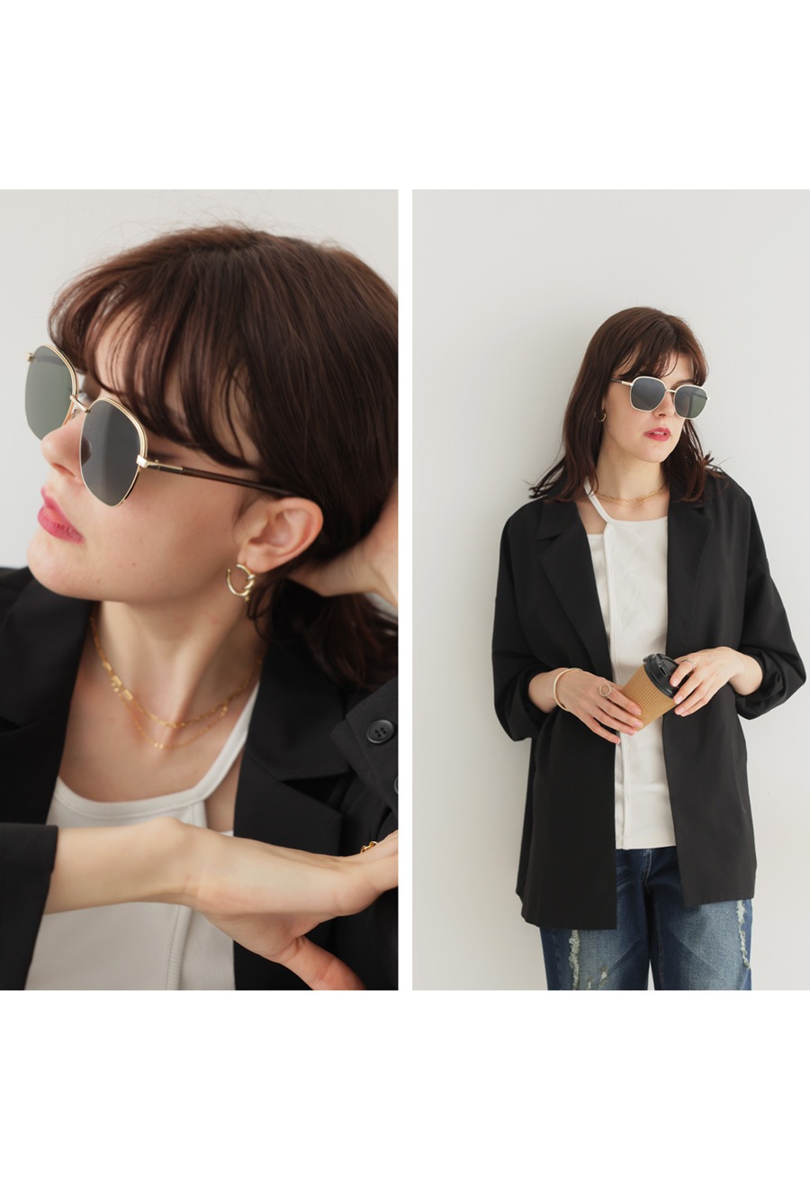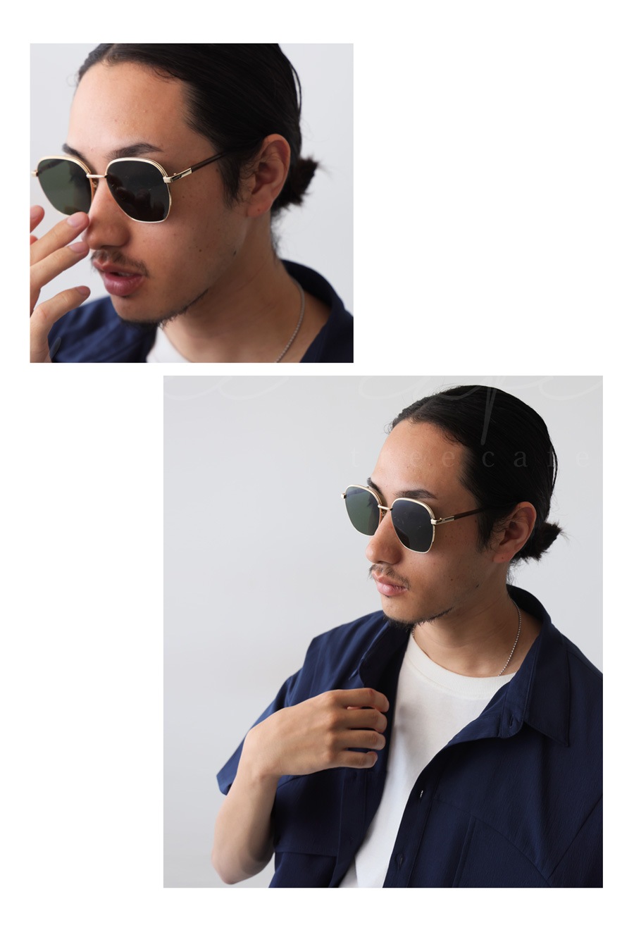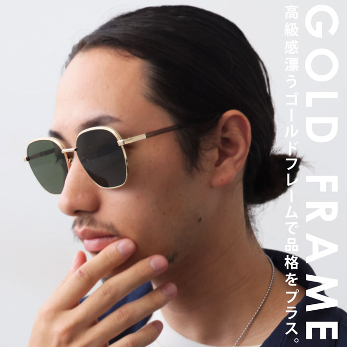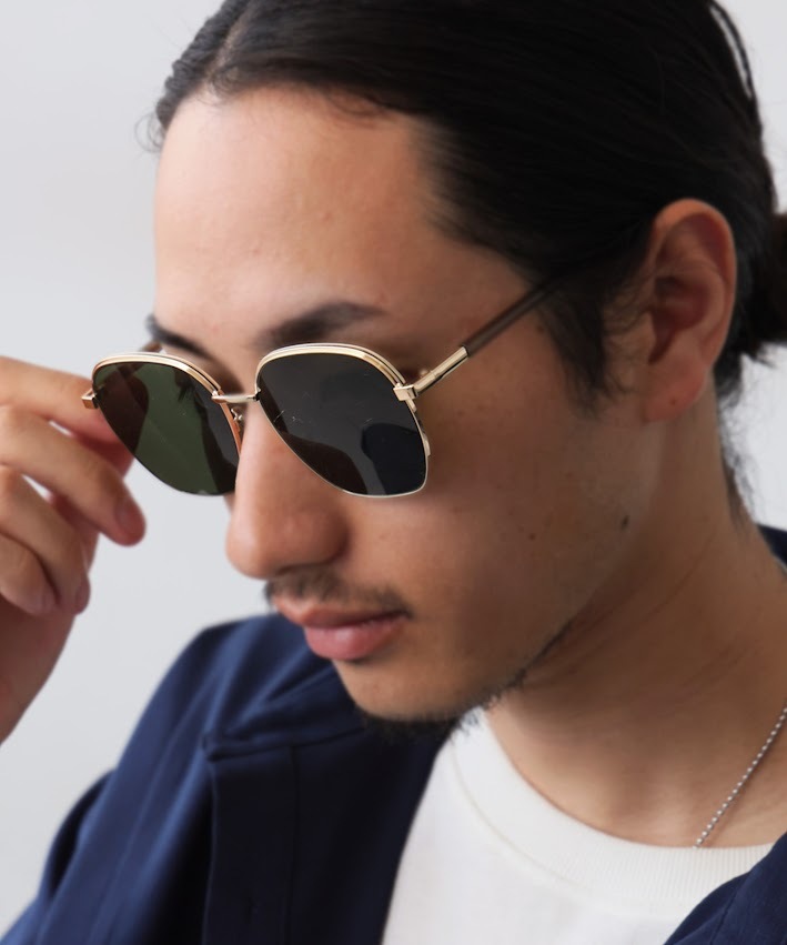ゴールドフレームに濃いカラーのレンズを合わせた、トレンドライクなサングラス。