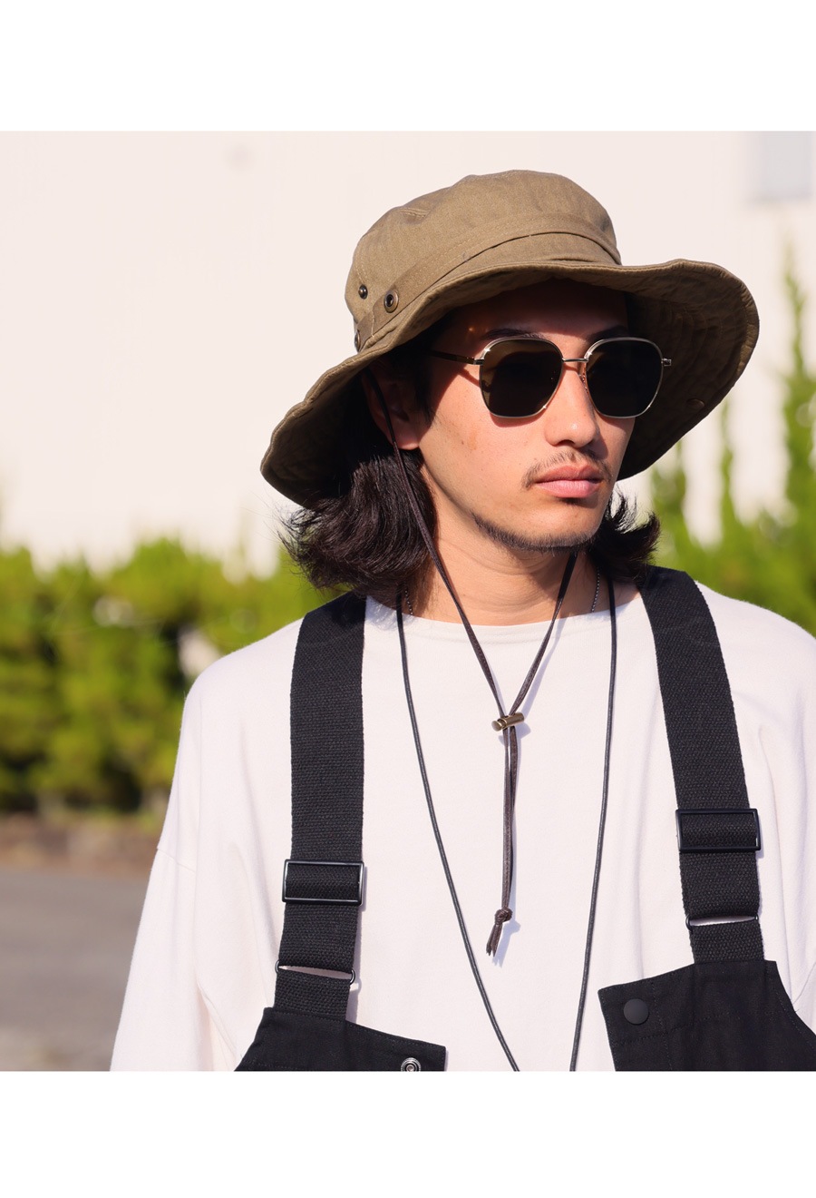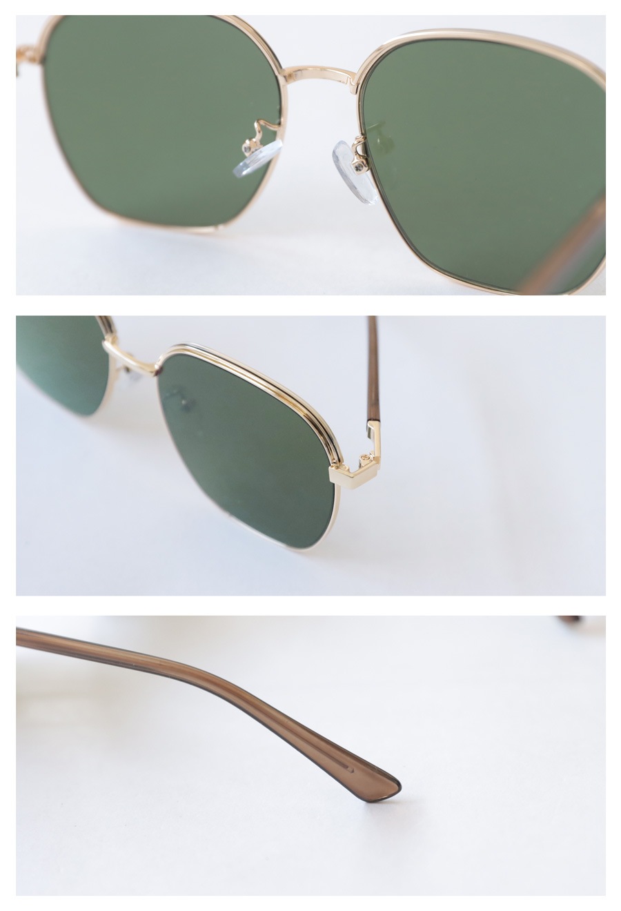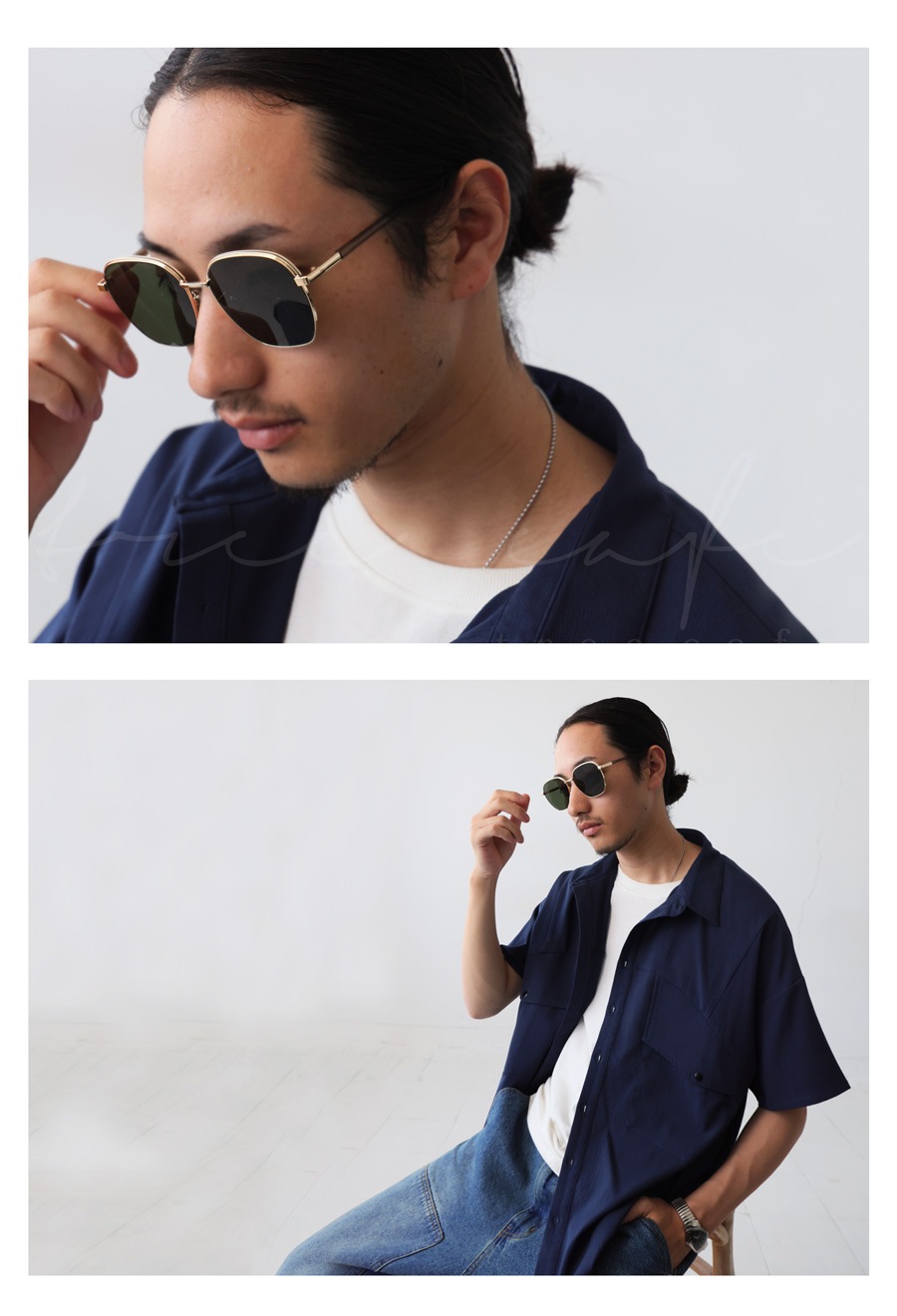 ゴールドフレームに濃いカラーのレンズを合わせた、トレンドライクなサングラス。