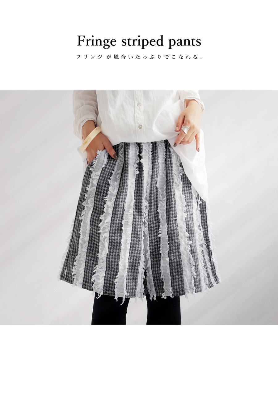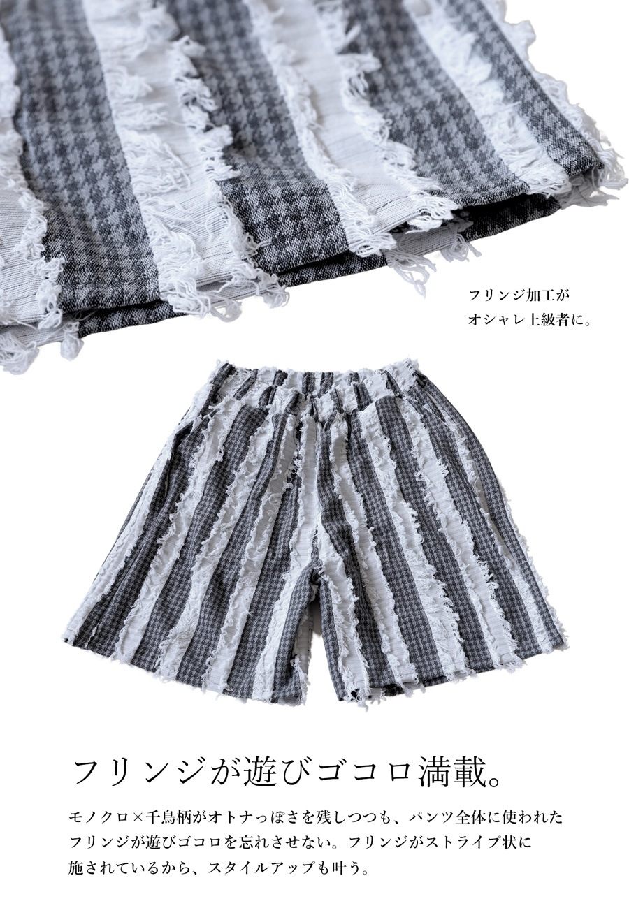 【検索ワード】フリンジパンツ パンツ レディース ハーフパンツ ハーフ丈 セットアップ 柄 柄パンツ ストライプ柄 千鳥柄 千鳥格子 ハウンズ・トゥース スターチェック フリンジ ウエストゴム ポケット付き 綿混 麻混 リネン混 ゆったり サイズ展開 Regular Plus シンプル ナチュラル シボ感 モノトーン 半ズボン 短パン ショートパンツ イージーパンツ 上品 きれいめ 大きめ 大きいサイズ ユニセックス antiqua treecafe アンティカ ツリーカフェ 大人 おしゃれ 10代 20代 30代 40代 50代 60代 春 夏 お洒落 カジュアル かわいい かっこいい あんてぃか
