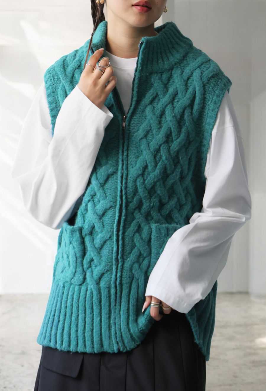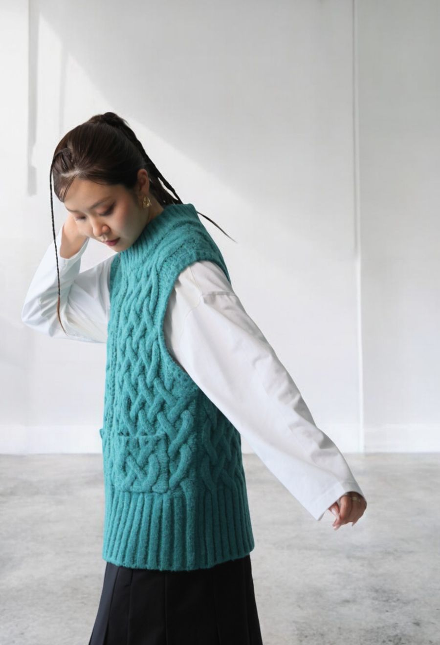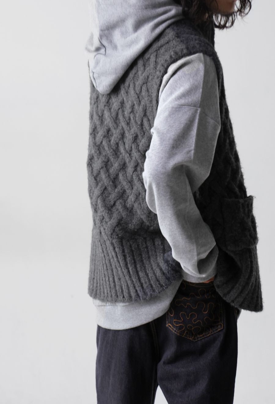 立体的な籠編み風デザインが印象的な、レイヤードコーデに映えるユニセックス仕様のニットベストです。