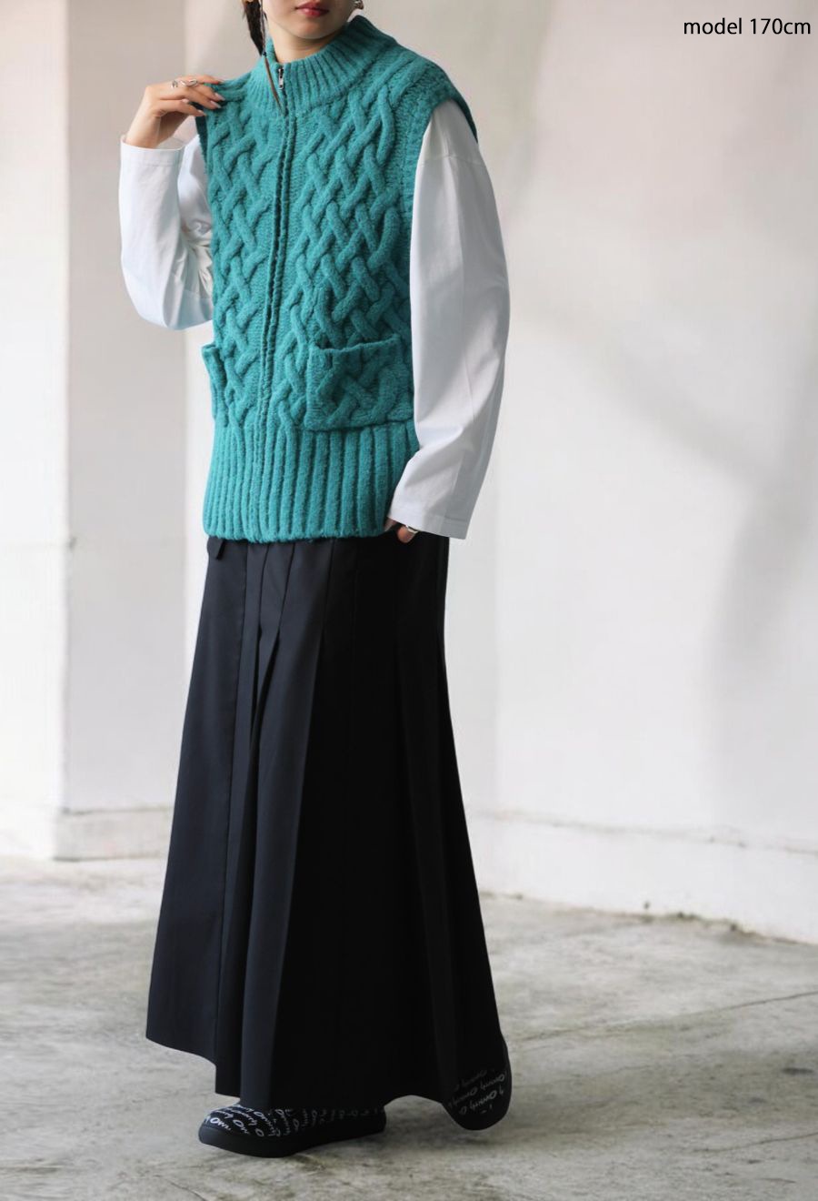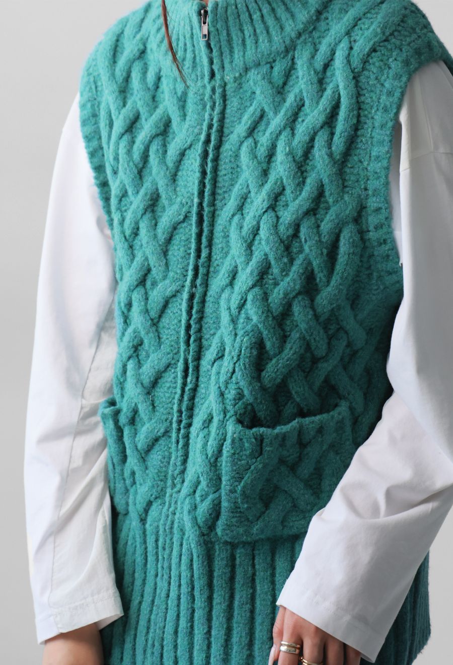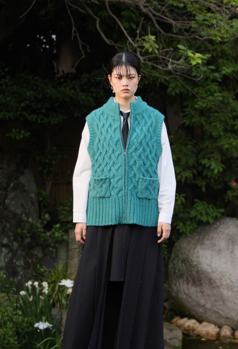 立体的な籠編み風デザインが印象的な、レイヤードコーデに映えるユニセックス仕様のニットベストです。