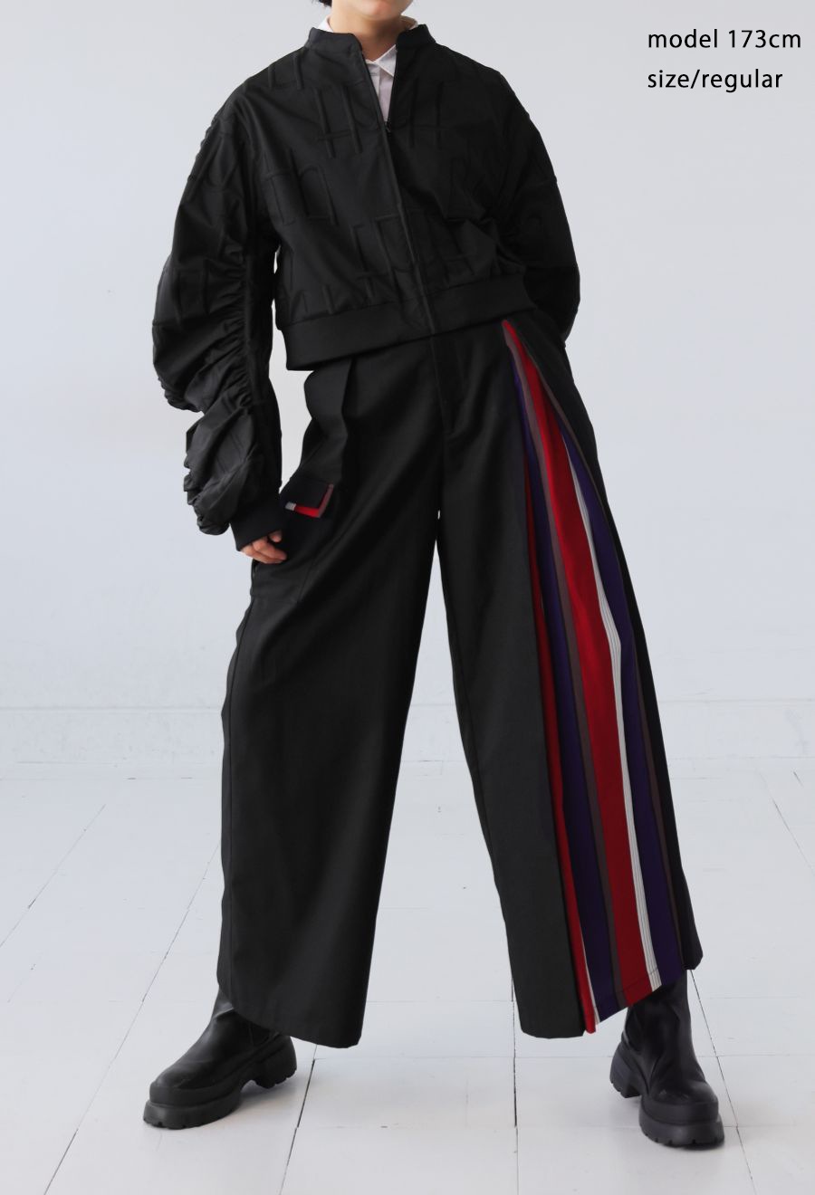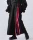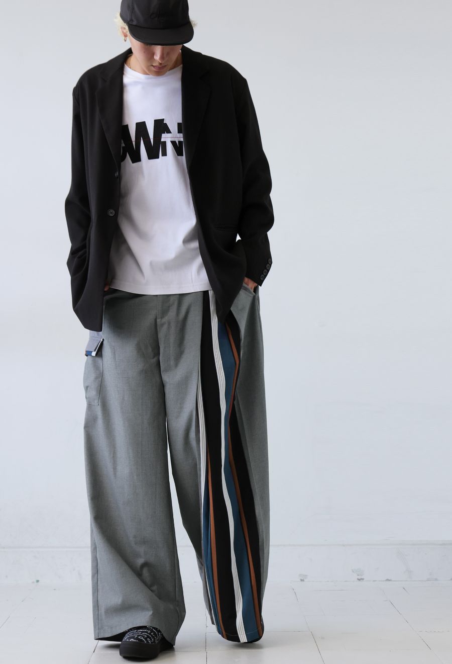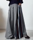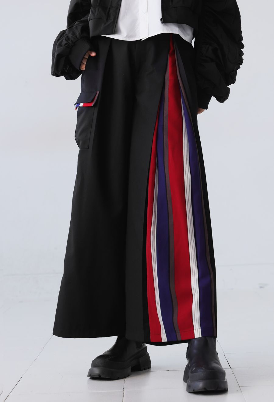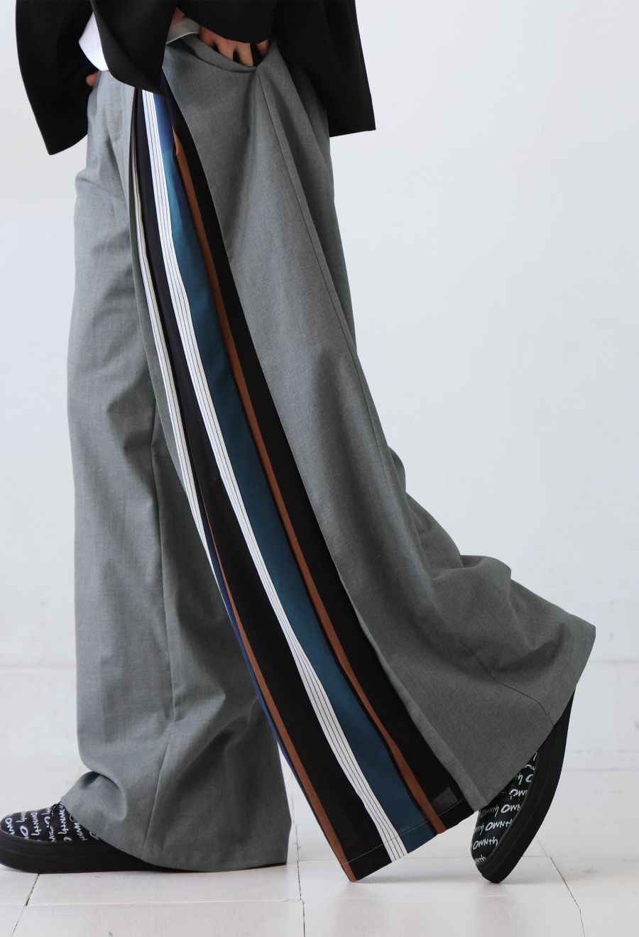 左サイドに大胆なストライプ柄を切り替えたアシンメトリーデザインが目を引くワイドパンツです。