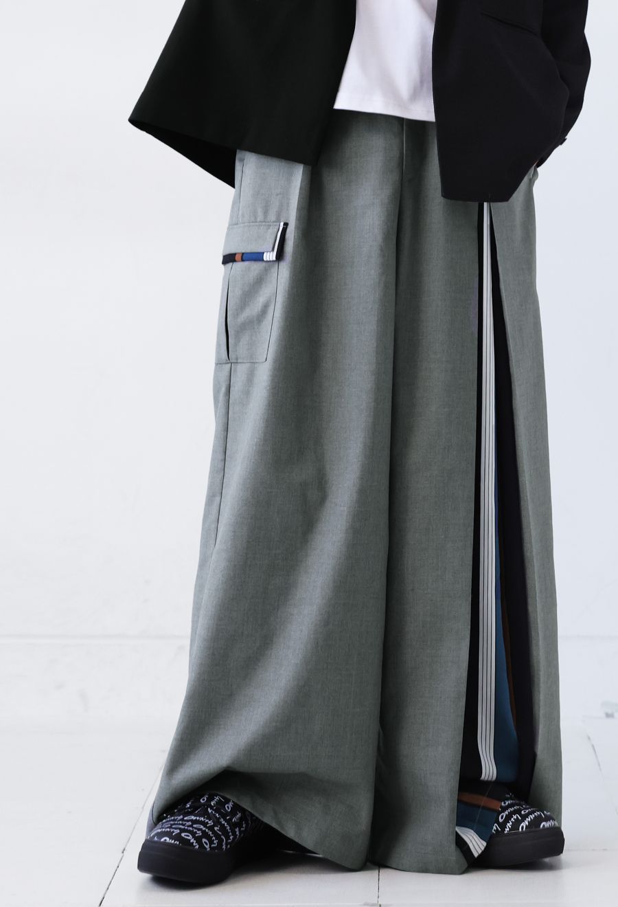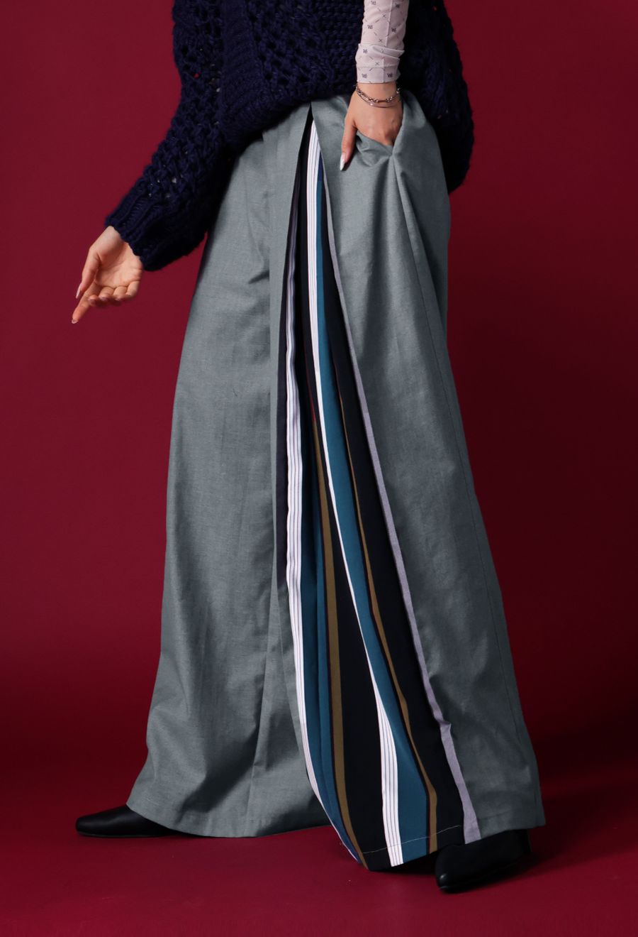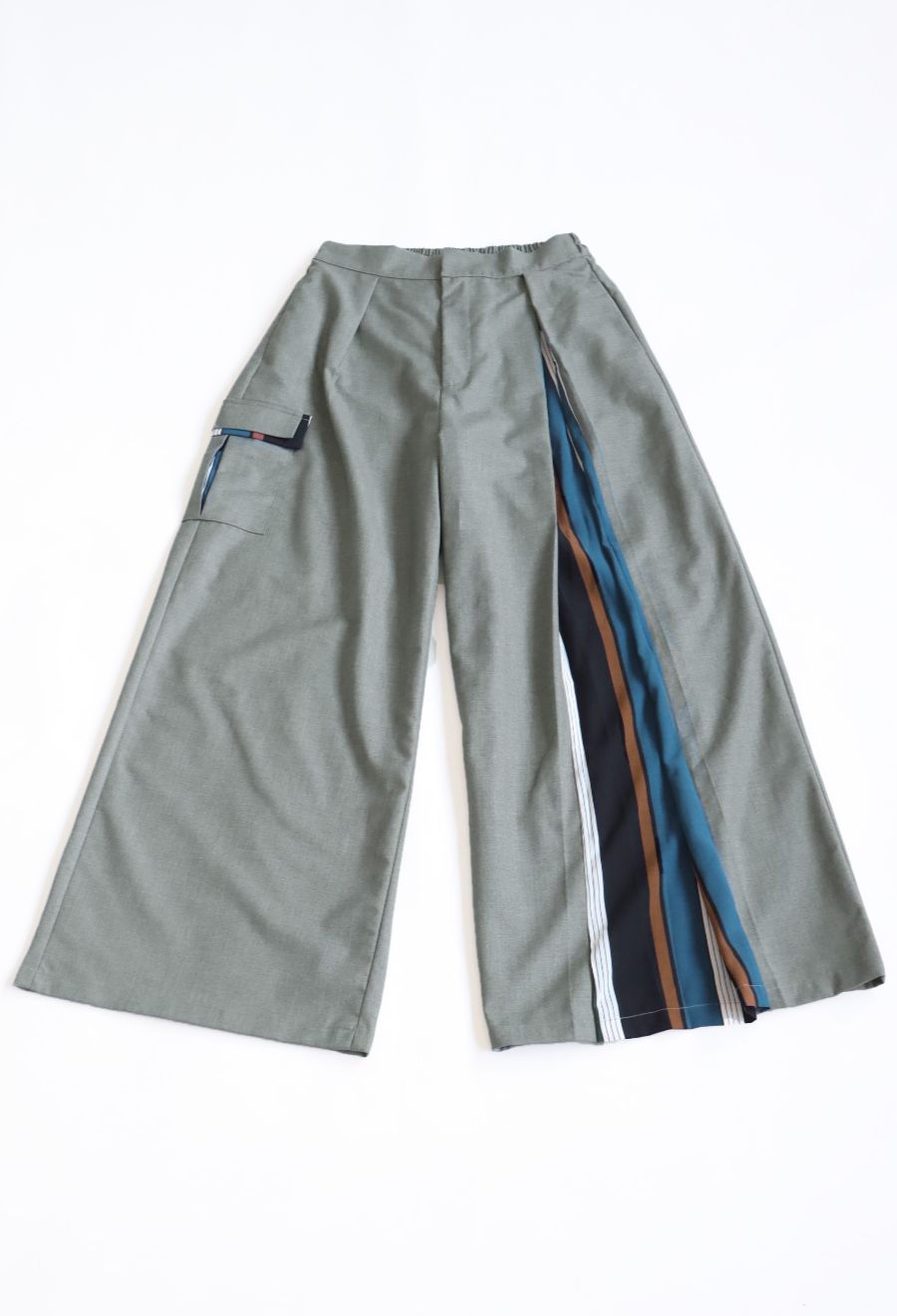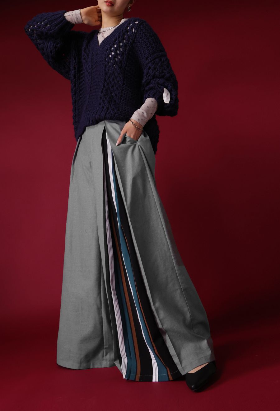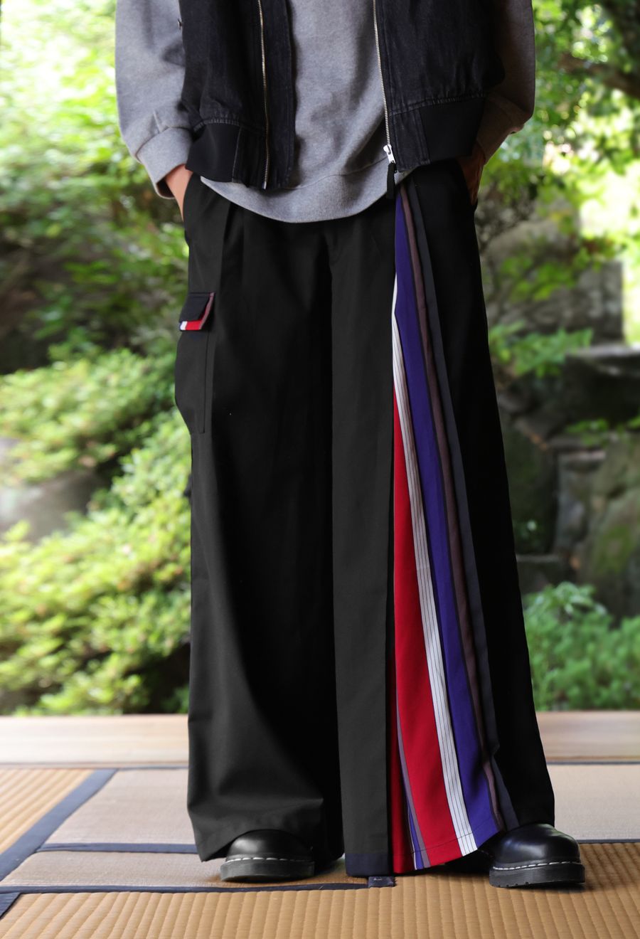 左サイドに大胆なストライプ柄を切り替えたアシンメトリーデザインが目を引くワイドパンツです。