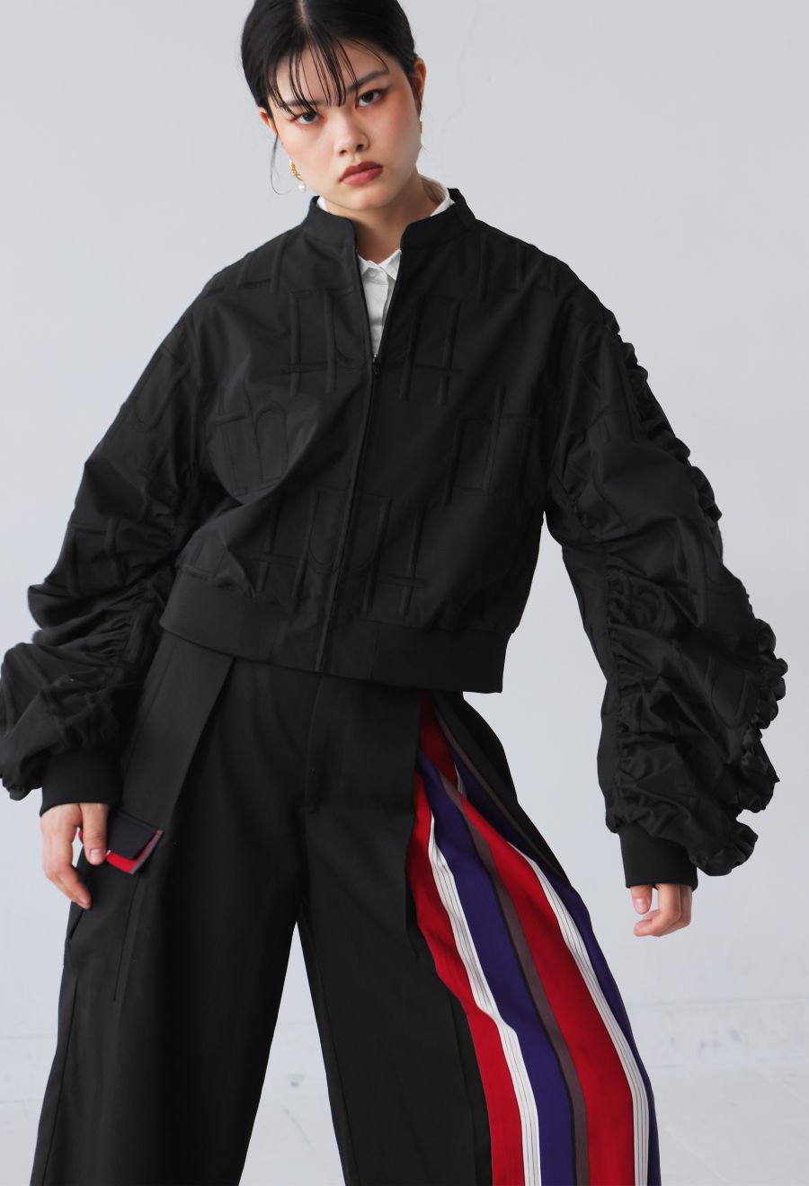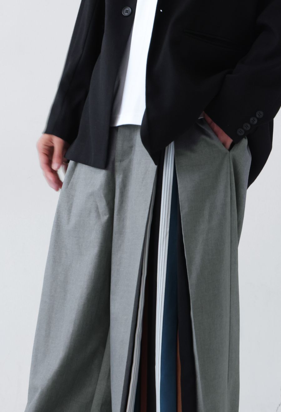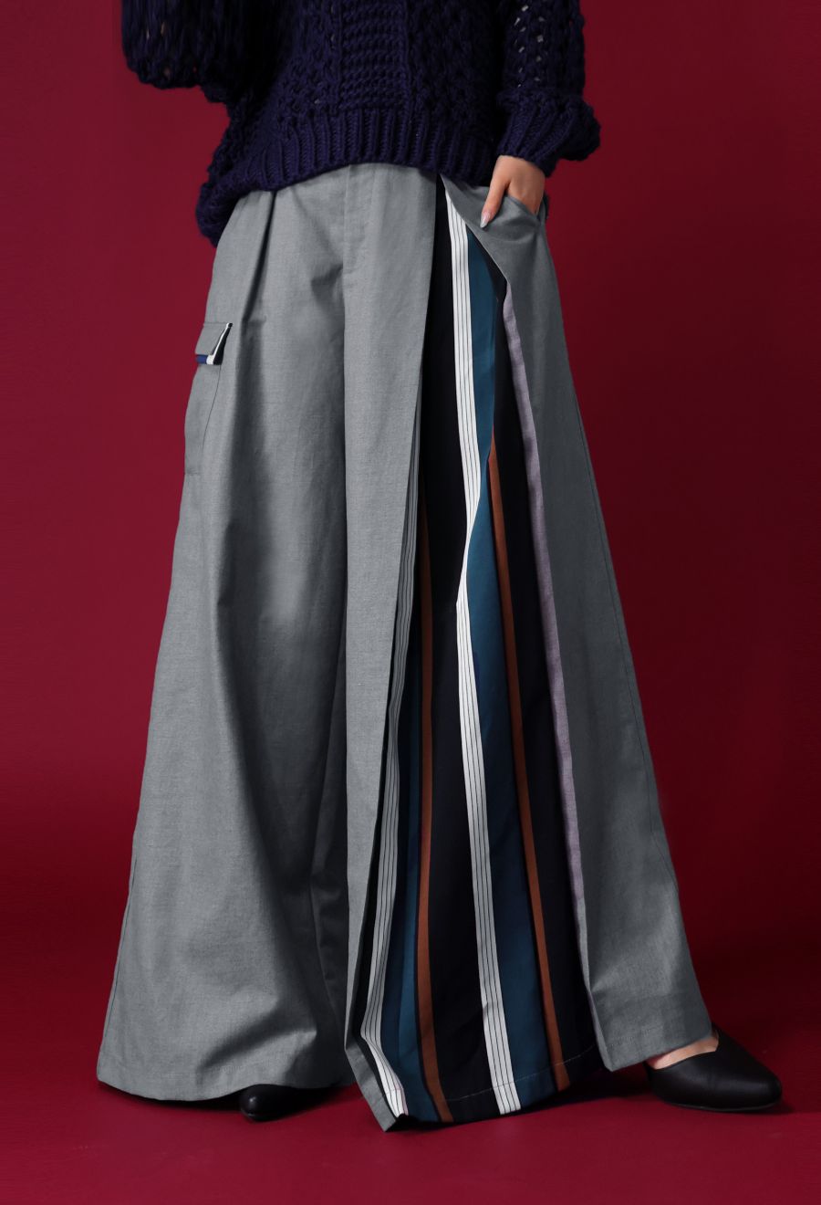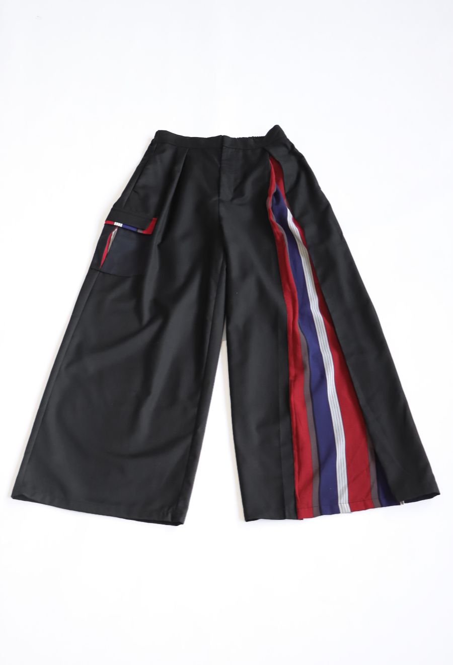 左サイドに大胆なストライプ柄を切り替えたアシンメトリーデザインが目を引くワイドパンツです。