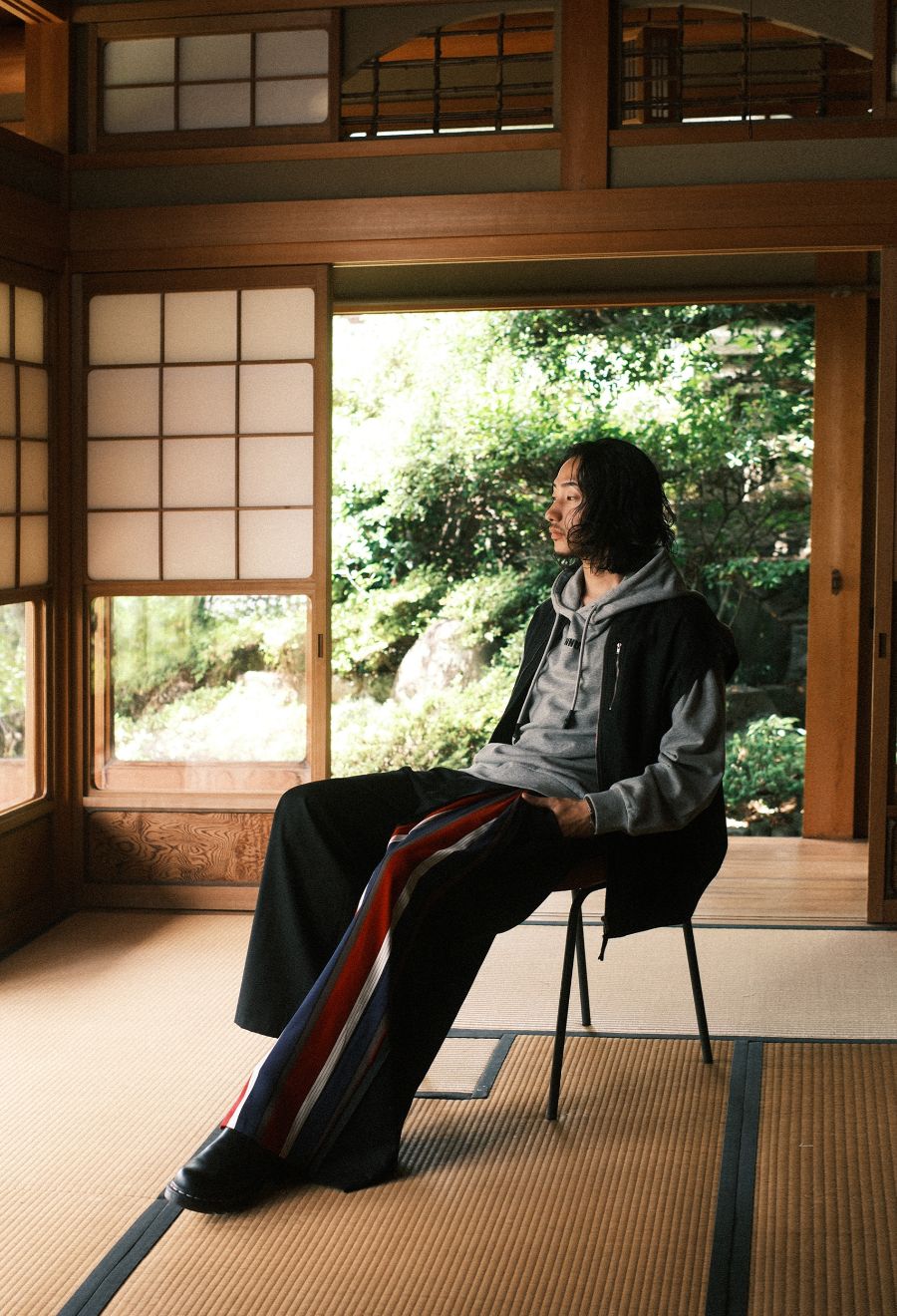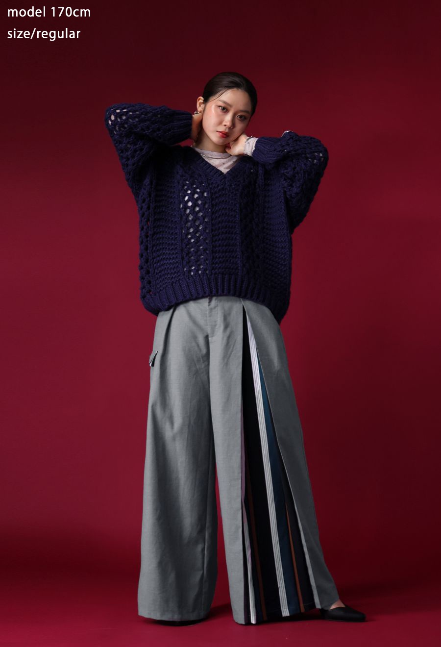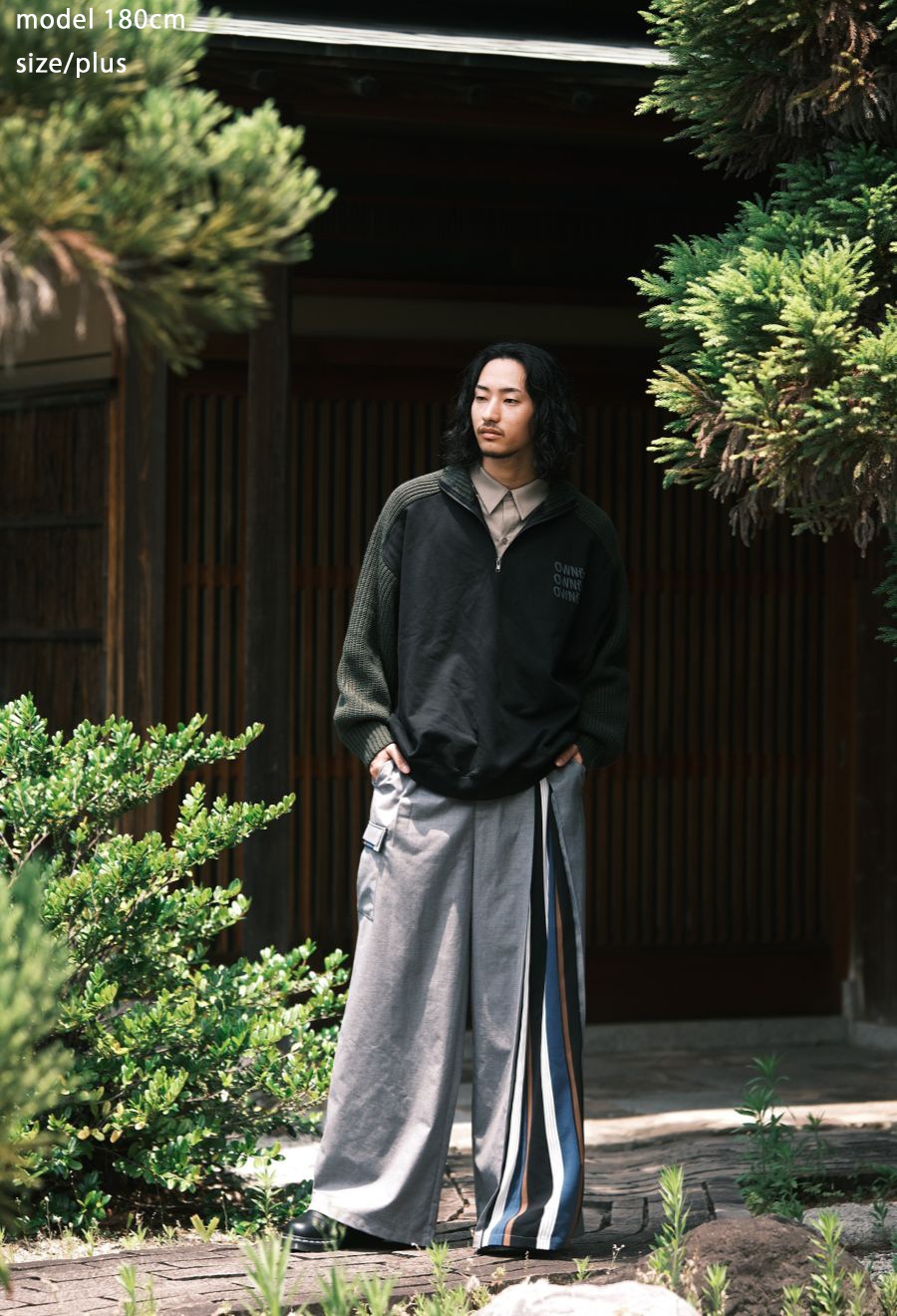 切替部分のストライプは、落ち着きの中にアクセントを効かせた配色で、コーディネートを一層引き立てます。