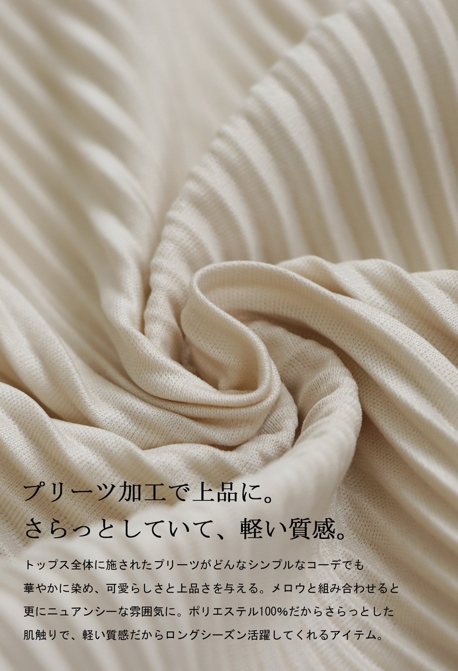 身頃全体に施された繊細なプリーツが、シンプルながらも動きのある印象に。