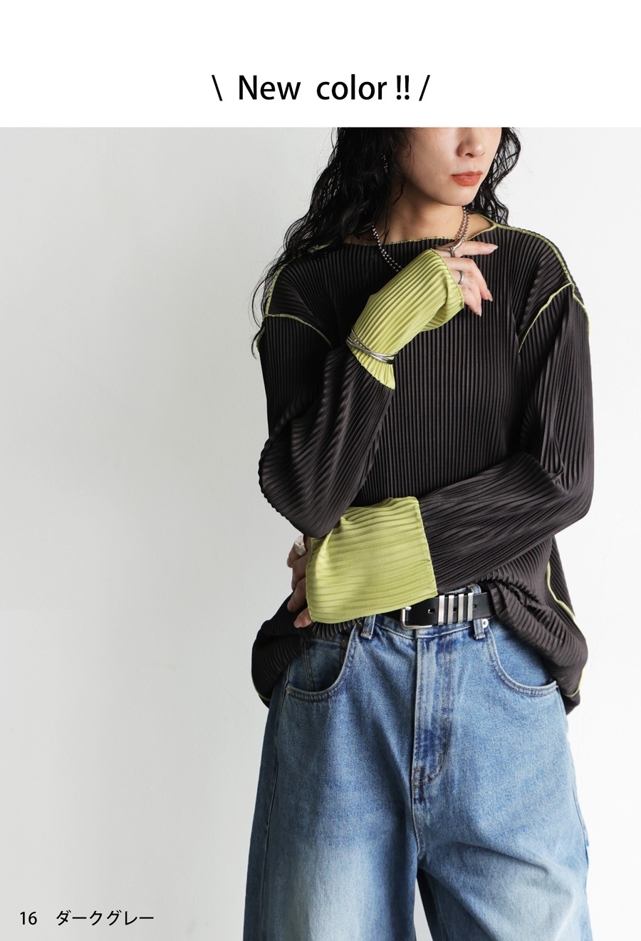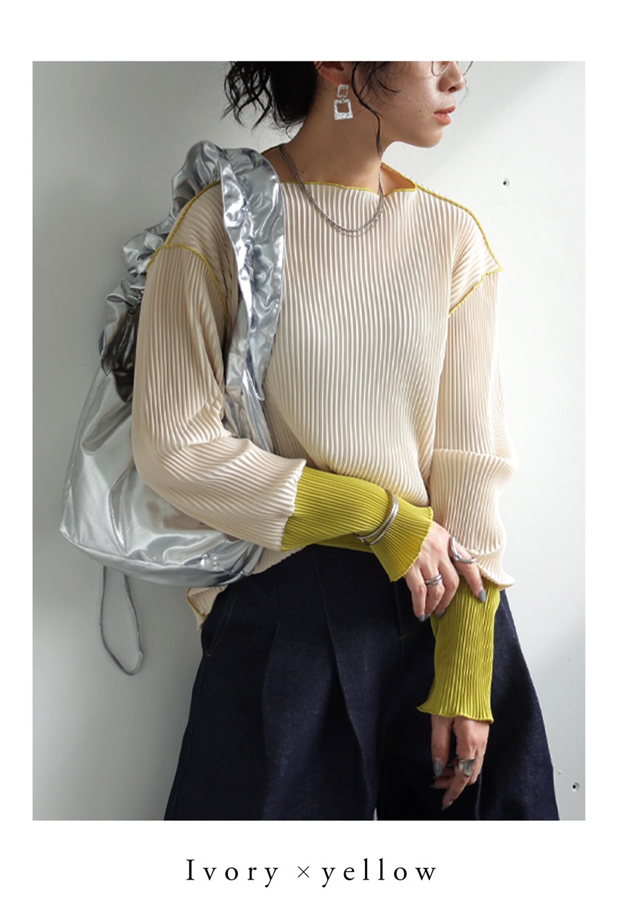 ニュアンス配色が目を引く、プリーツ加工の長袖トップスです。