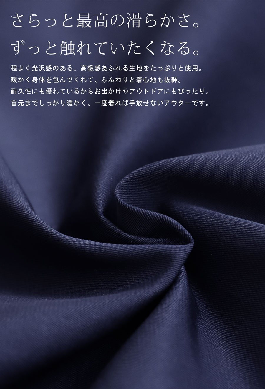 ネックラインは高めのスタンドネック仕様で、首元までしっかり防寒可能。