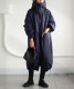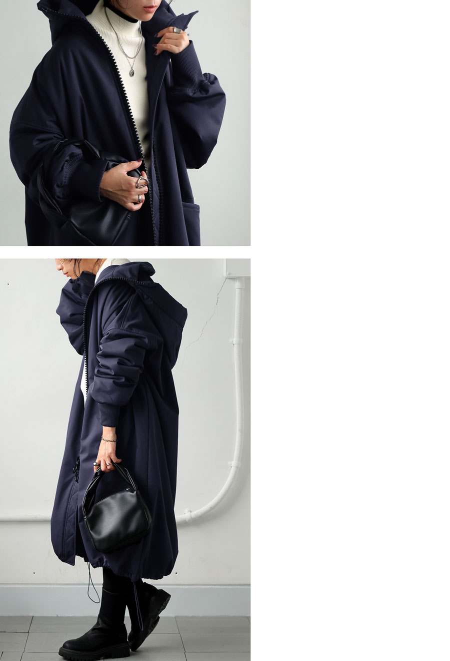 柄は無地、形状はドロスト付きの立体的なシルエットで、モード感のある着こなしに。