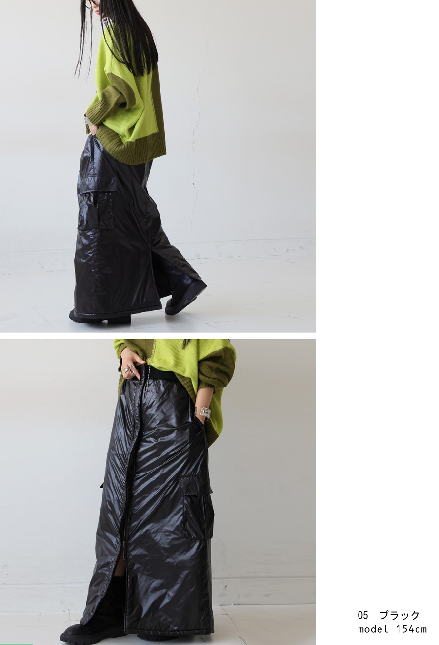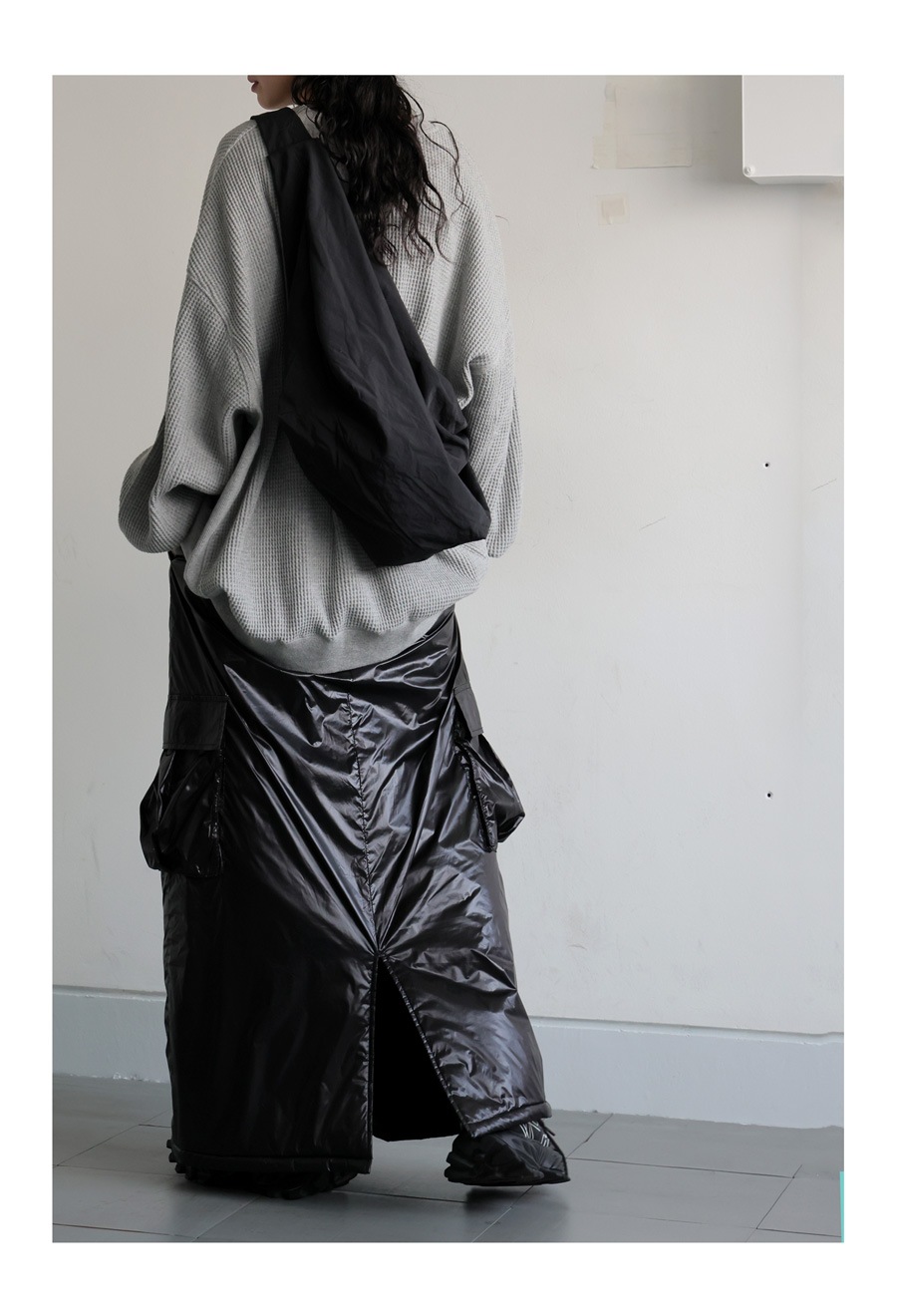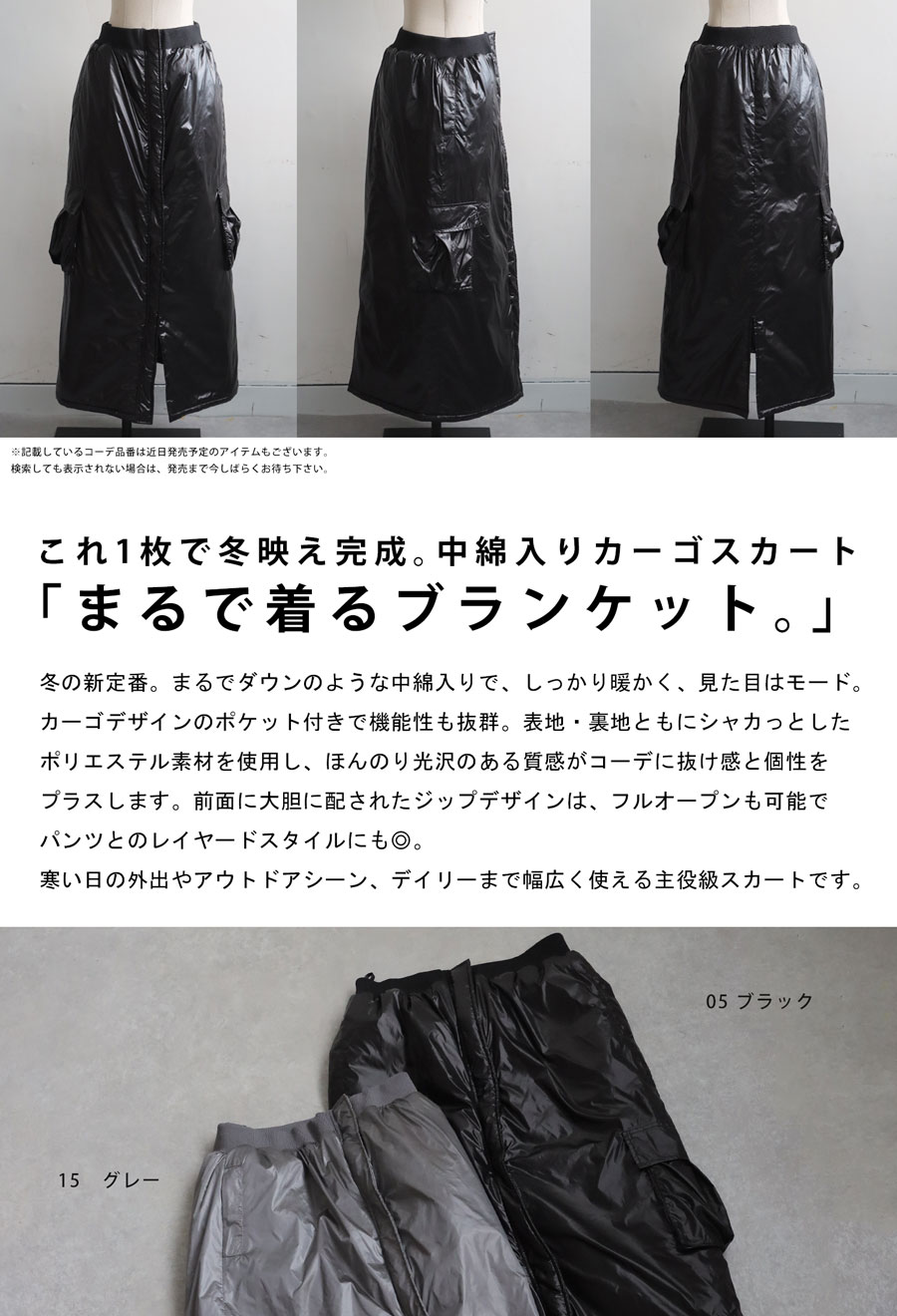 中綿入りで防寒性と防風性に優れたロングスカートです。