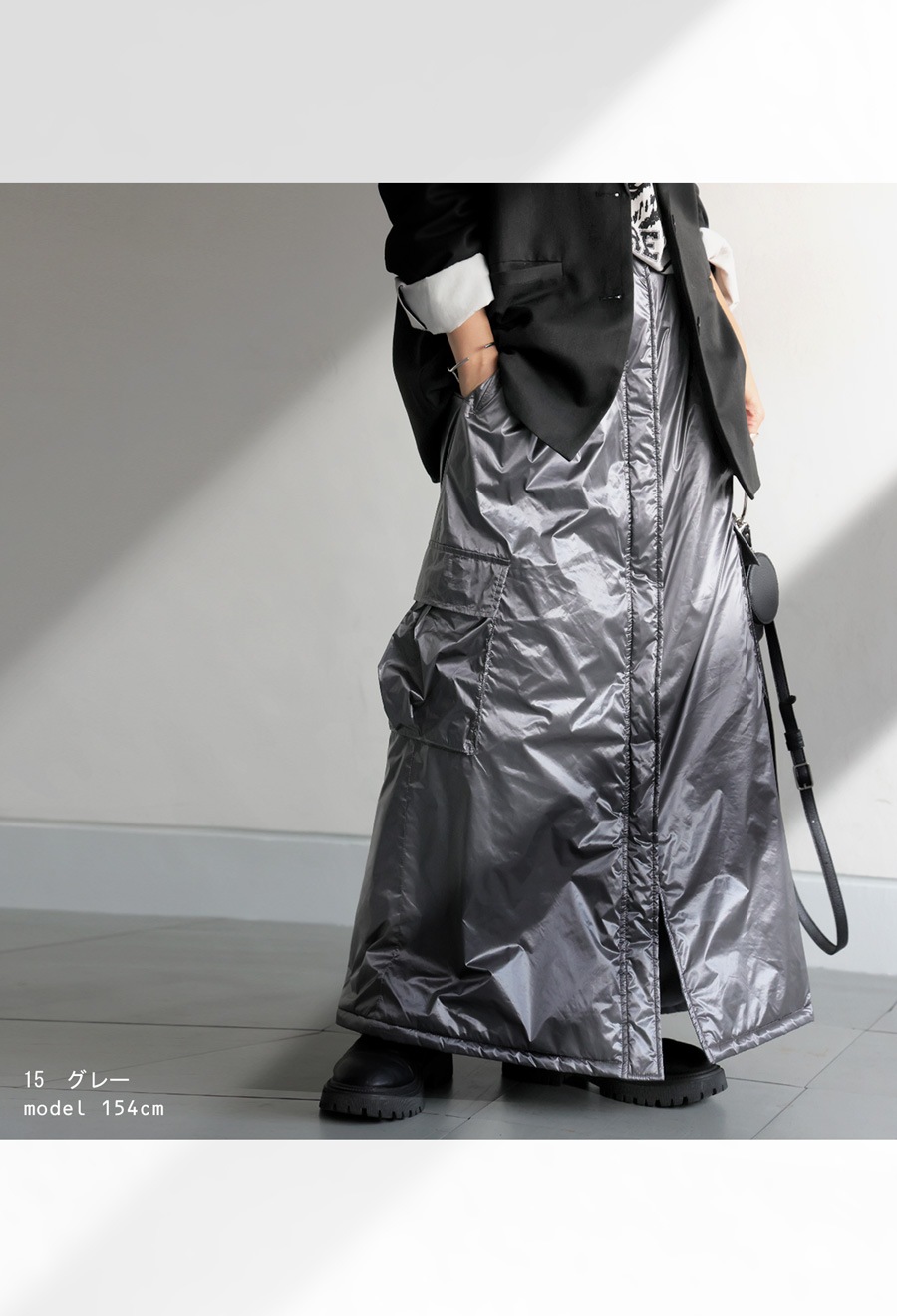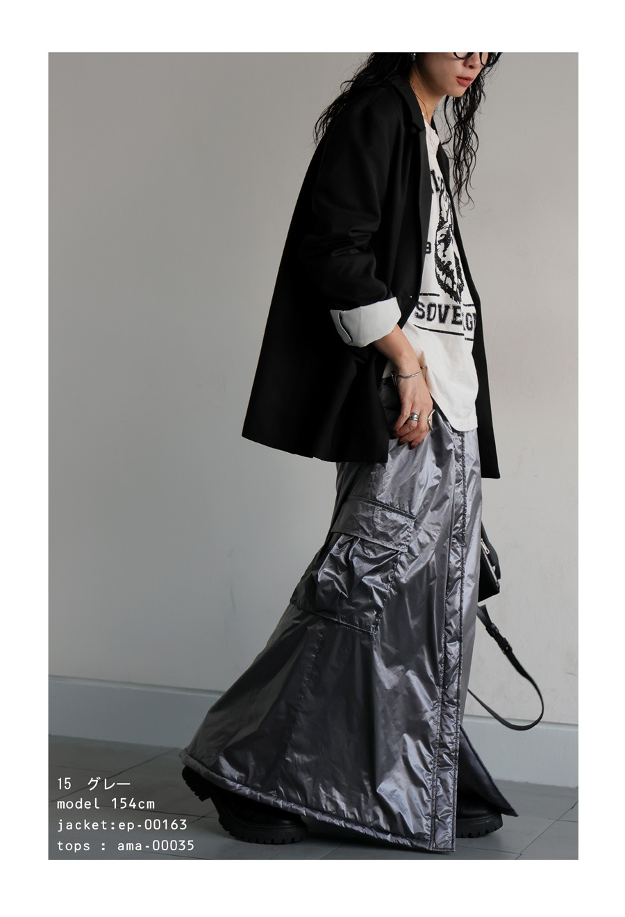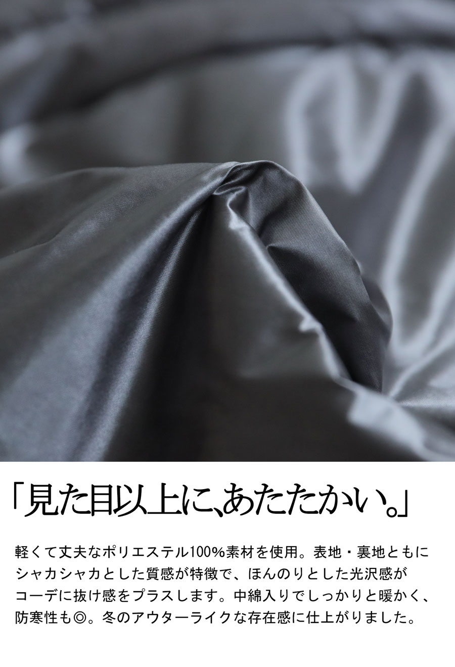 メタリックな光沢感のある表地が個性派な印象を放ち、モードにもカジュアルにもマッチする一枚。