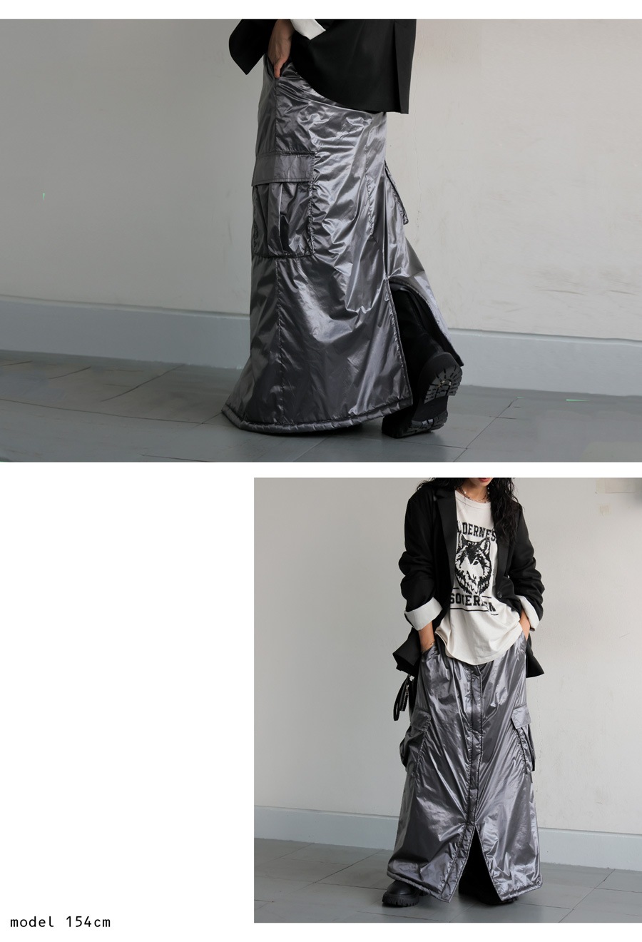 無地のシンプルさとメタリックな質感が融合し、きれいめにもラフにも着こなせます。