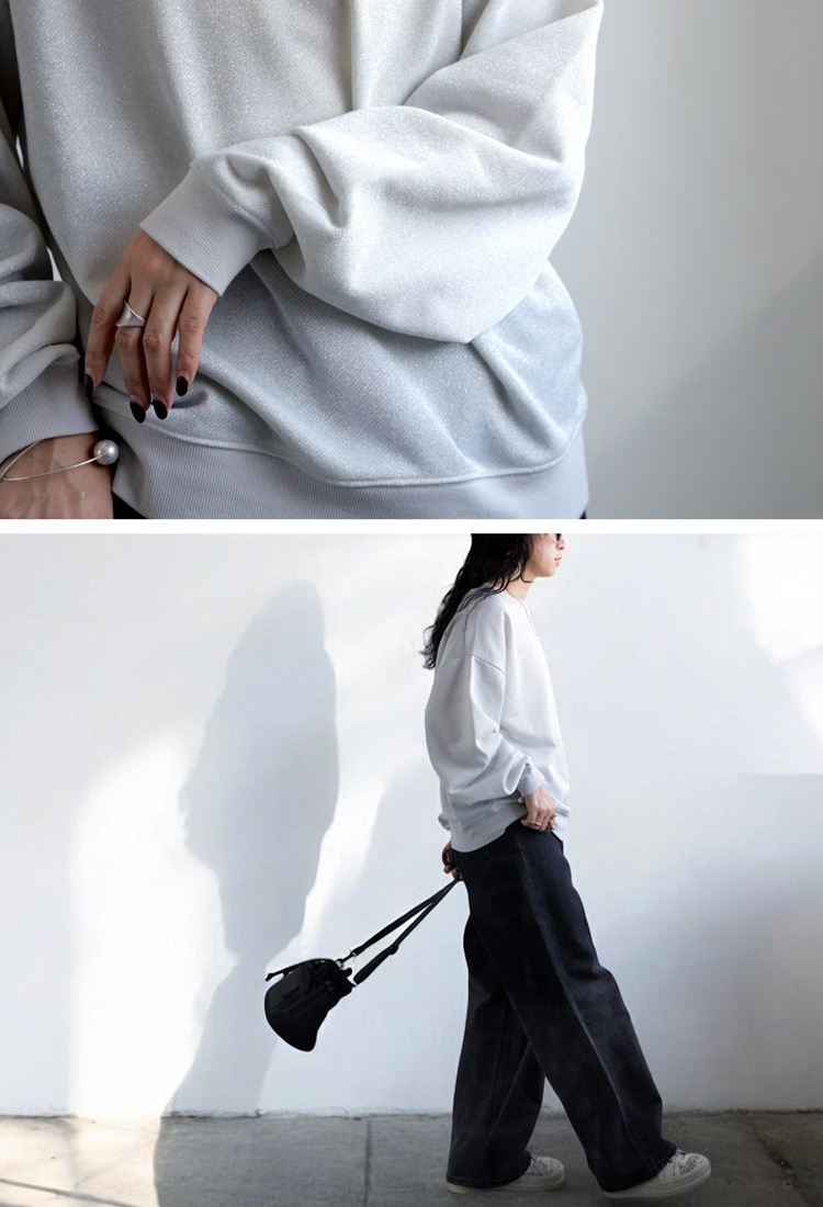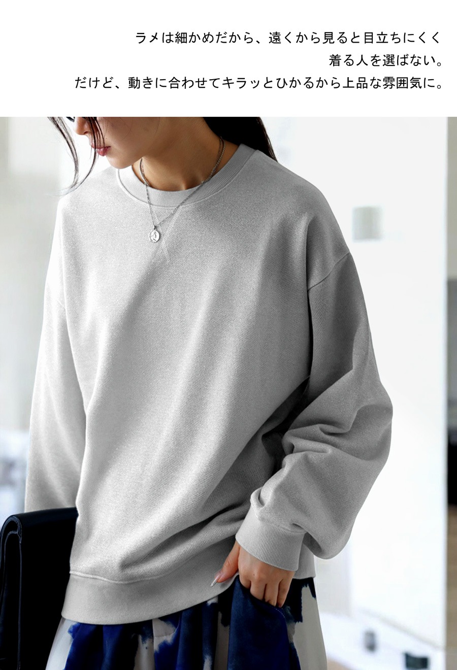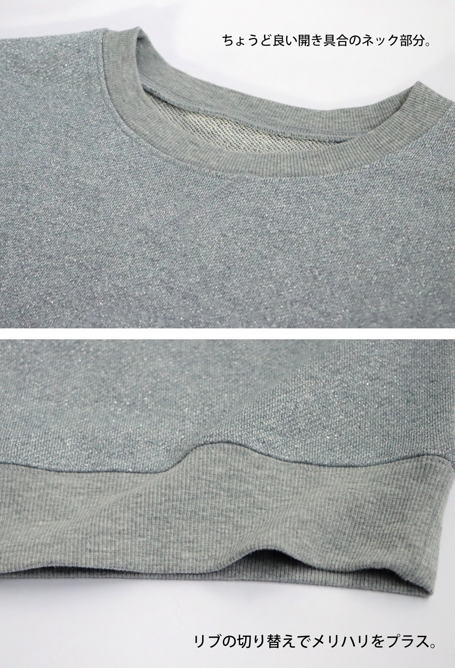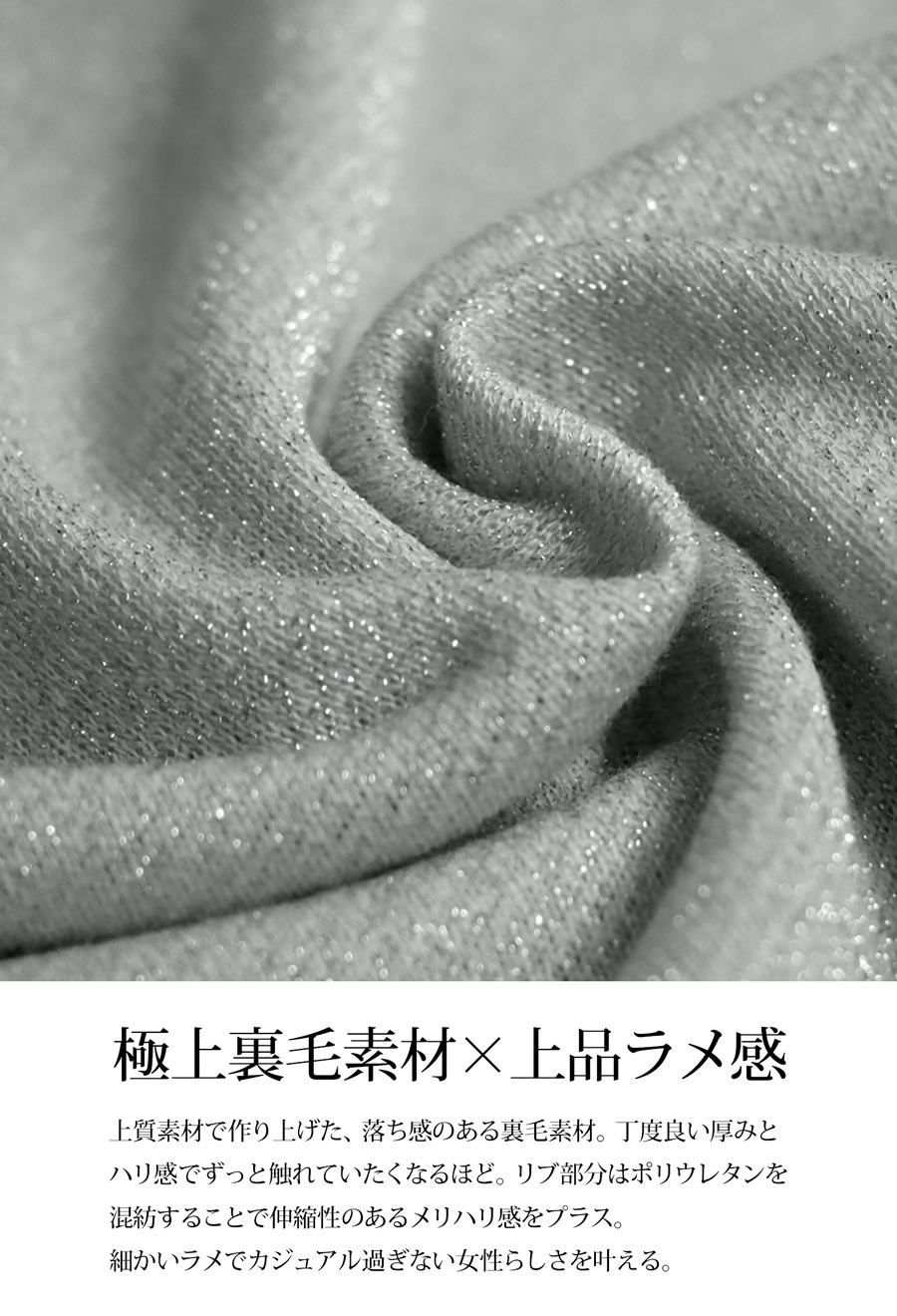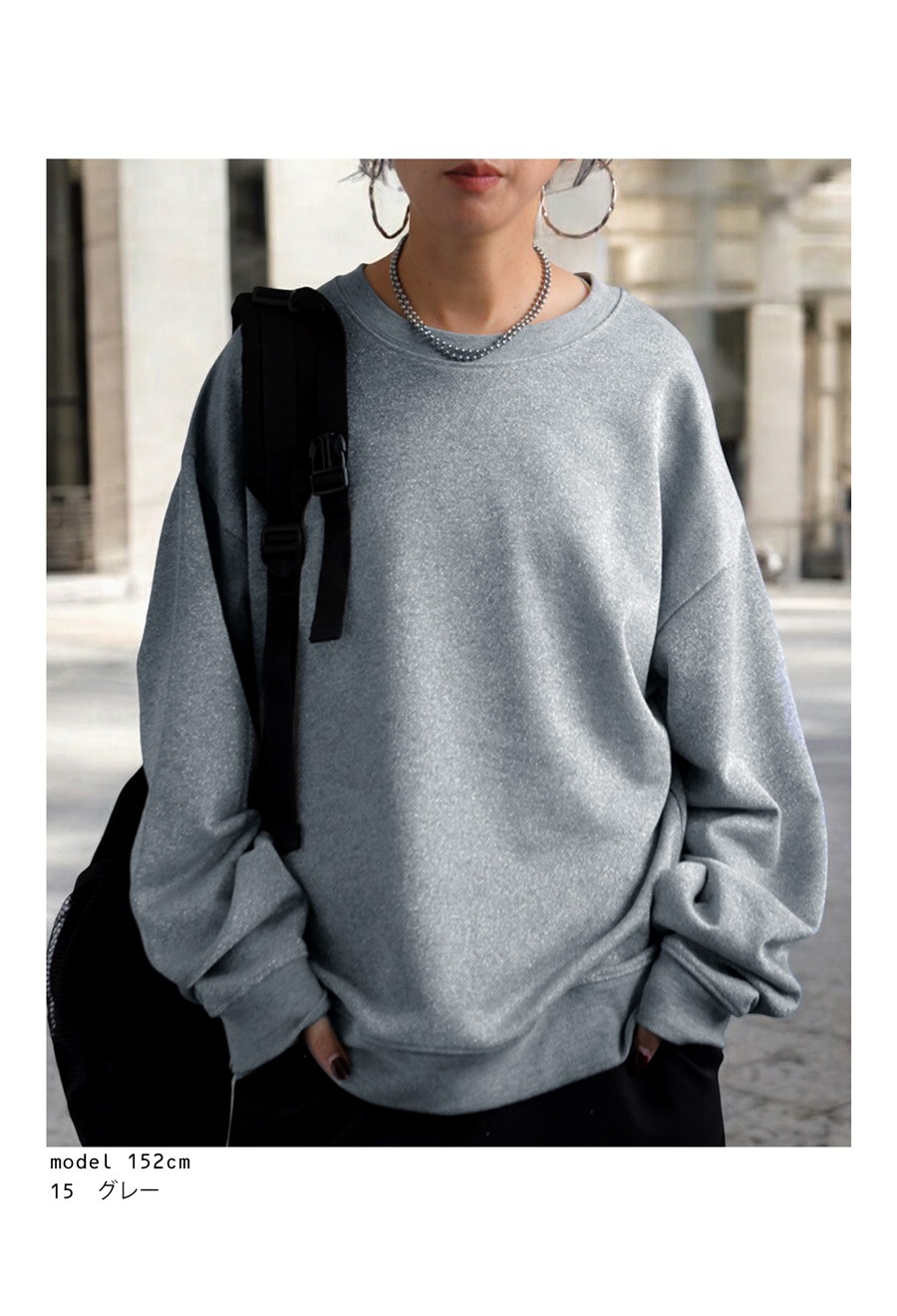 動きに合わせてキラッと光るラメが上品な印象の裏毛トップス。