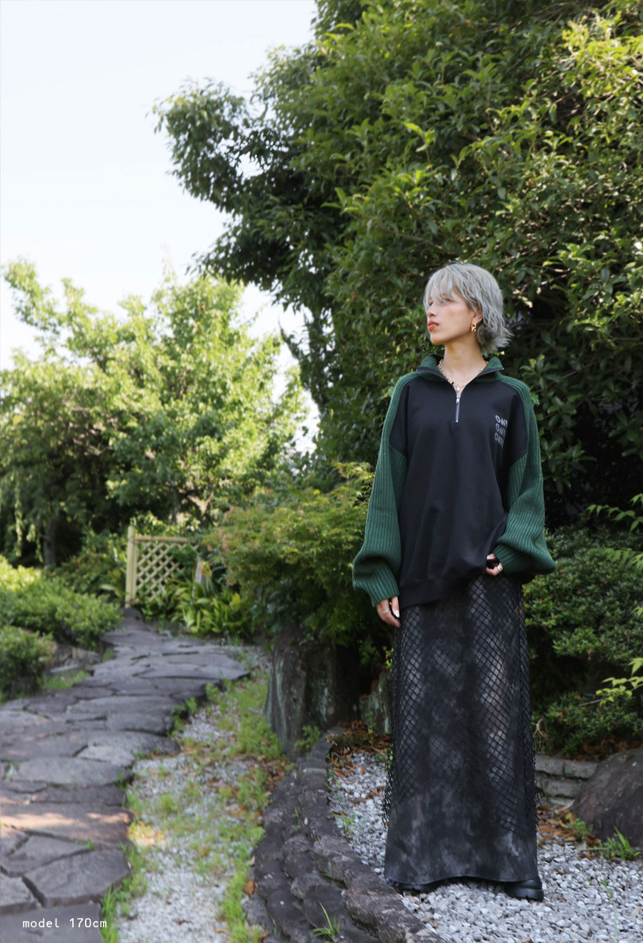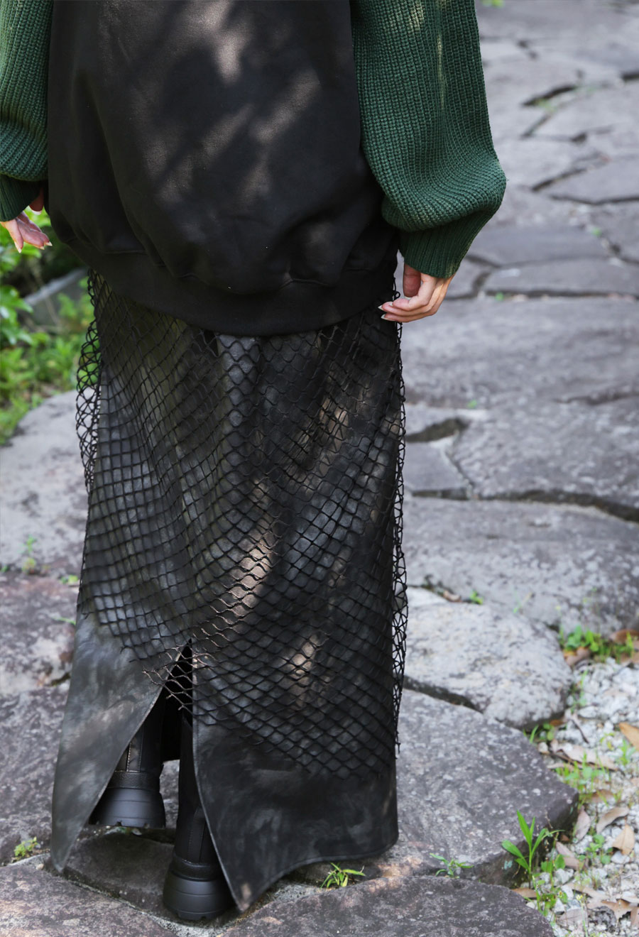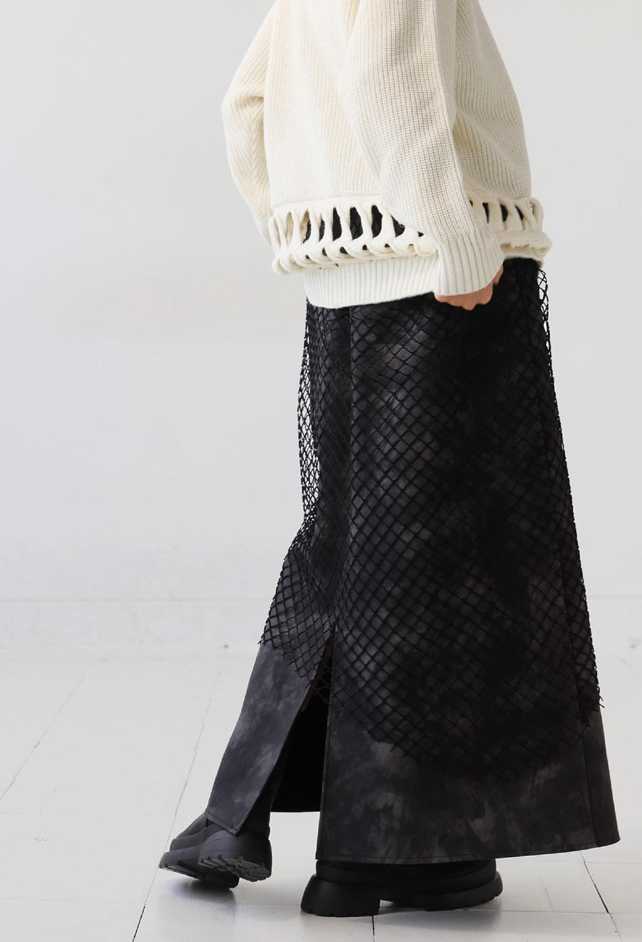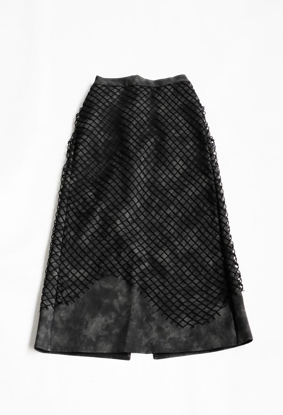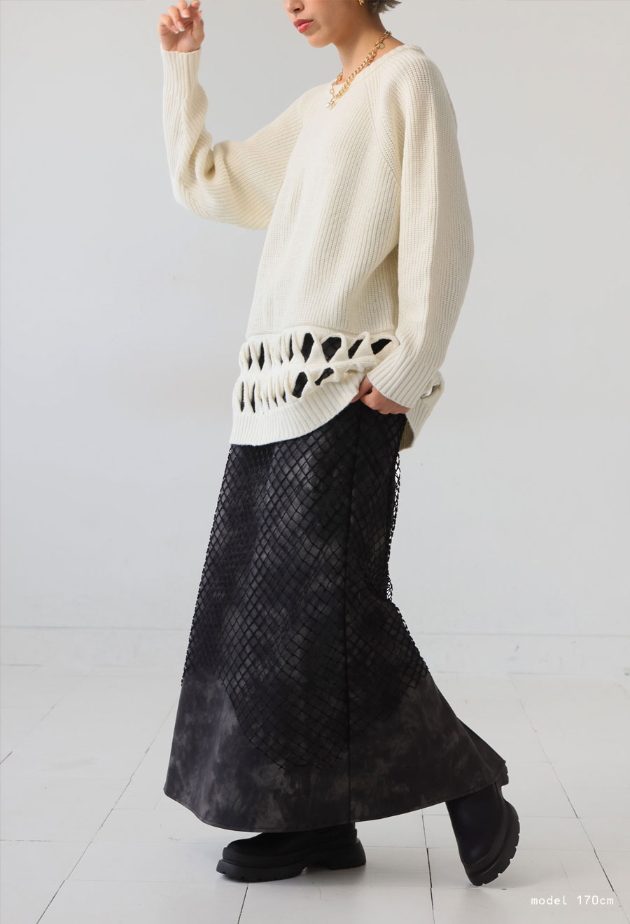 印象的なメッシュ素材を重ねた、存在感あるレイヤードスカートです。