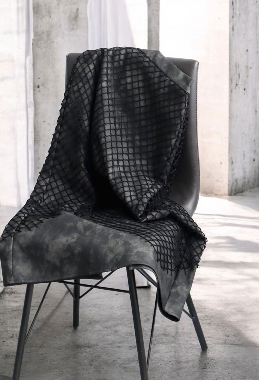 柄は落ち着いたモノトーンのタイダイで、レザーのマットな質感と陰影のあるメッシュが洗練された印象を演出します。
