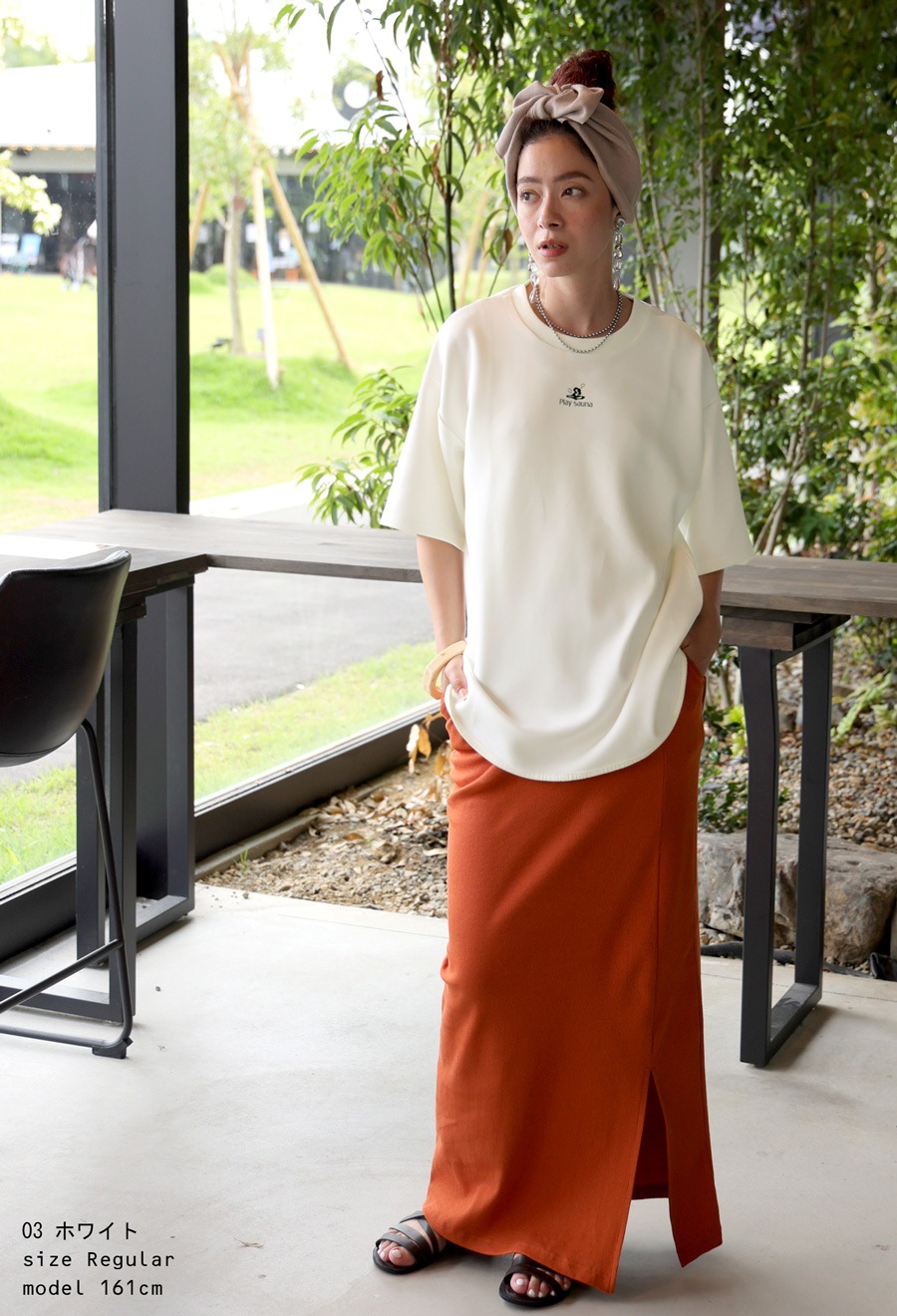 オリジナルロゴがさりげなく前後に入った、大人のこなれ感漂うTシャツ。