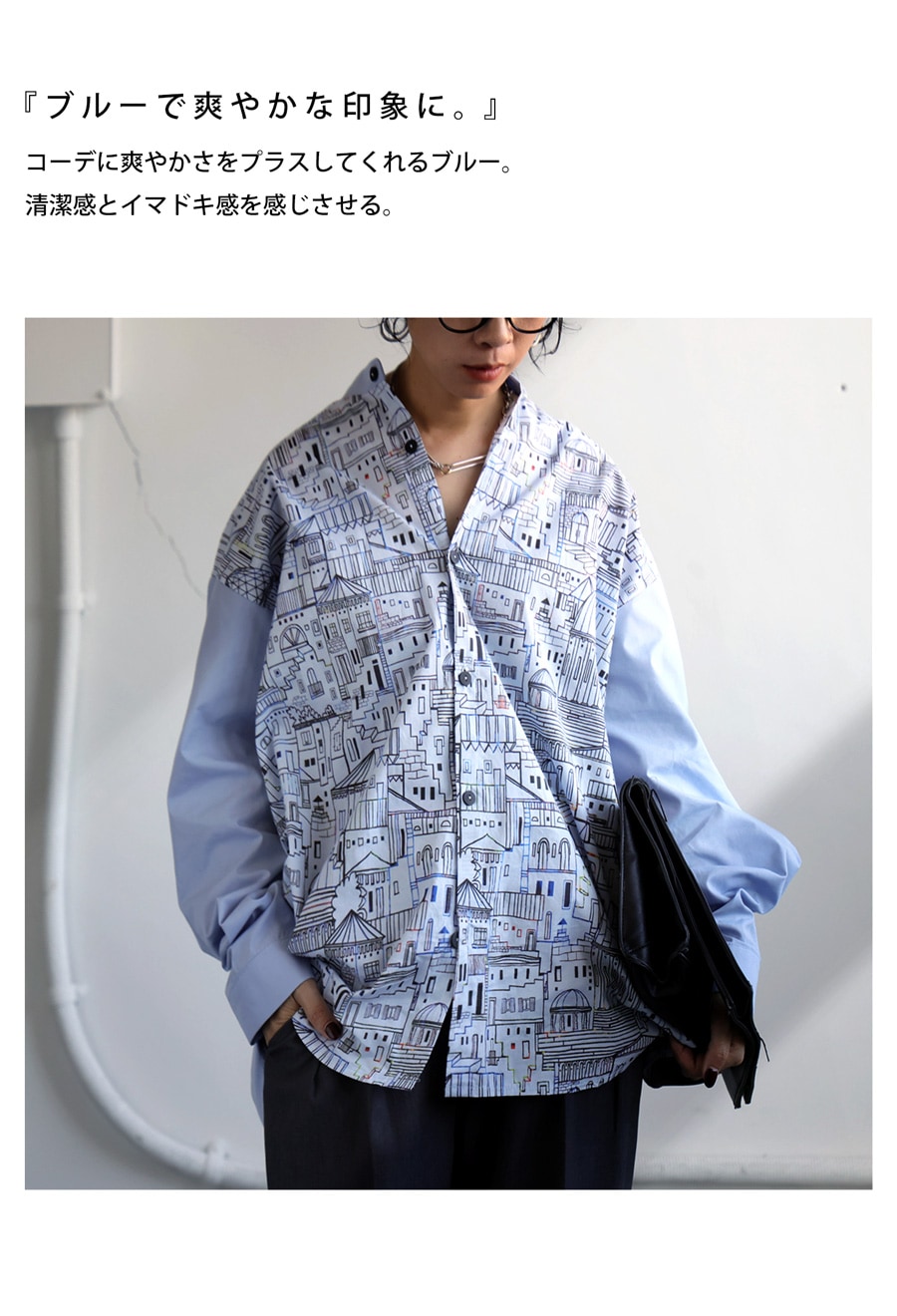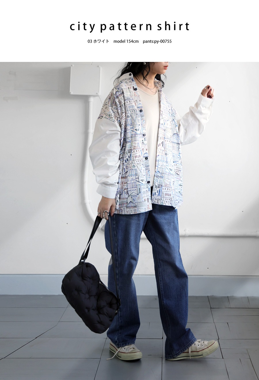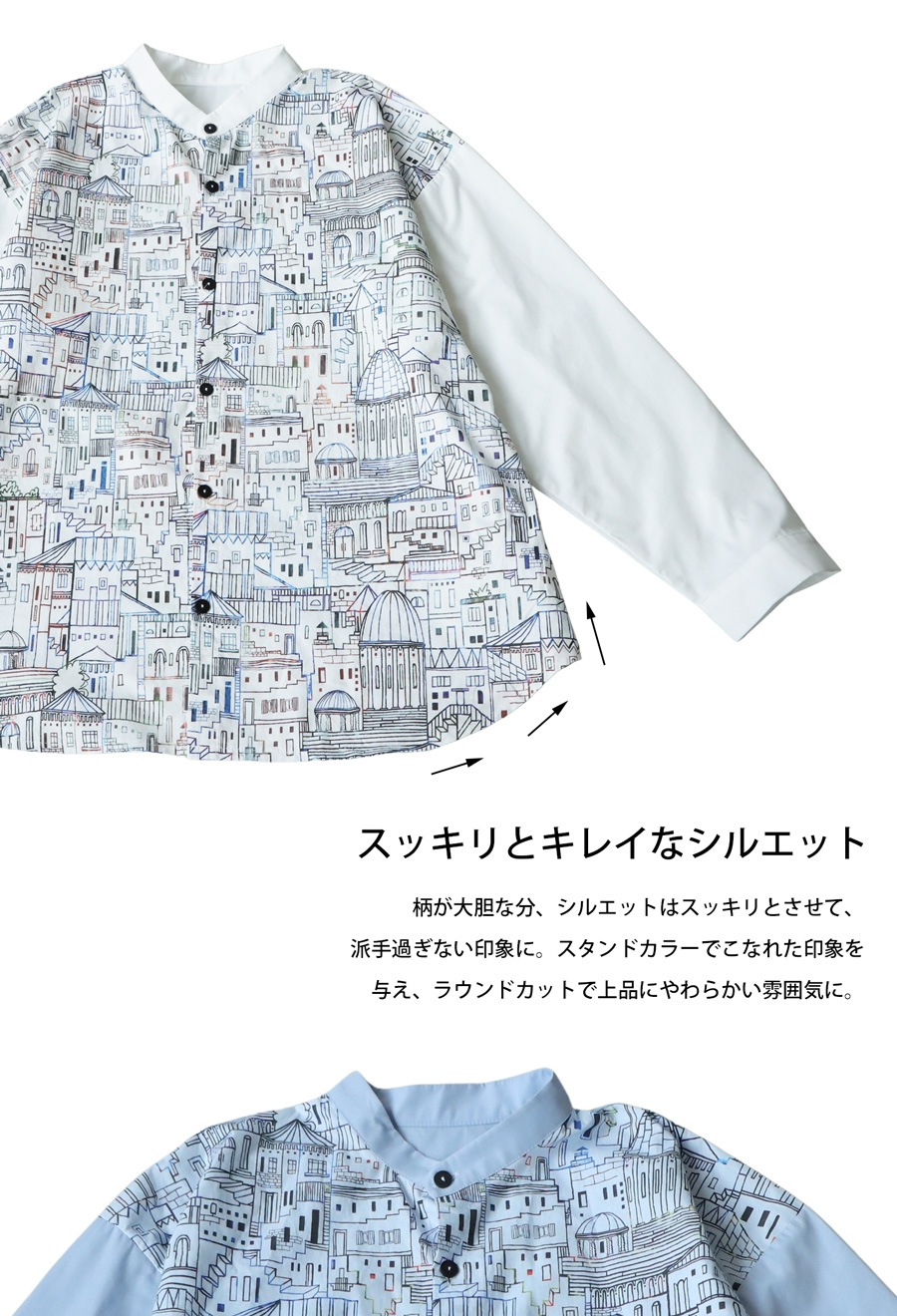 【検索ワード】街柄シャツ シャツ レディース トップス 長袖 羽織り スタンドカラー バンドカラー スタンドネック プリント イラスト 絵 ビル 家 街並み 街柄 柄シャツ 柄 無地 切り替え ドッキング 前開き ボタン 綿混 ゆったり シンプル きれいめ 高級感 個性派 モード ハイセンス 綿 コットン 体型カバー 細見え 着痩せ 大きめ 大きいサイズ デザイントップス ユニセックス antiqua treecafe アンティカ ツリーカフェ 大人 おしゃれ 10代 20代 30代 40代 50代 60代 春 秋 冬 お洒落 カジュアル かわいい かっこいい あんてぃか
