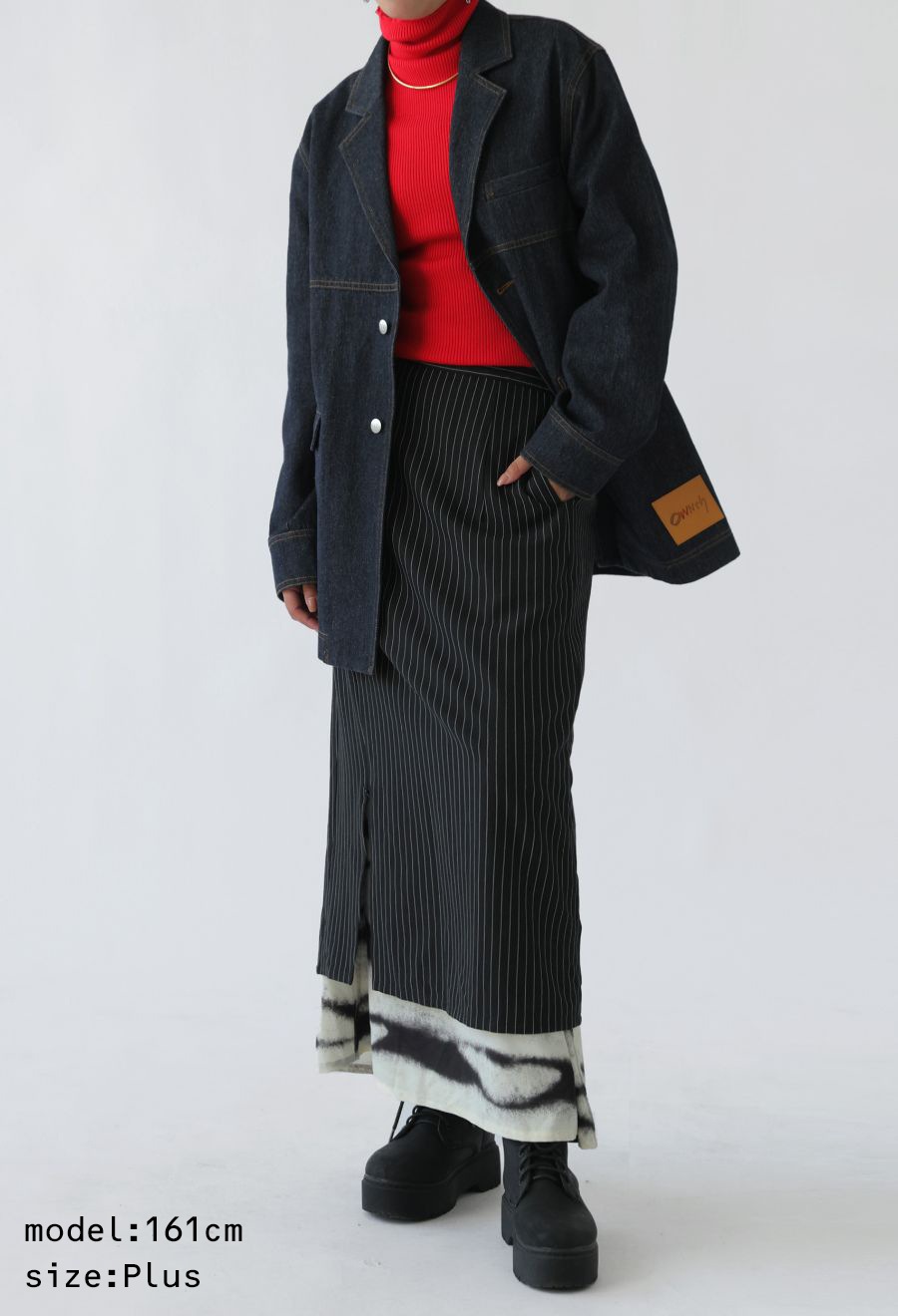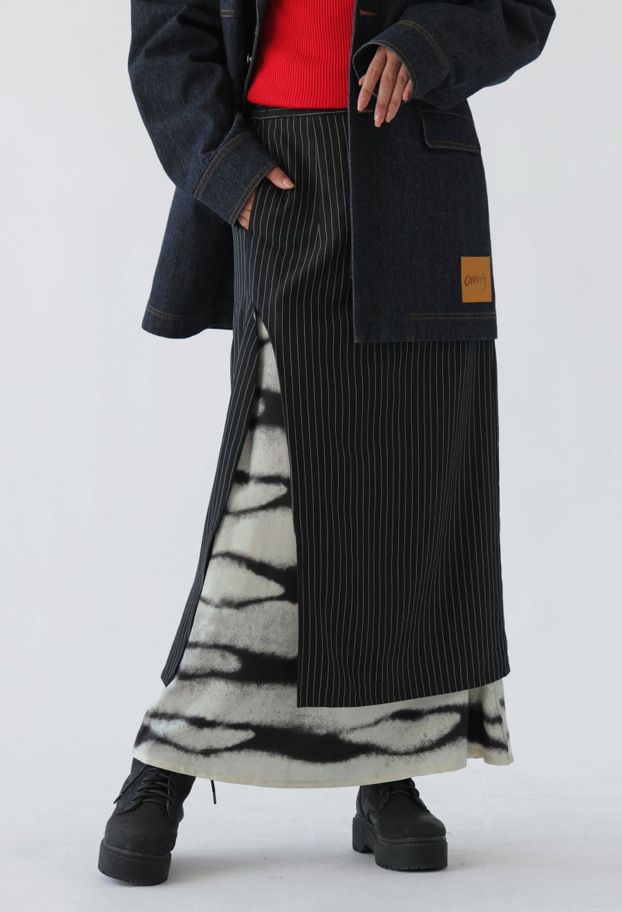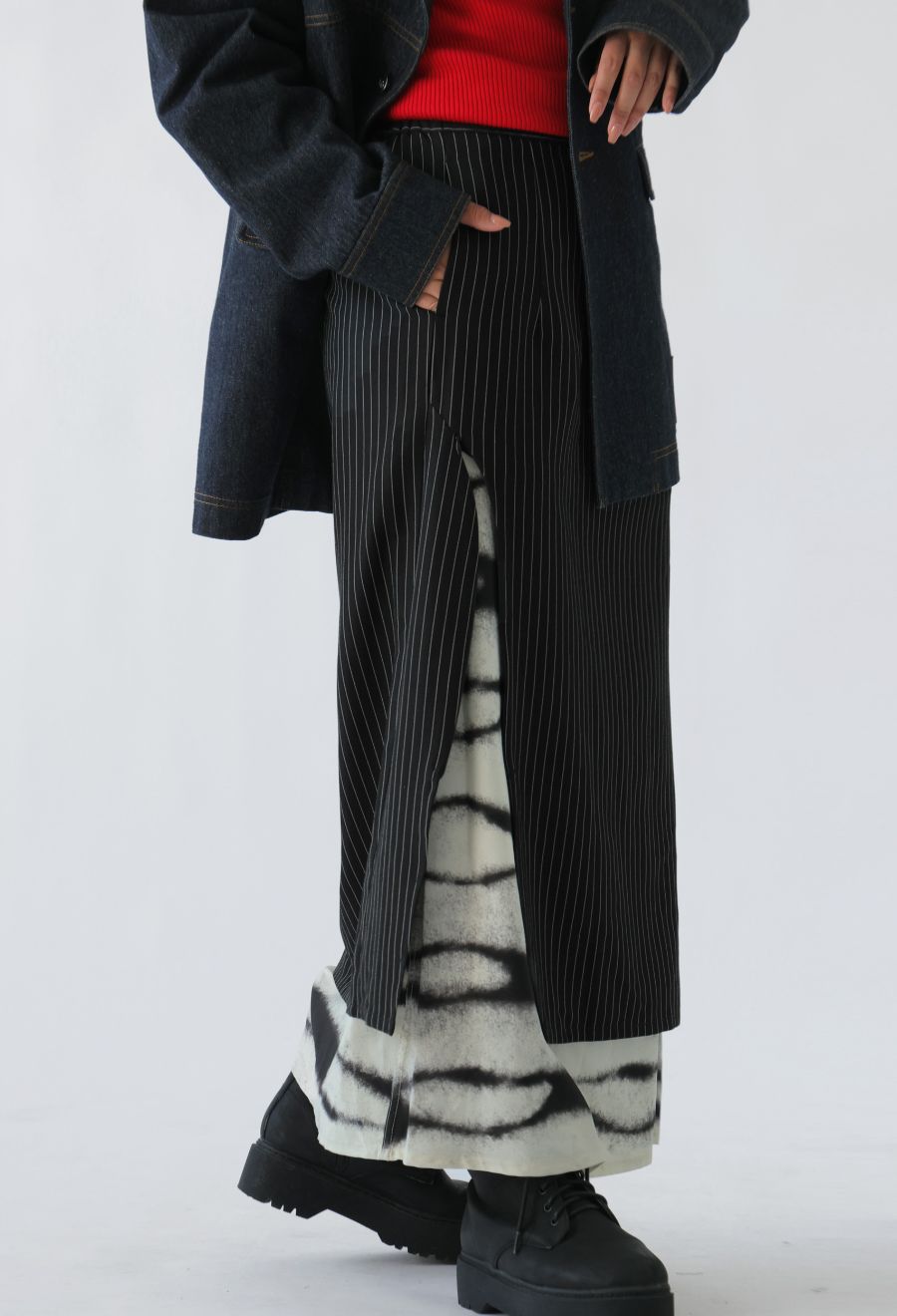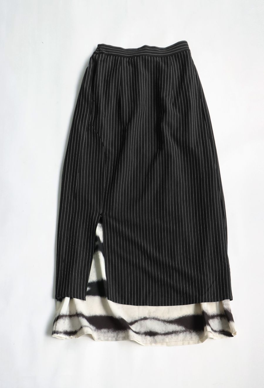 1WAYではピンストライプスカートとして、2WAYではインナーのグラデーション柄スカートとして、3WAYでは重ねてレイヤードスタイルとして着用可能です。