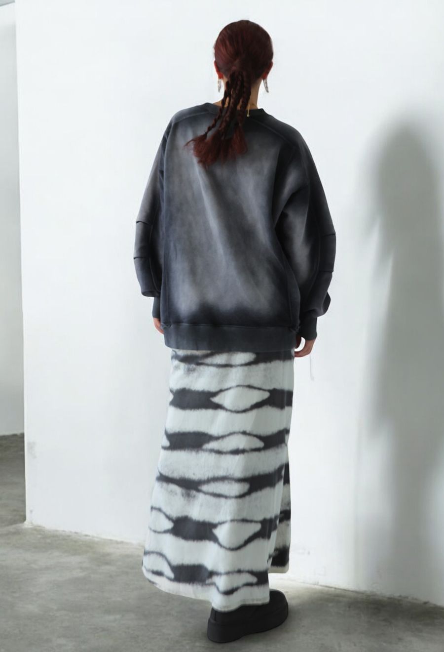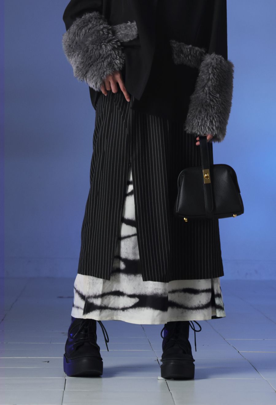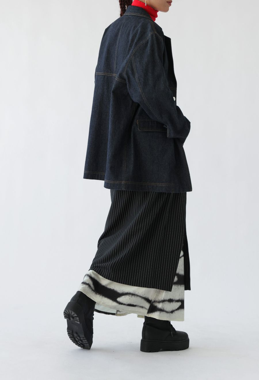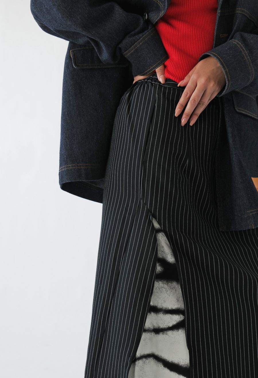 1WAYではピンストライプスカートとして、2WAYではインナーのグラデーション柄スカートとして、3WAYでは重ねてレイヤードスタイルとして着用可能です。
