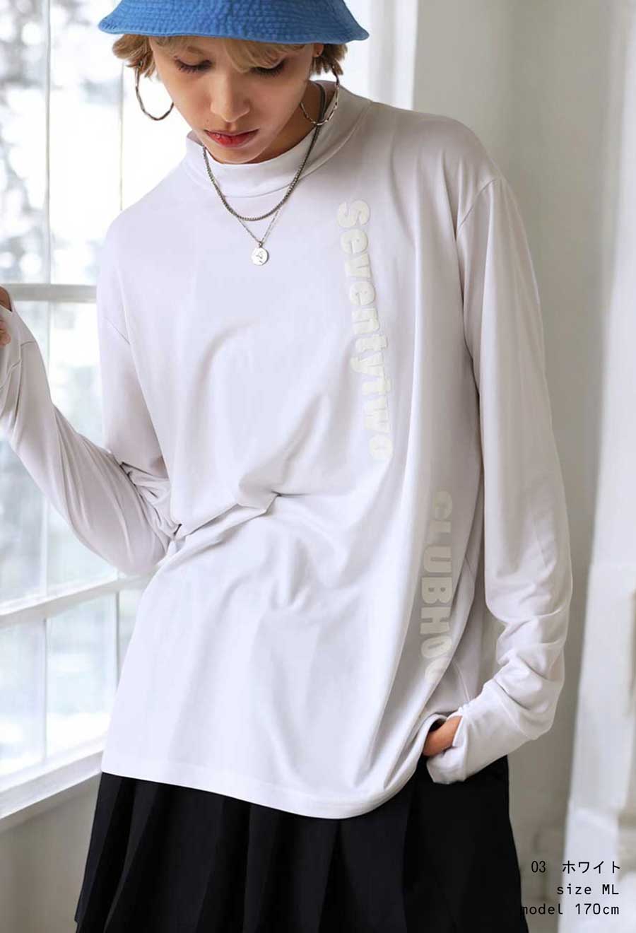 袖、フロント、サイドのロゴデザインがお洒落なモックネックロングT。