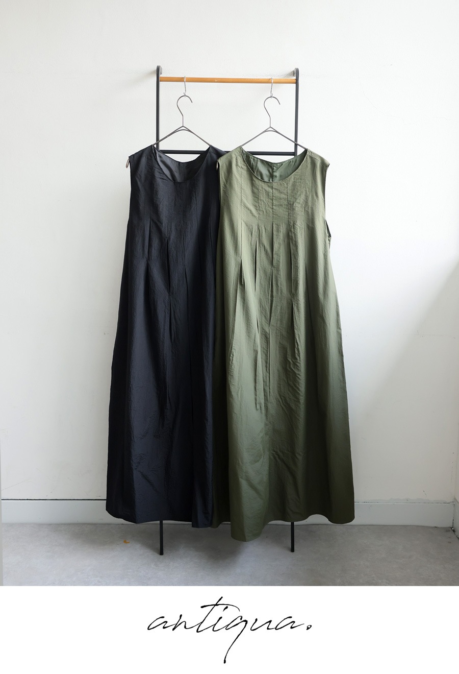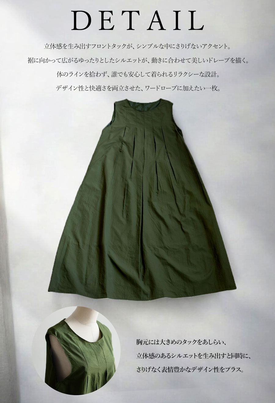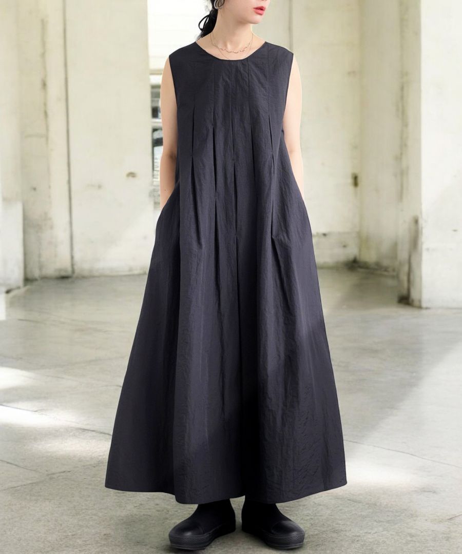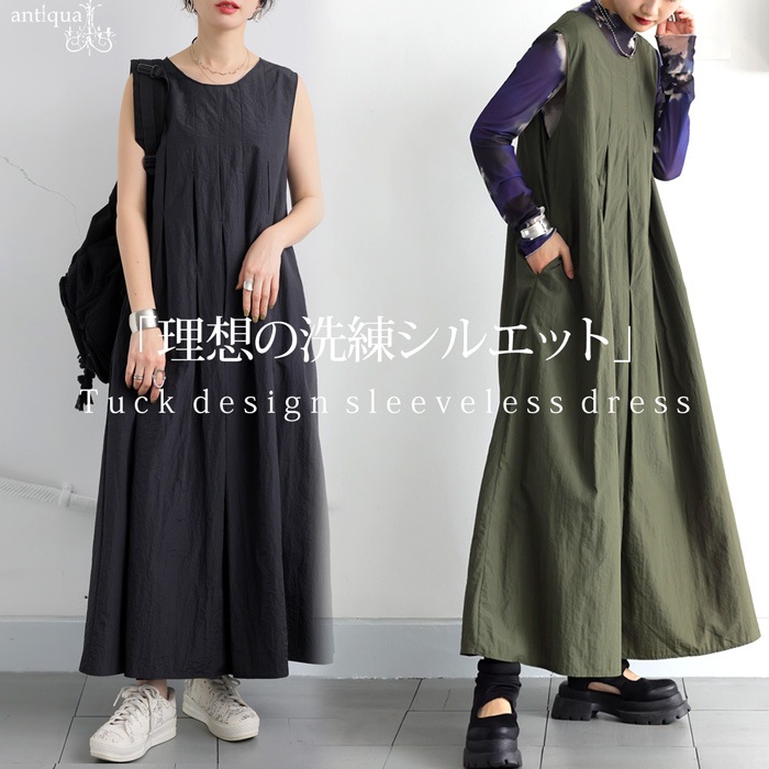 【検索ワード】タックデザインワンピース ワンピ レディース ロング 無地 ノースリーブ 袖なし 丸首 ラウンドネック プルオーバー ポケット付き タック ド絵r-プ ゆったり ナイロン シンプル きれいめ 上品 高級感 レイヤード 重ね着 シワになりにくい 通気性 ハリ感 薄手 ナチュラル ハンサム 大きめ 旅行 ロングワンピース ブラック 黒 カーキ サイズ展開 Regular Plus antiqua アンティカ 大人 おしゃれ 10代 20代 30代 40代 50代 60代 春 夏 秋 冬 オールシーズン お洒落 カジュアル かわいい かっこいい あんてぃか