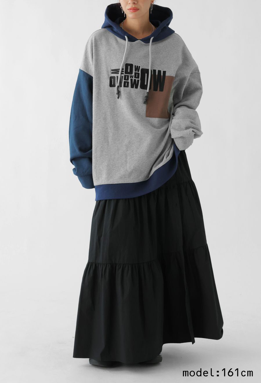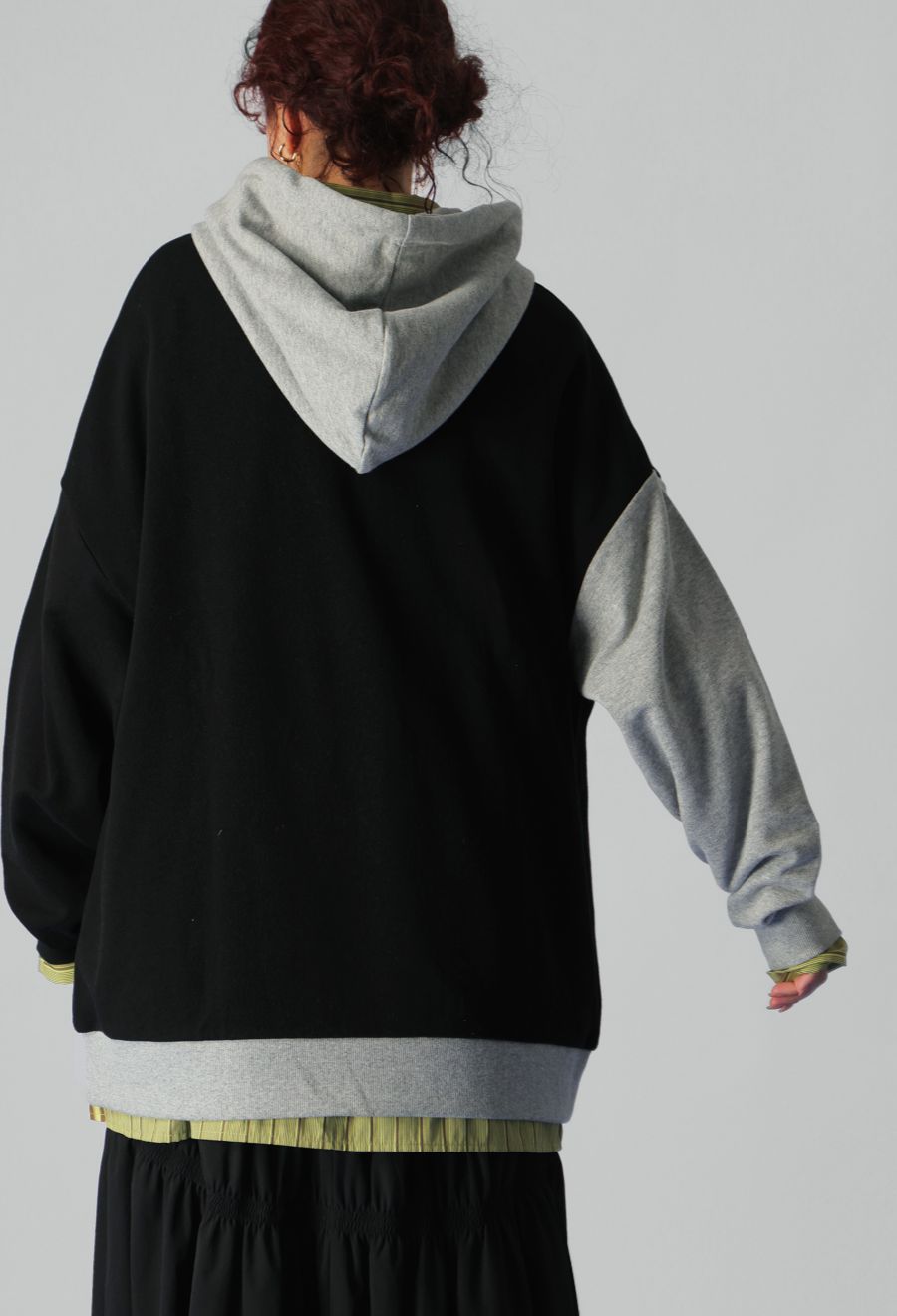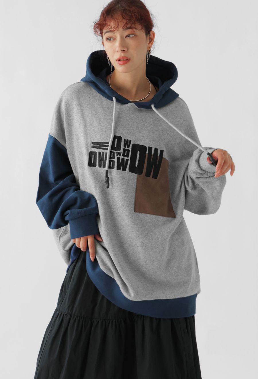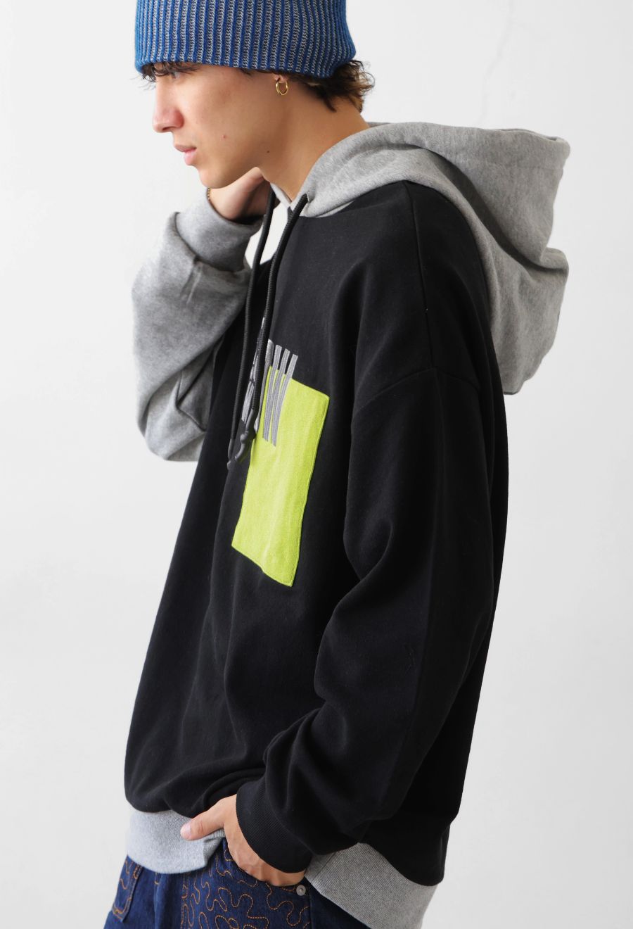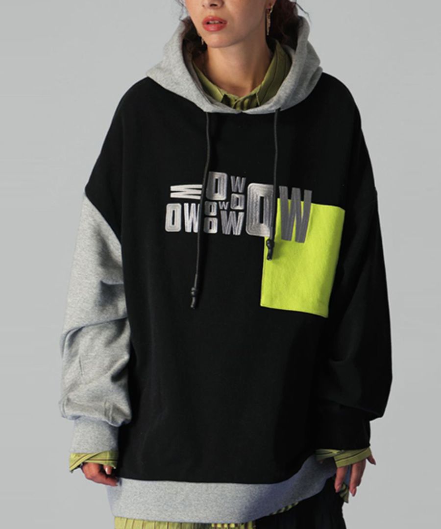 立体感のあるロゴ刺繍とアシンメトリーな配色切替が目を惹く、存在感抜群のフーディートップスです。