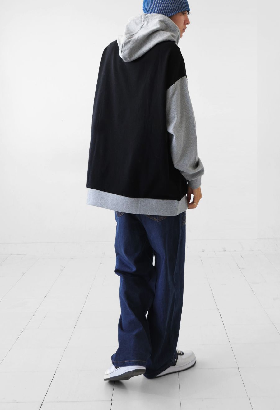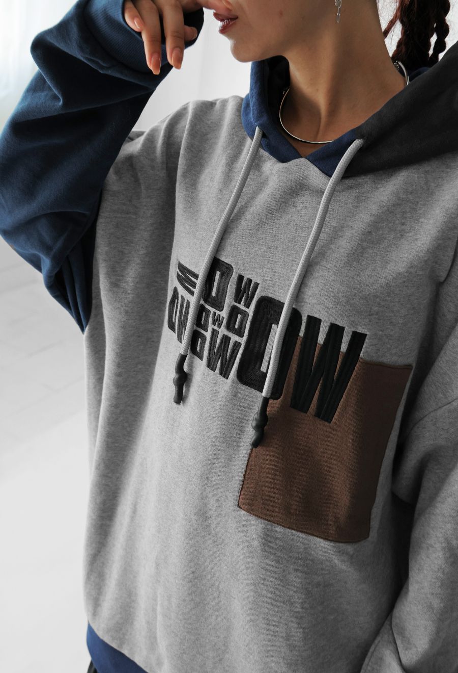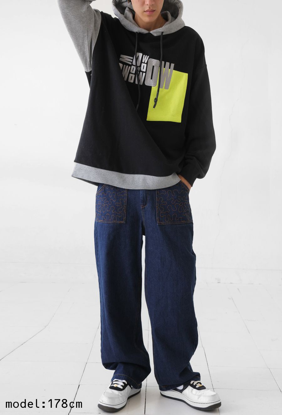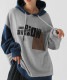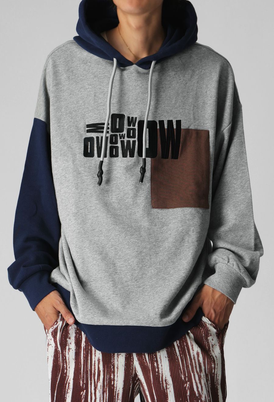 立体感のあるロゴ刺繍とアシンメトリーな配色切替が目を惹く、存在感抜群のフーディートップスです。