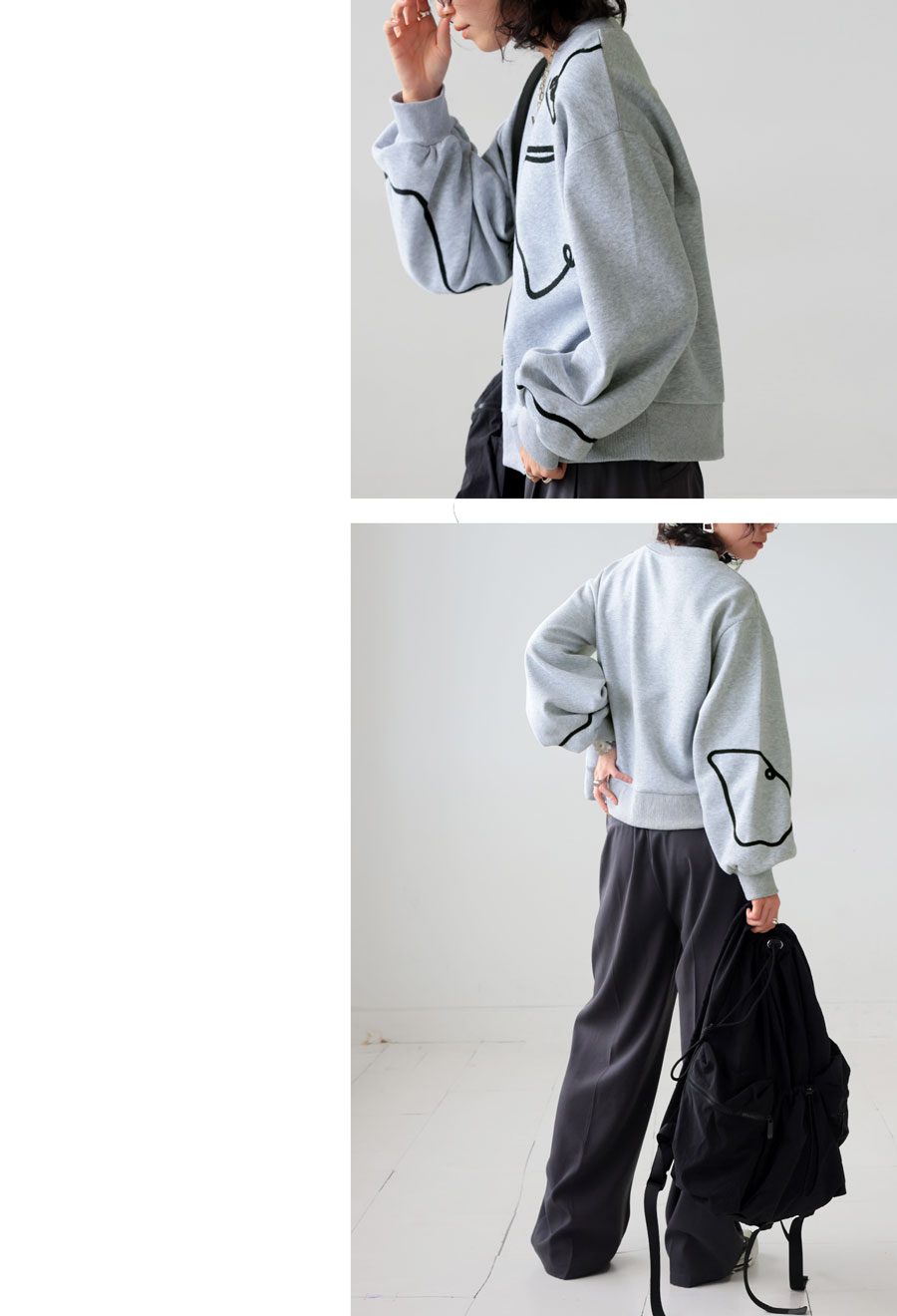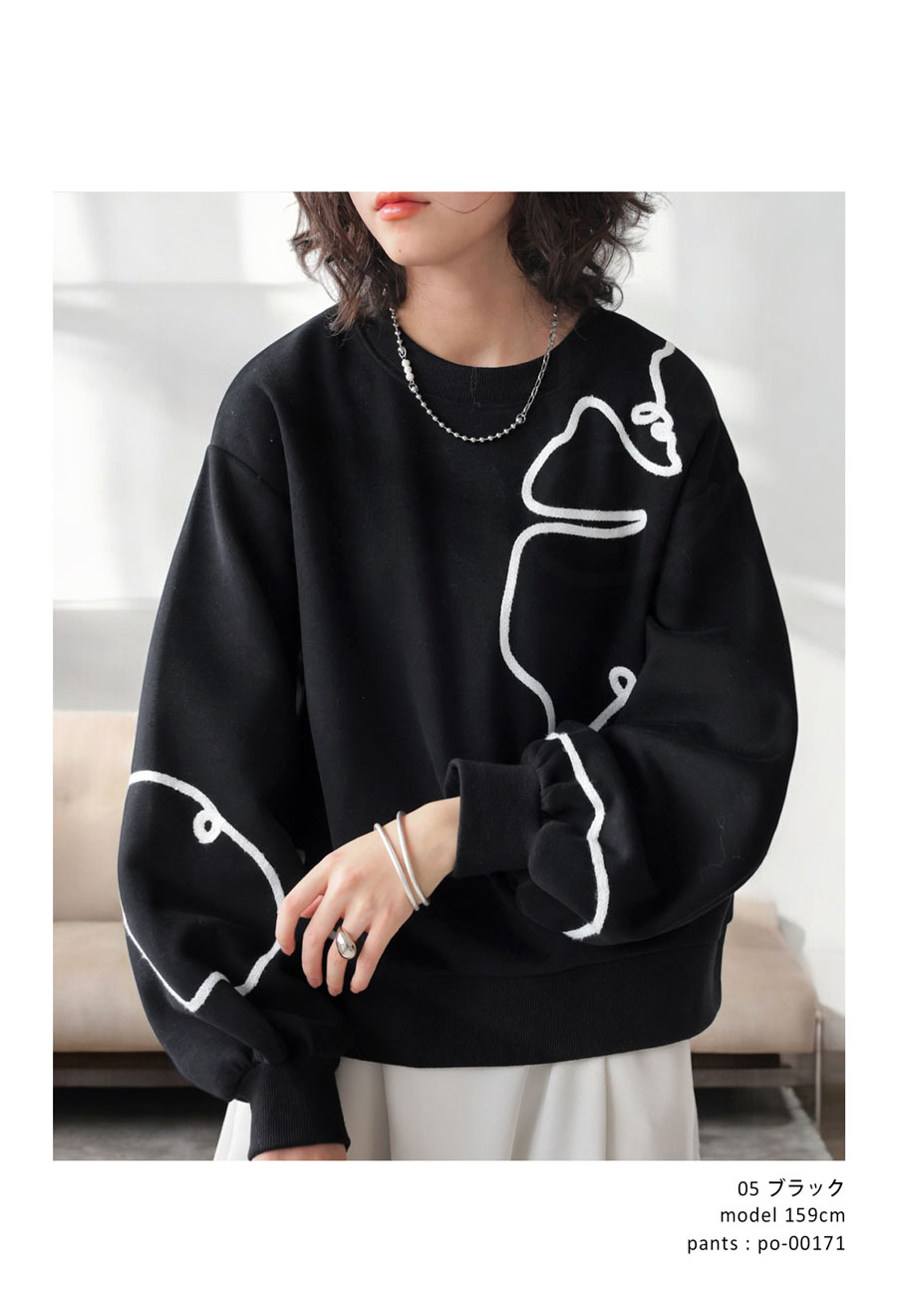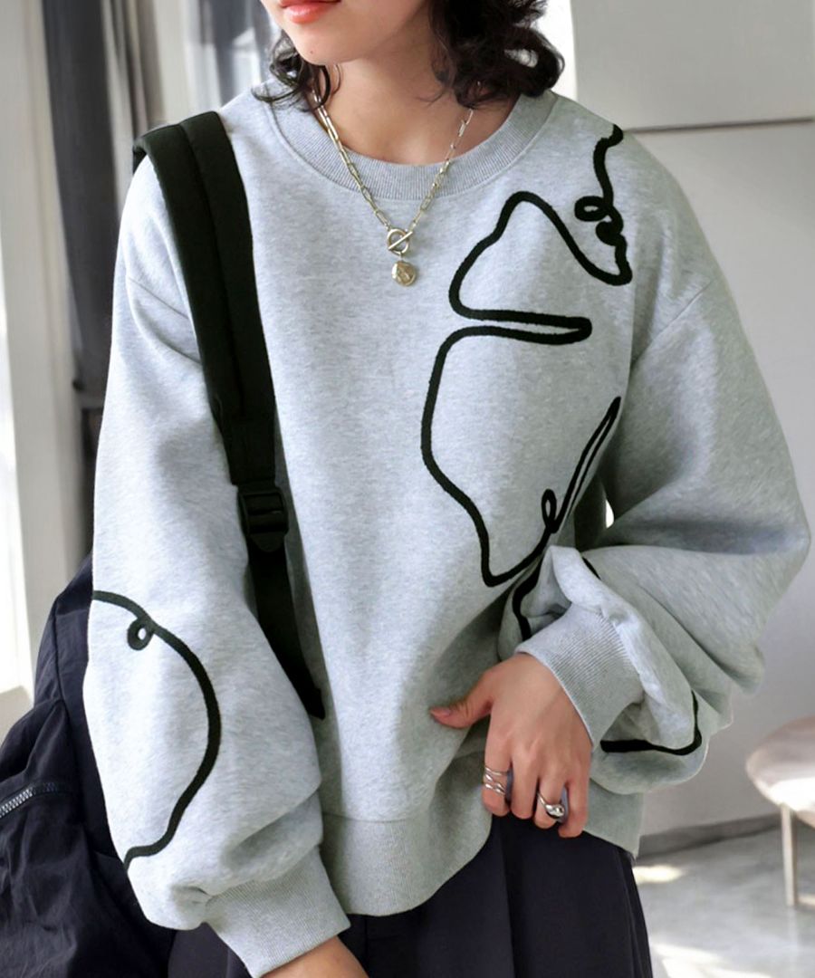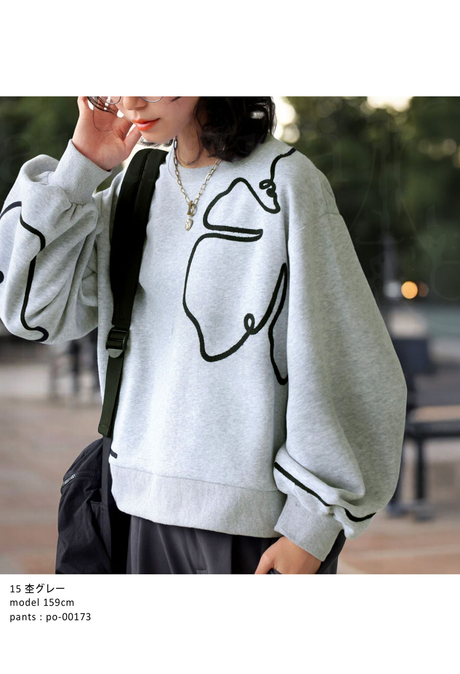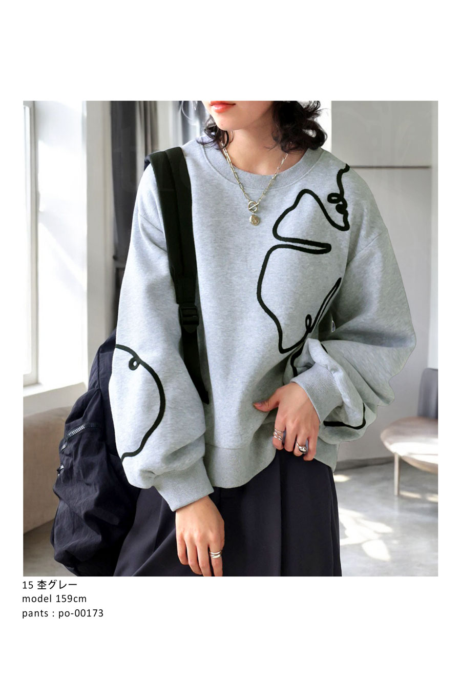 ボリュームたっぷりな袖が、ポンチ素材と相性バッチリなトレーナー。