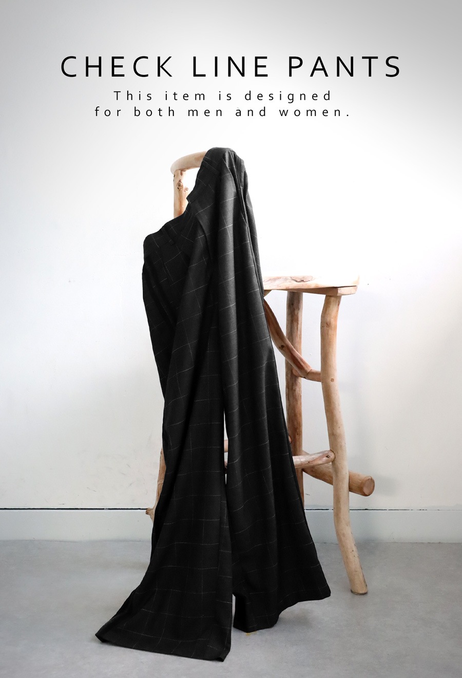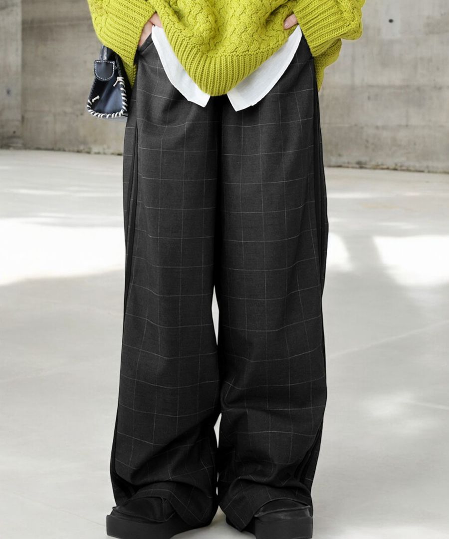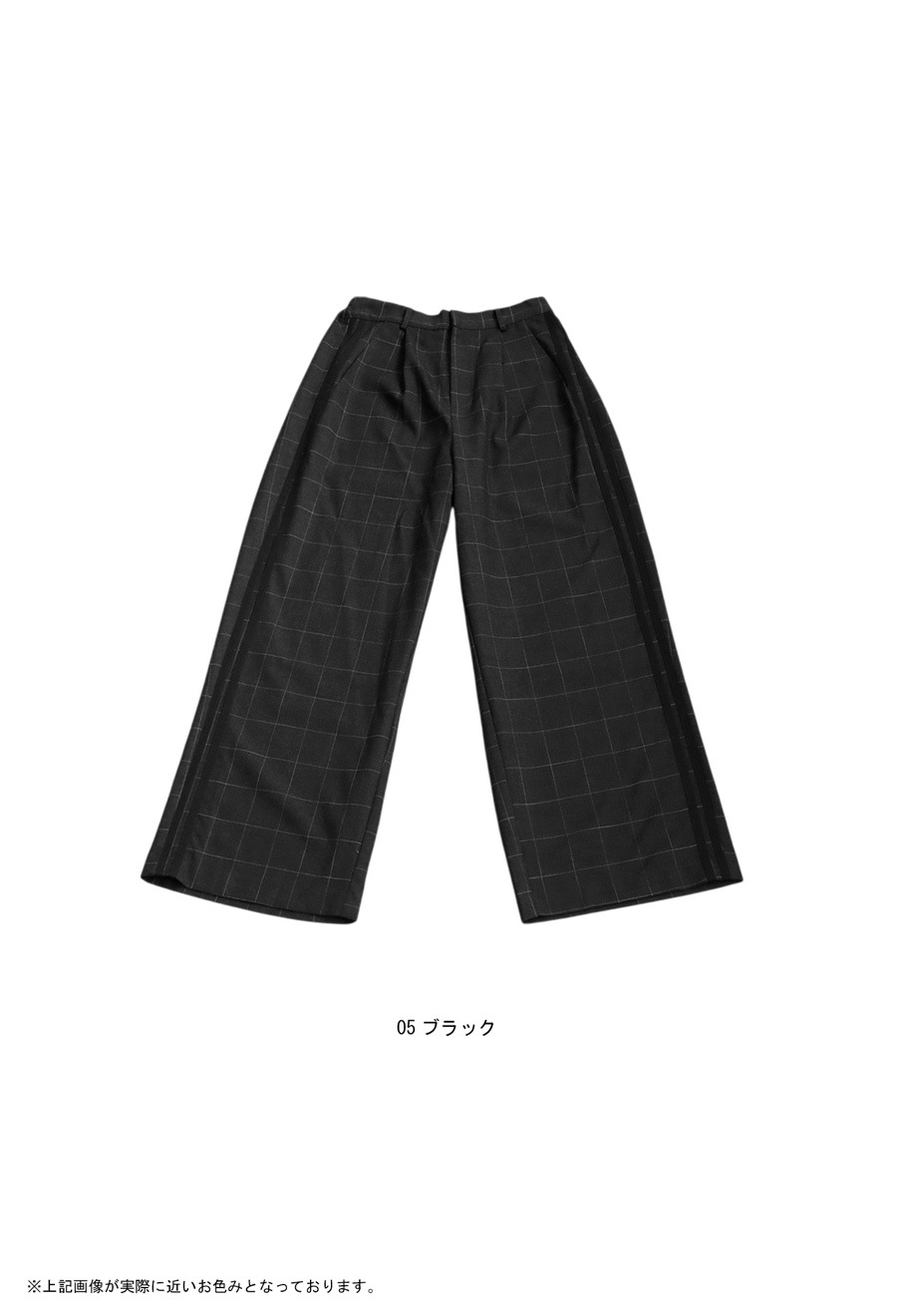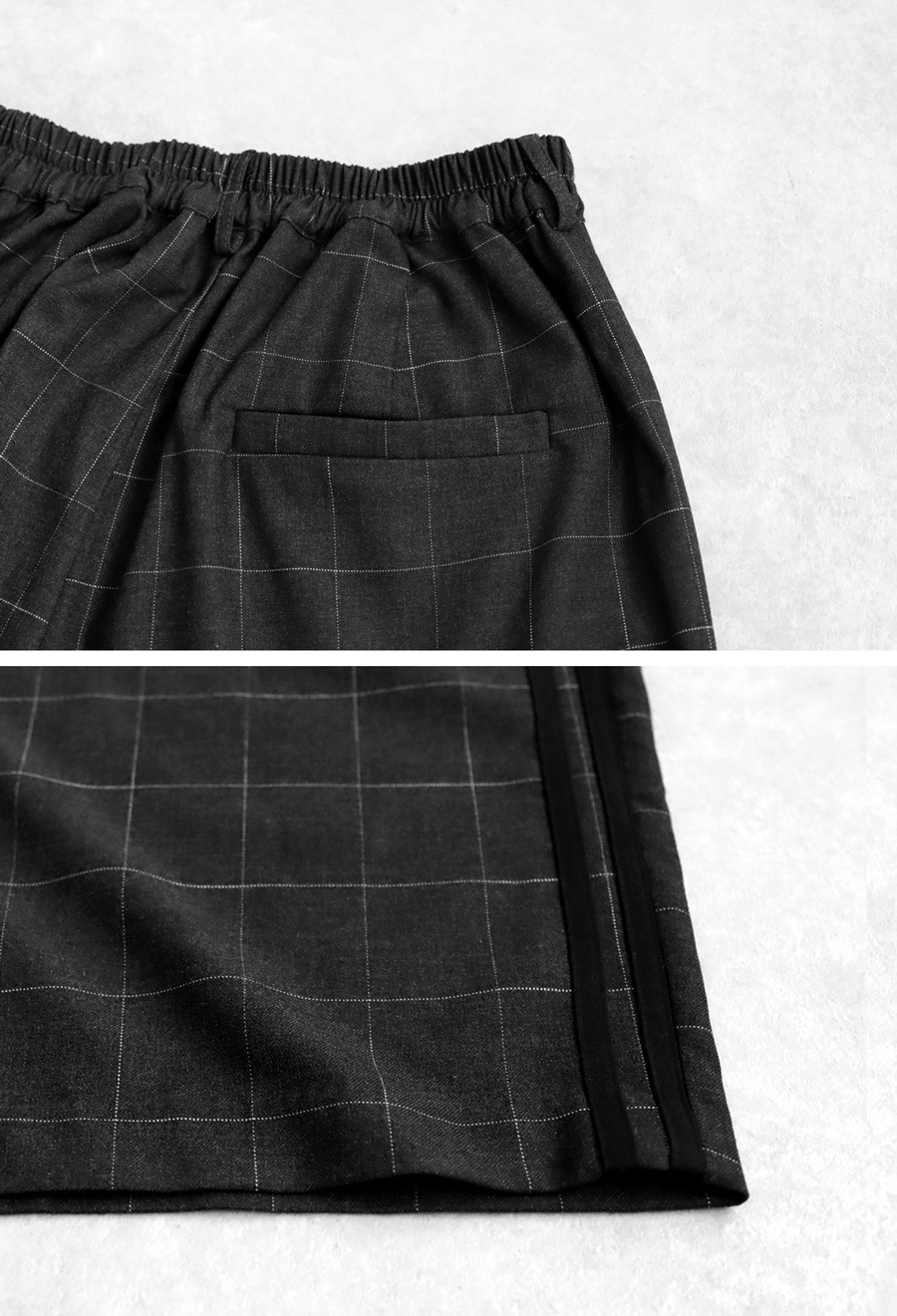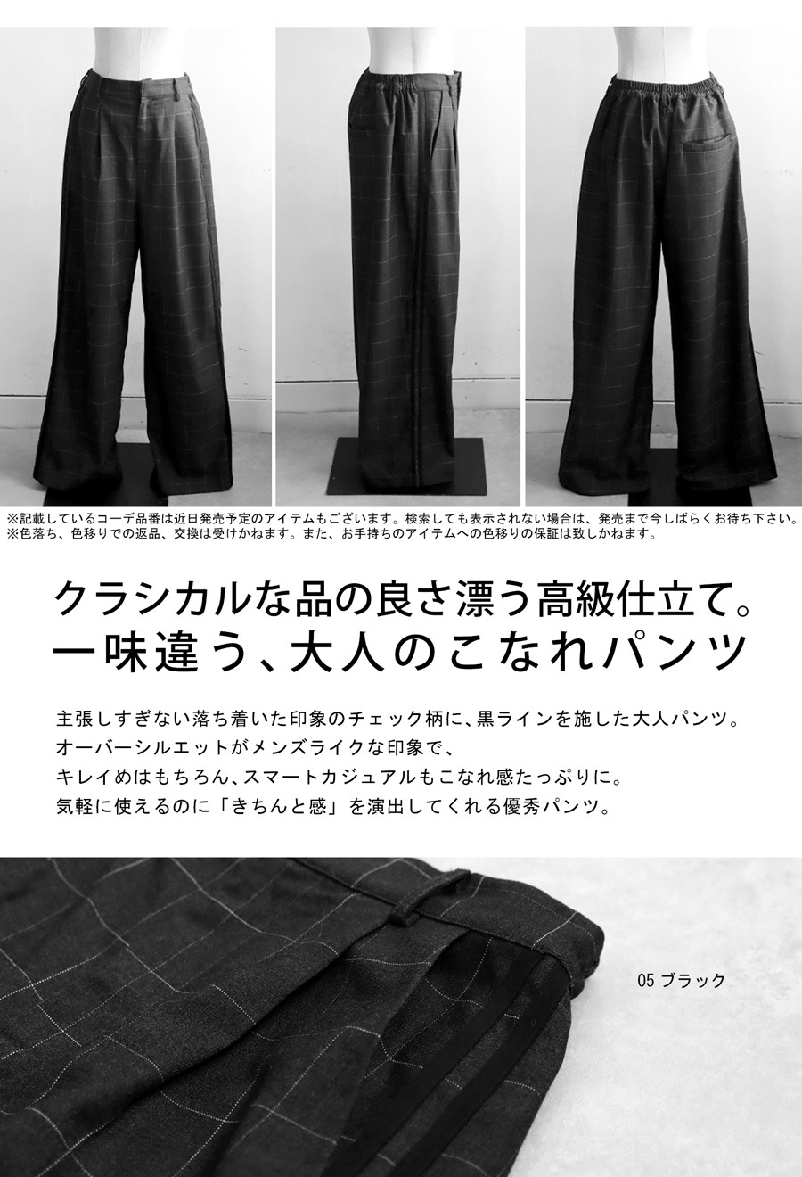 落ち着いた印象のチェック柄に、黒ラインを施した大人パンツ。