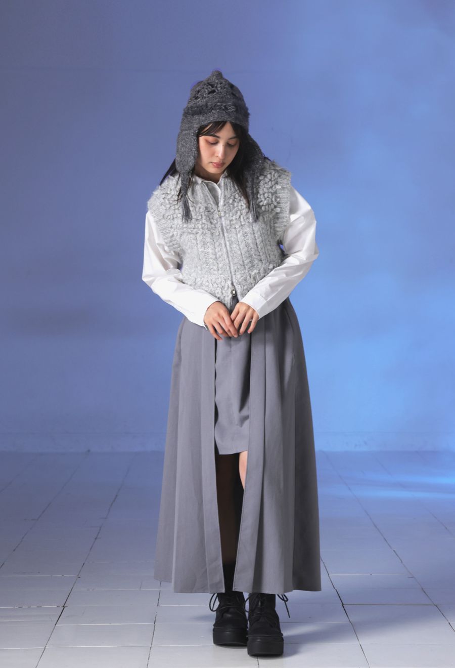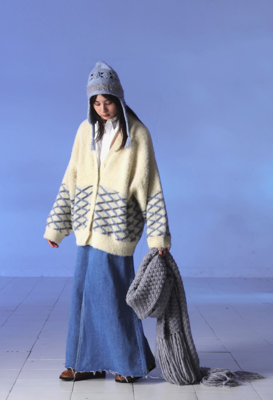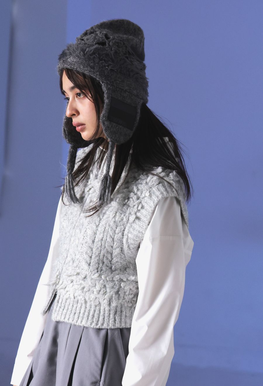 イヤーフラップ付きで耳までしっかり防寒でき、冬のスタイリングにぴったりのアイテムです。