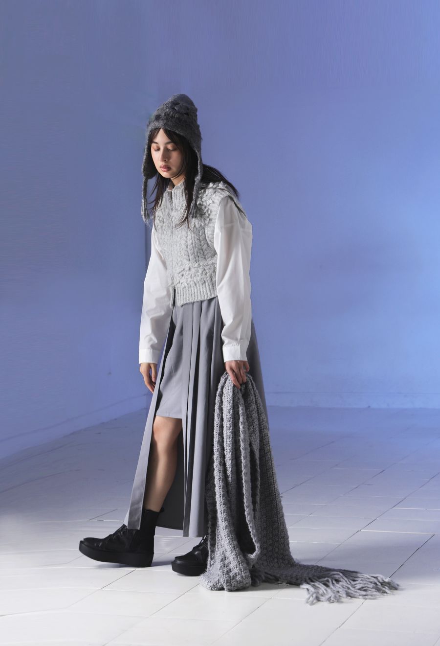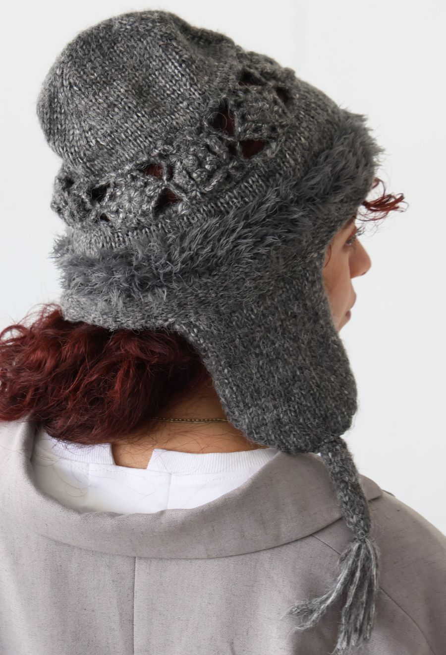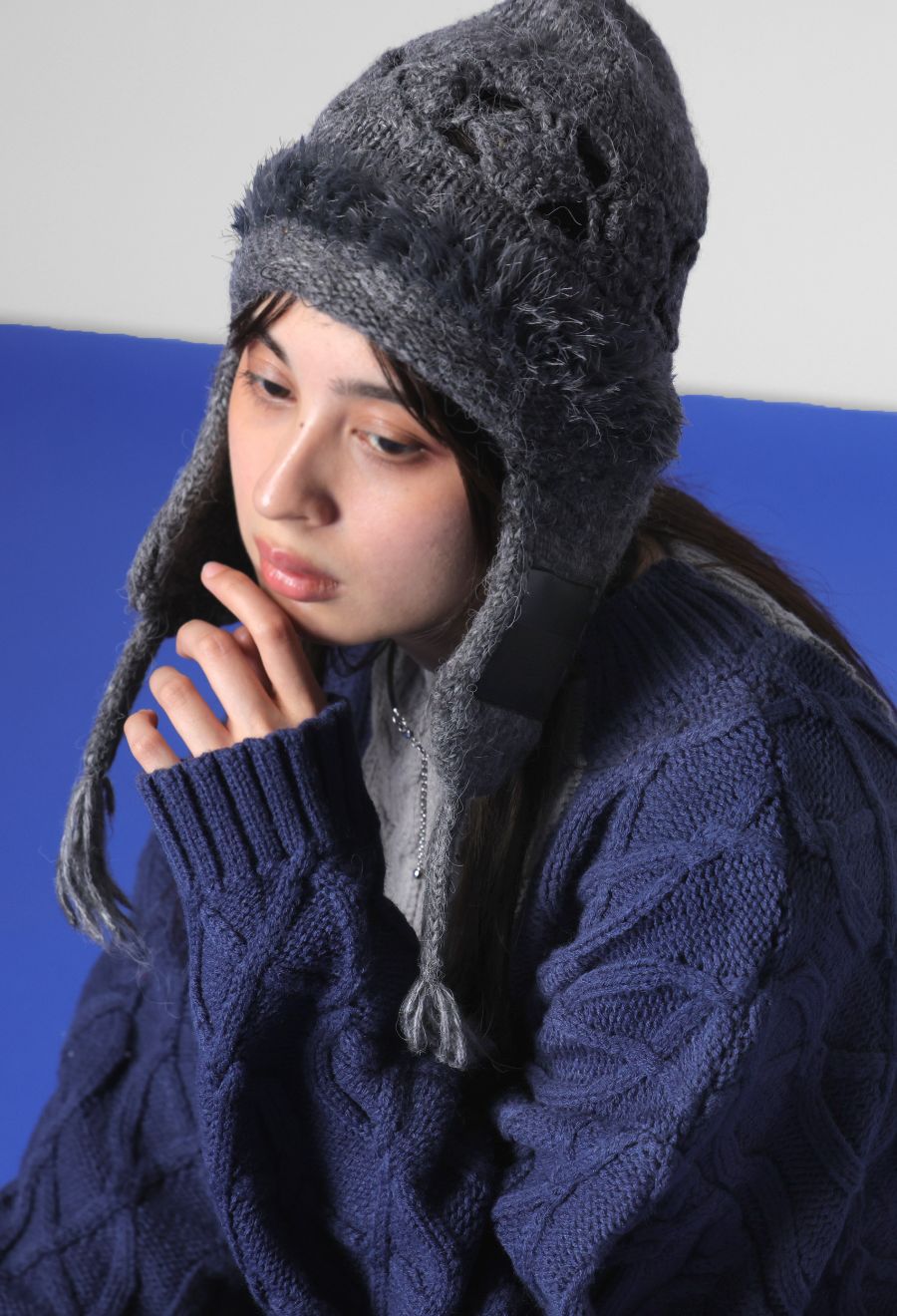 ケーブル編みとレース調の編み模様、毛足のあるファー素材が、季節感と上品さを演出します。
