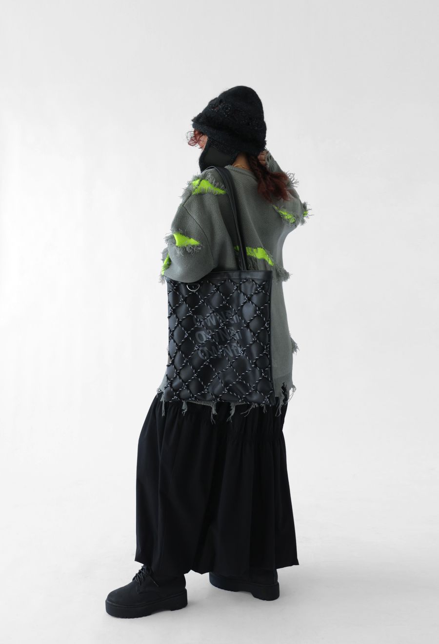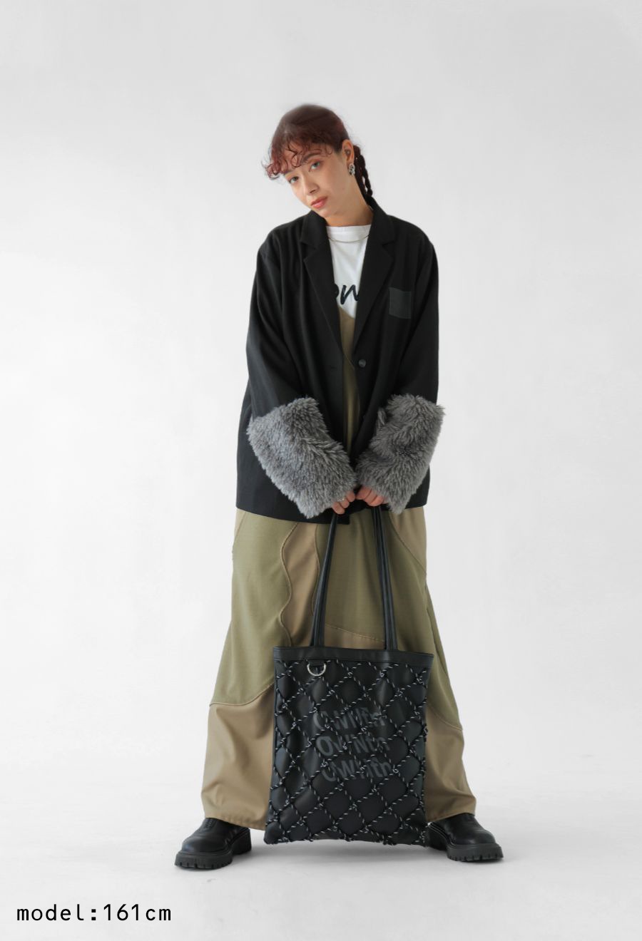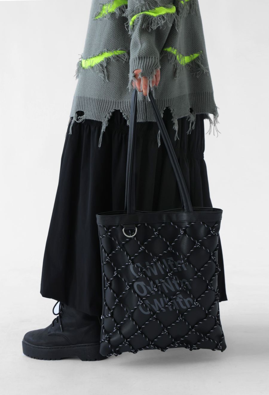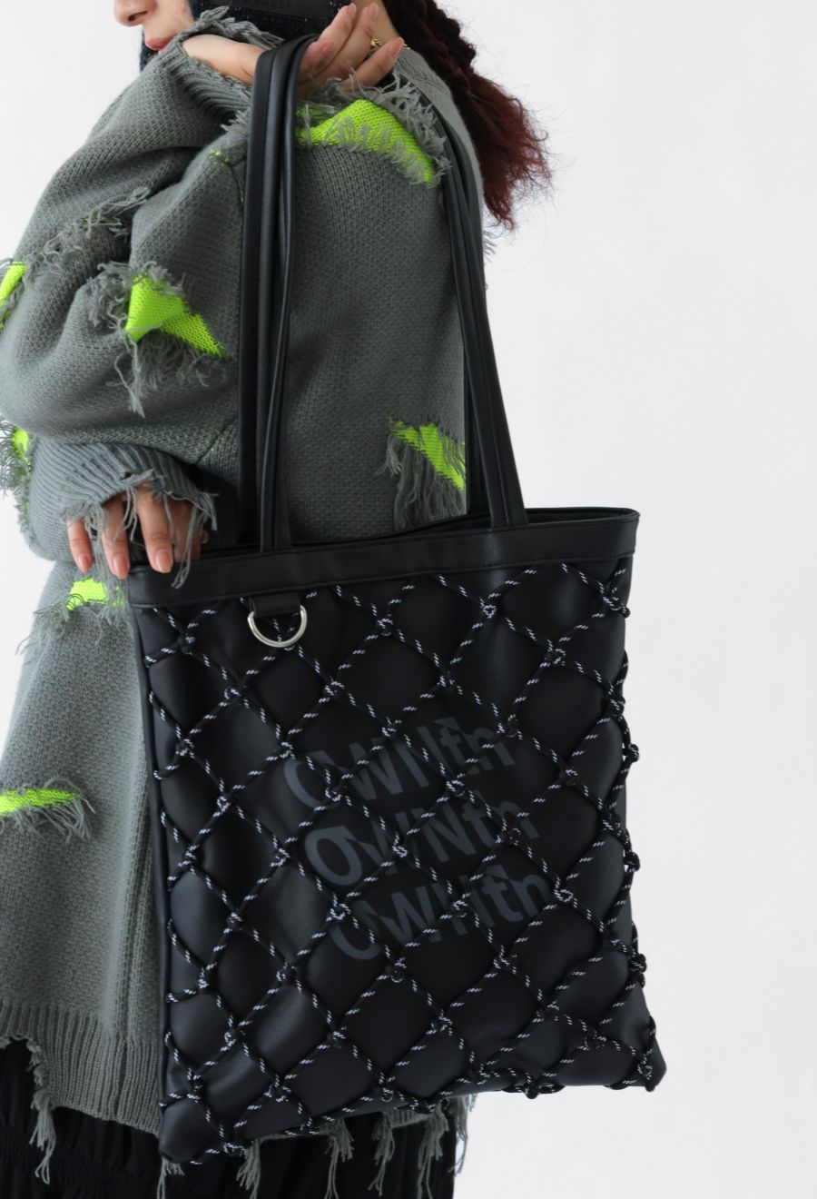 高級感のあるマットなシボ感とコードを結んだメッシュ使いで、持つだけでスタイルにこなれた存在感が生まれます。