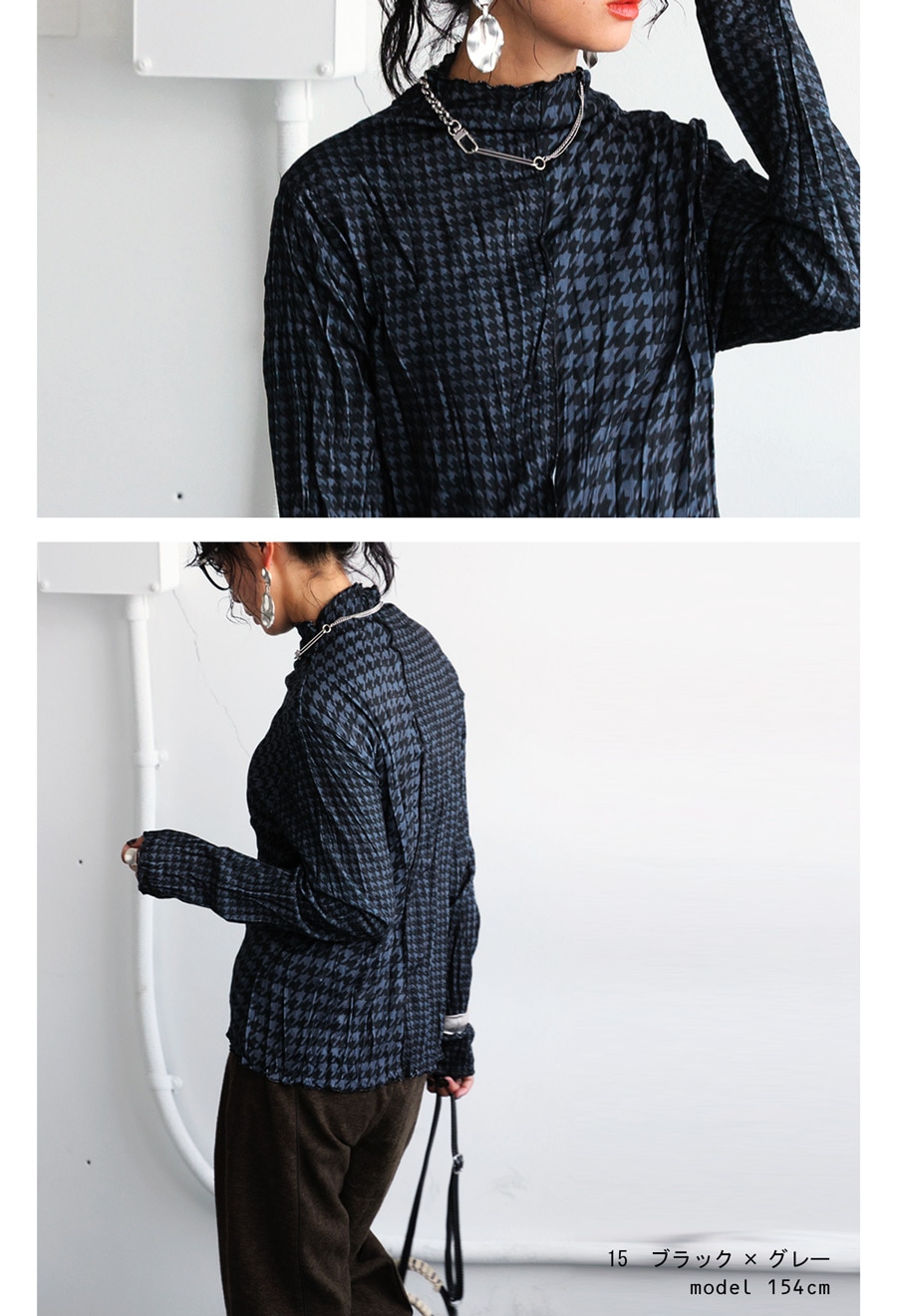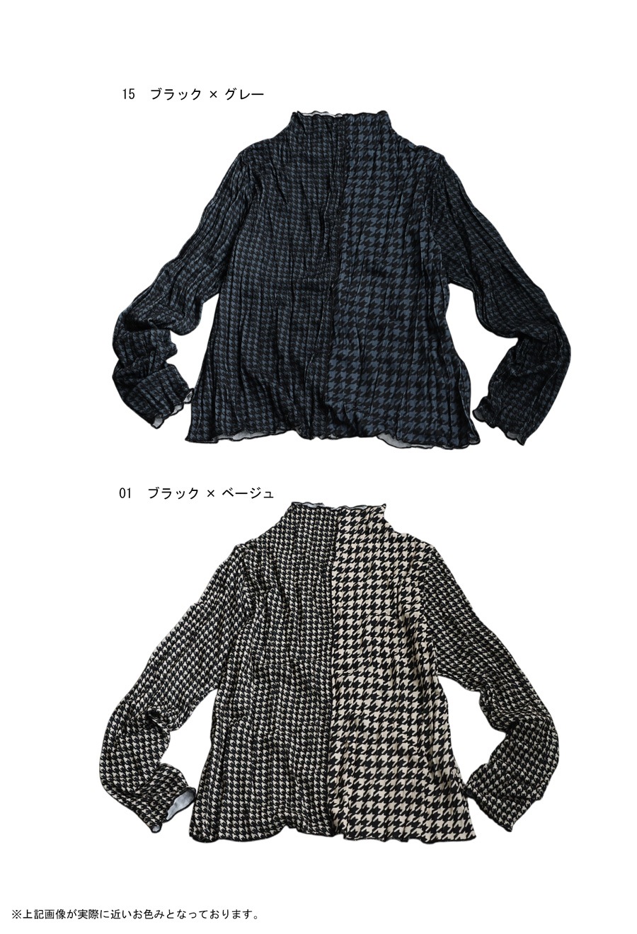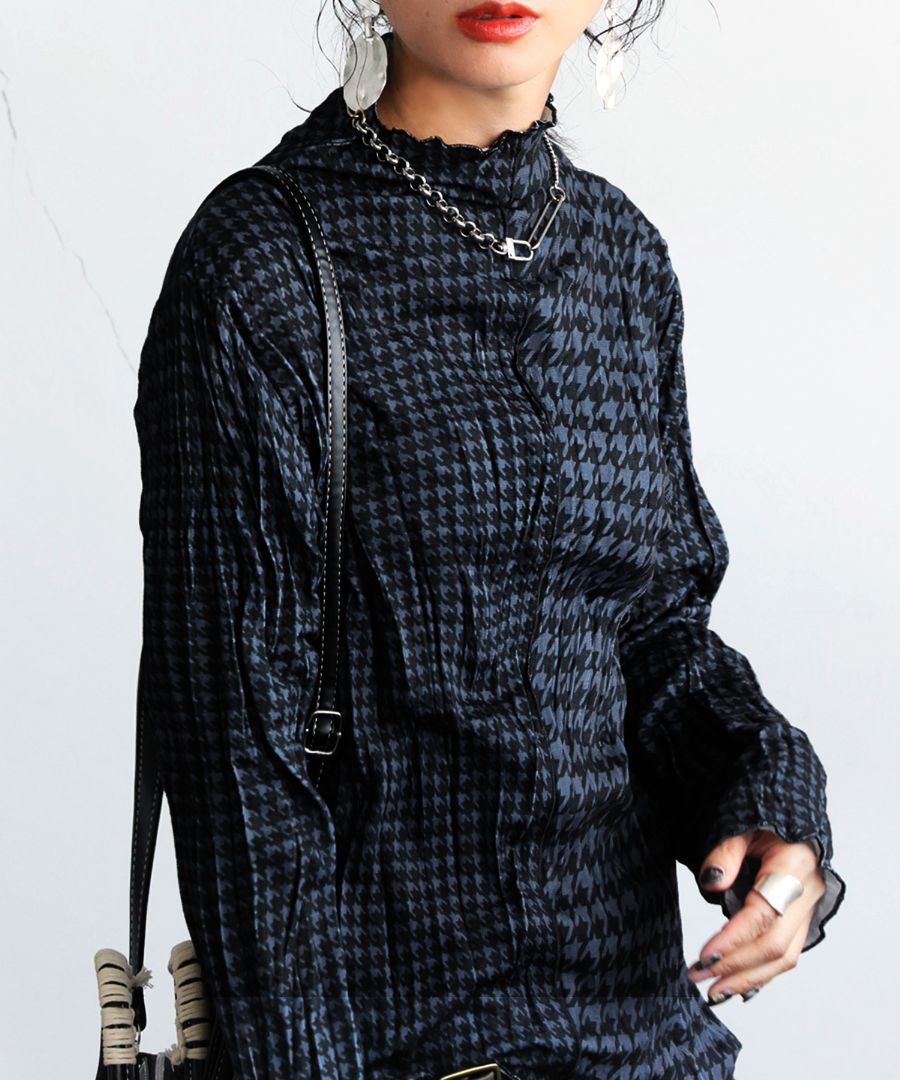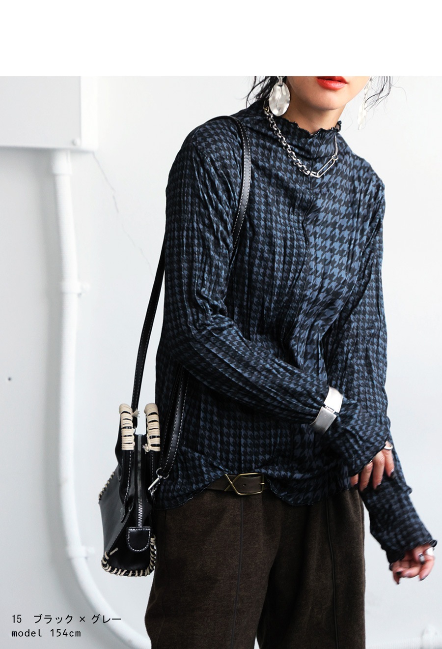 大小のアシメの千鳥柄にシワ加工を施した目を惹くトップス。