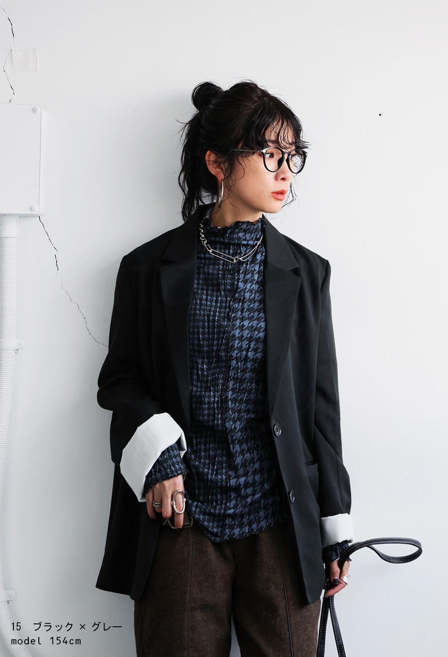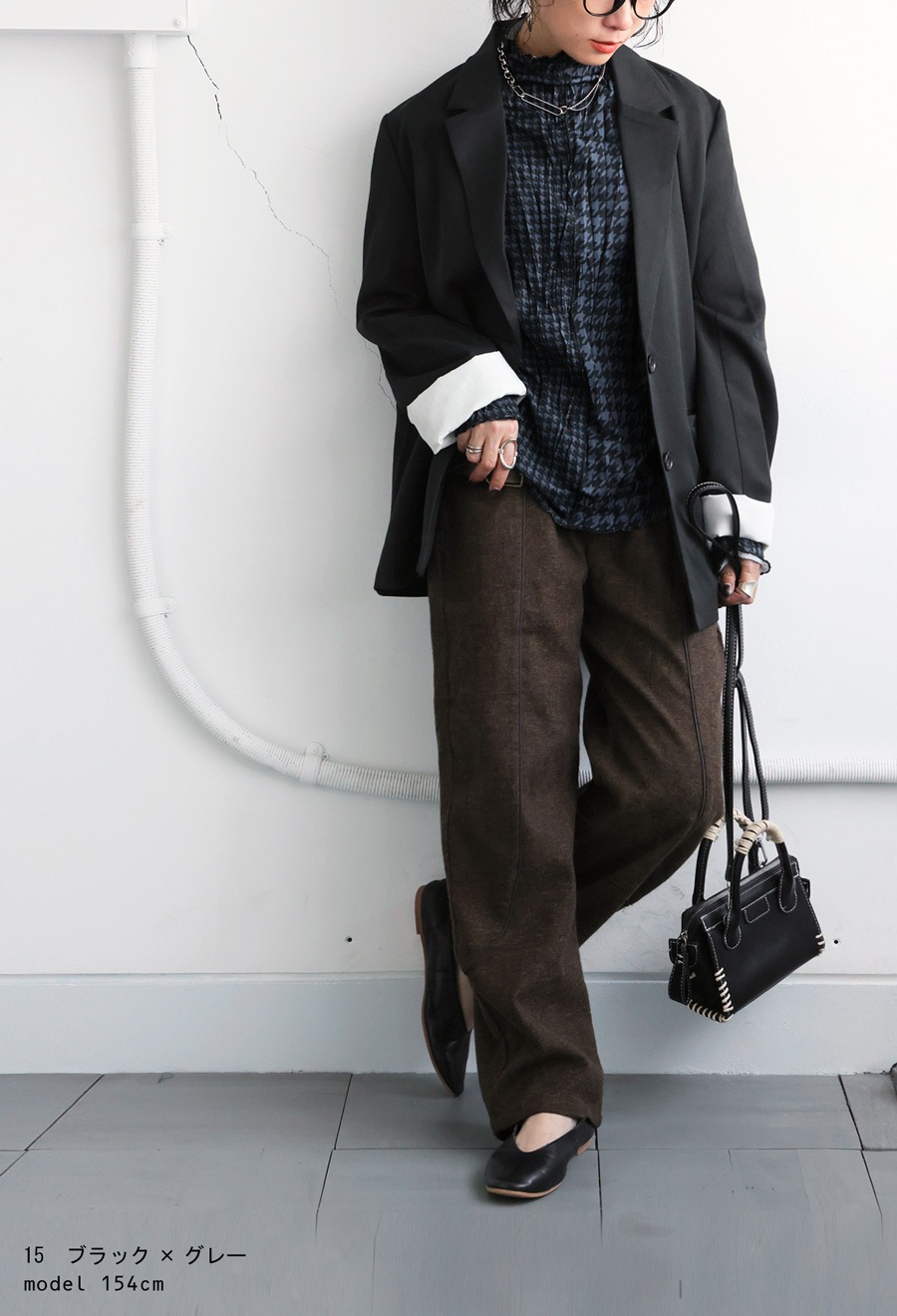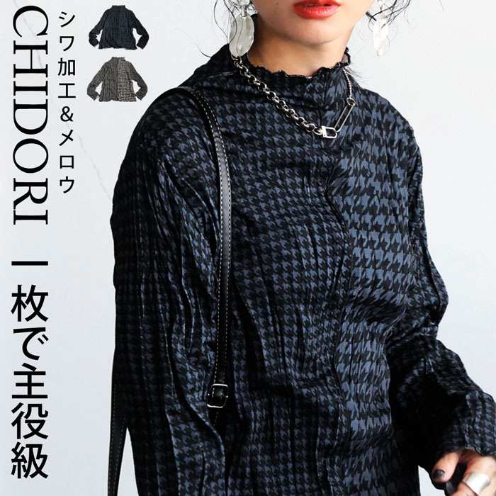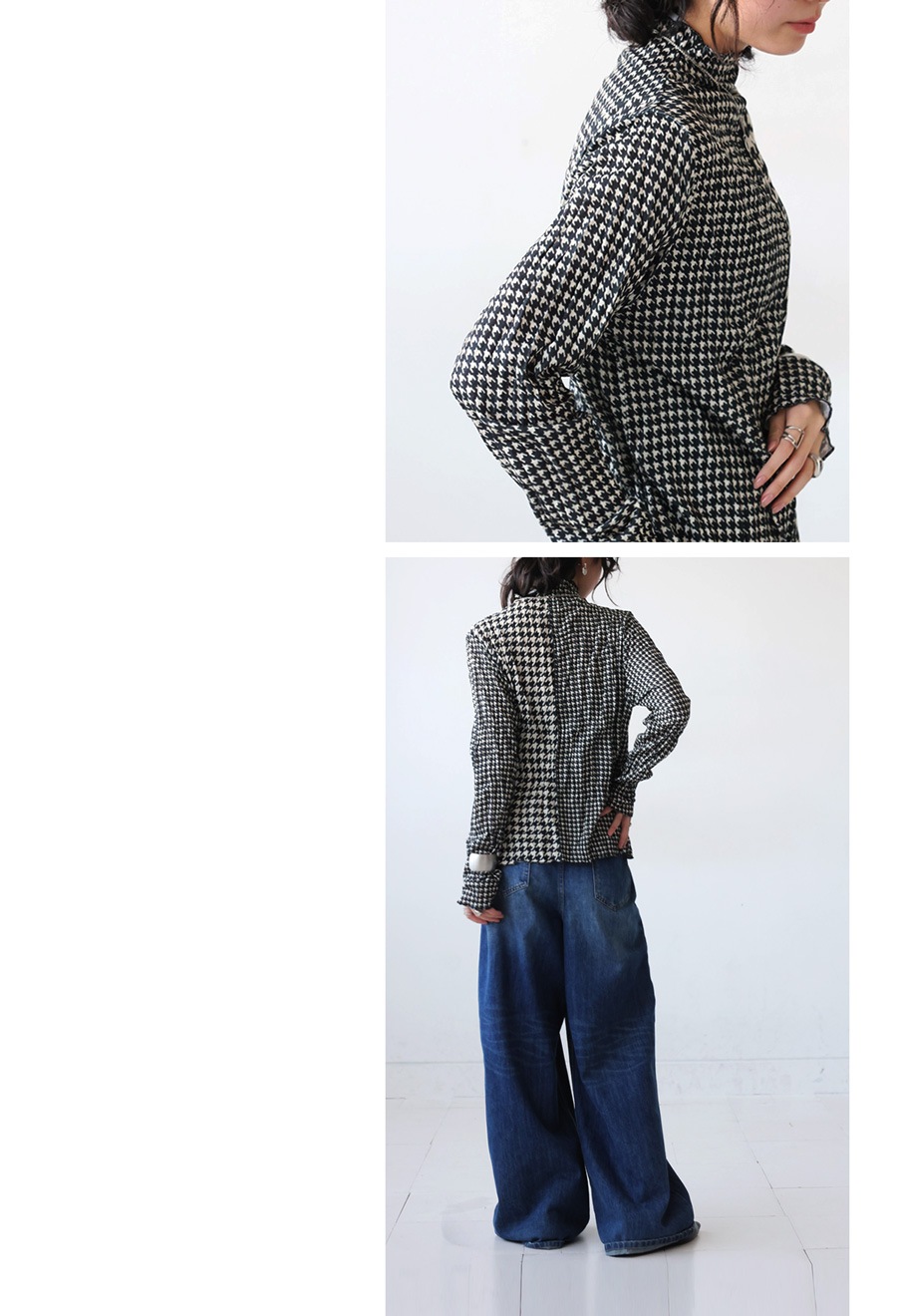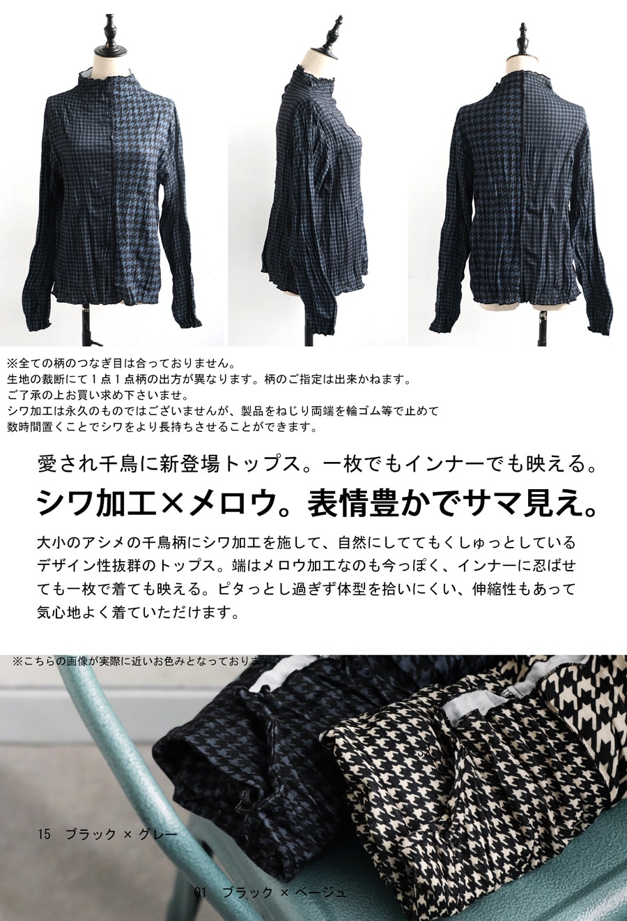 大小のアシメの千鳥柄にシワ加工を施した目を惹くトップス。