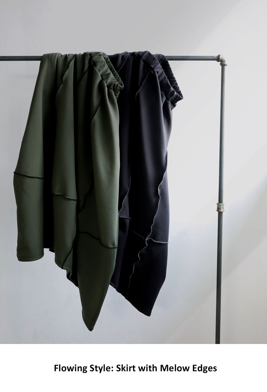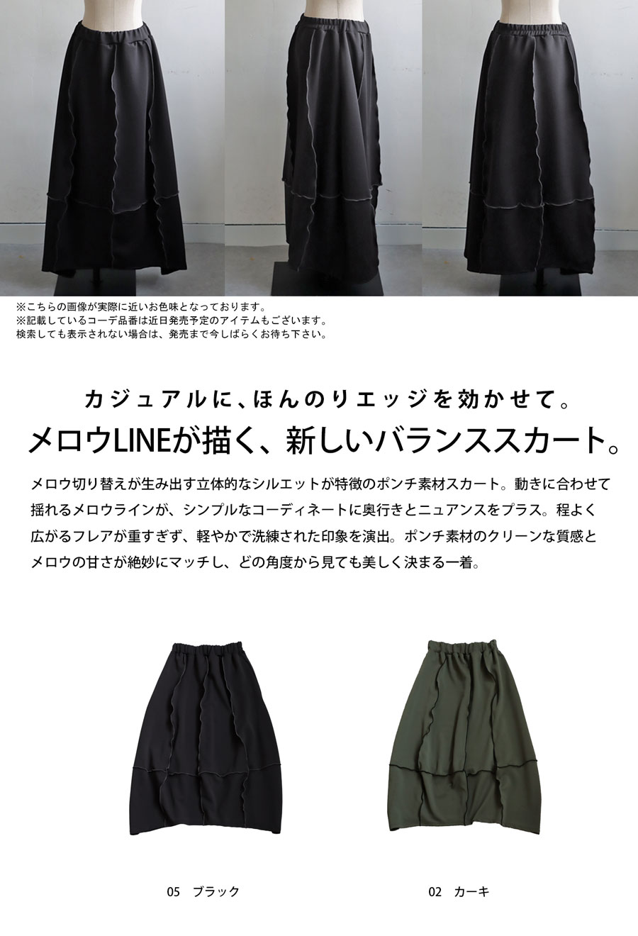 メロウ切り替えが生み出す立体的なシルエットが特徴的なポンチ素材のスカート。