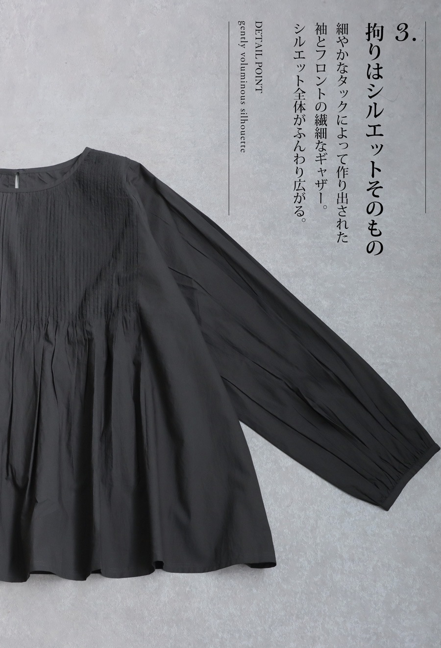 【検索ワード】ピンタックブラウス ブラウス レディース トップス 長袖 無地 きれいめ シャツ ピンタック プルオーバー かぶり フロントタック ギャザー 綿100 綿 コットン ボリューム ぽわん袖 クルーネック 丸首 バックデザイン 高級感 ゆったり シンプル オーバーサイズ 大きいサイズ 上品 通勤 オフィス フォーマル オケージョン 入卒 ホワイト 白 ブラック 黒 チャコール antiqua mulumulu アンティカ ムルムル 大人 おしゃれ 10代 20代 30代 40代 50代 60代 春 夏 お洒落 カジュアル かわいい かっこいい あんてぃか インド製 ジャイプール 繊細 手仕事 職人技
