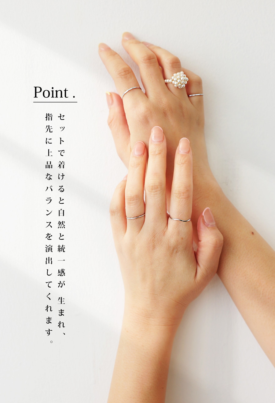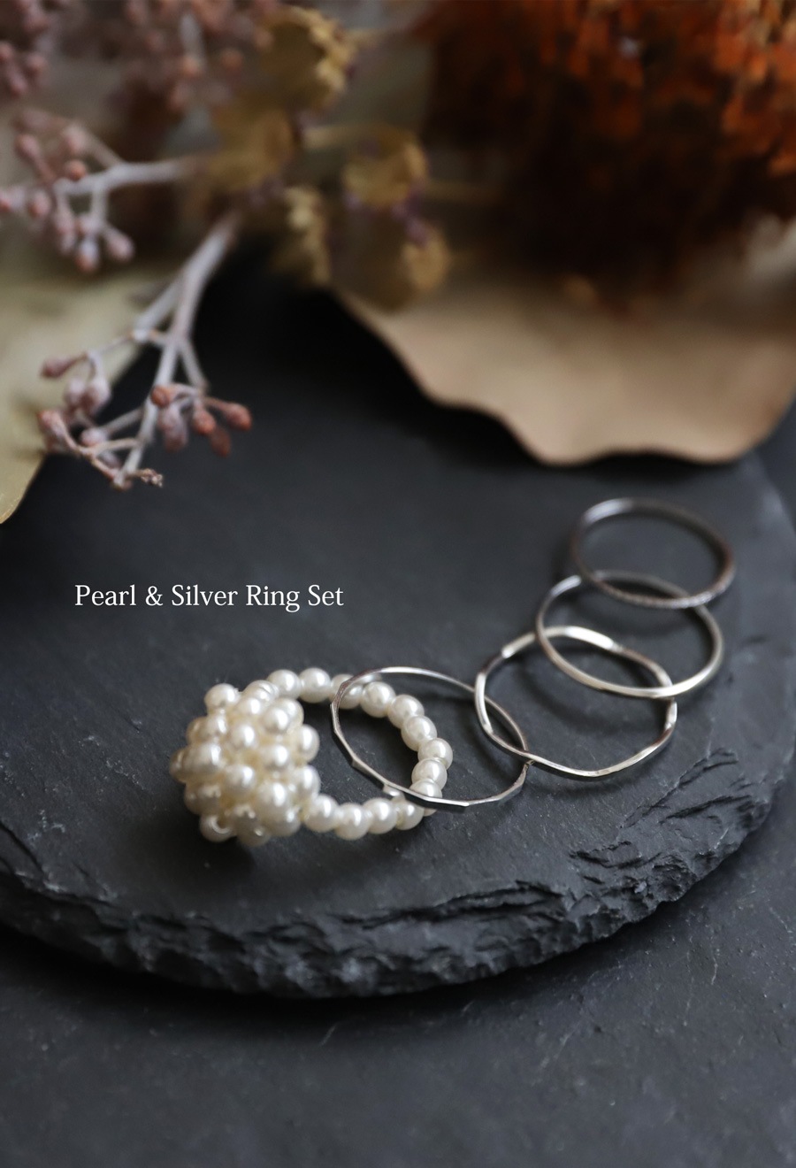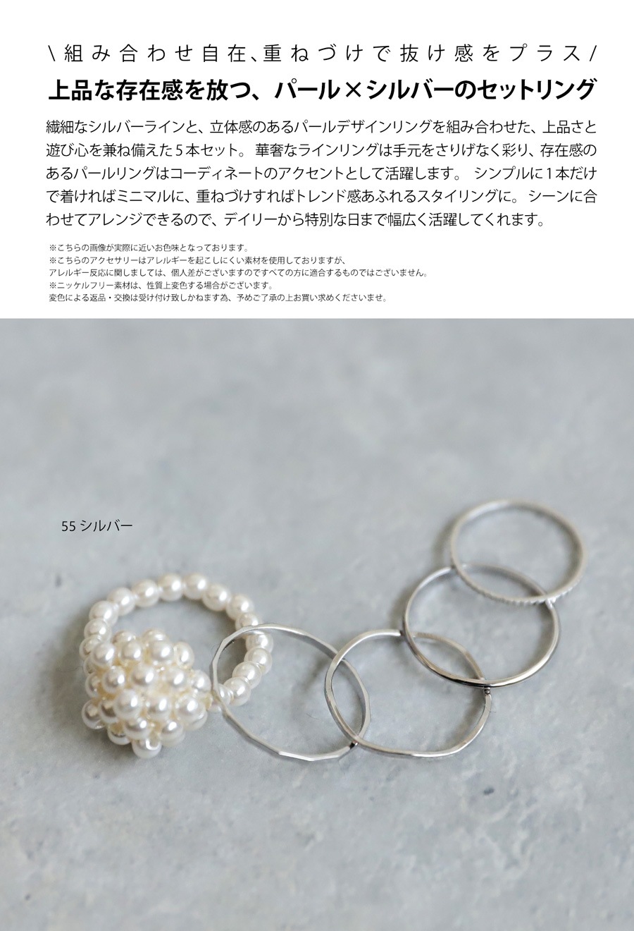 繊細なシルバーラインと立体感のあるパールデザインリングを組み合わせた5本セットです。