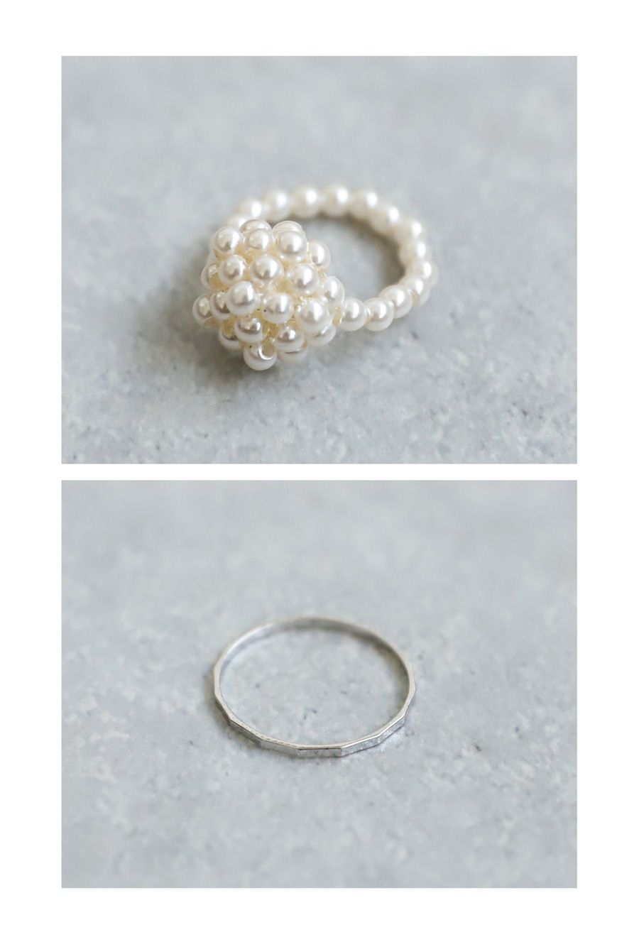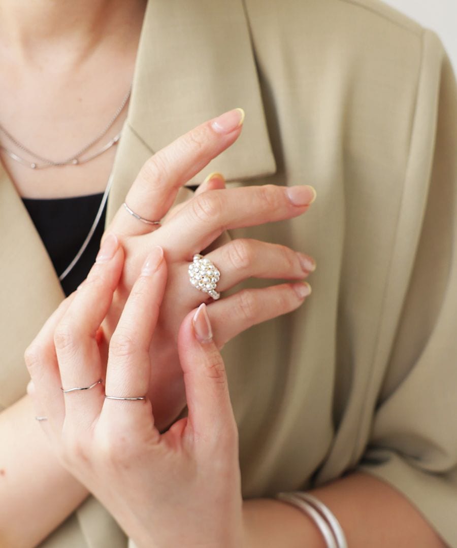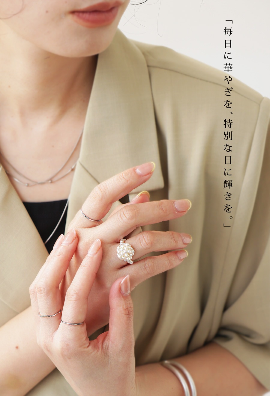 華やかなパールリングはアクセントとなり、シンプルなコーディネートにも映えるデザイン。