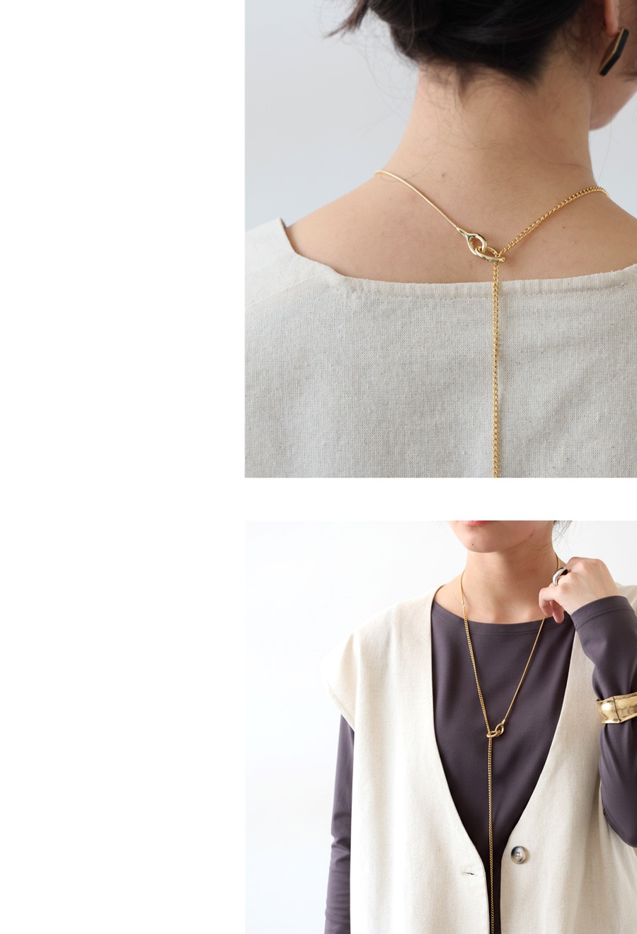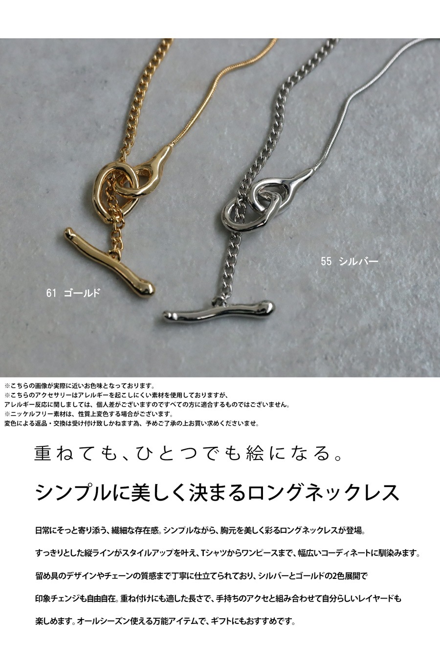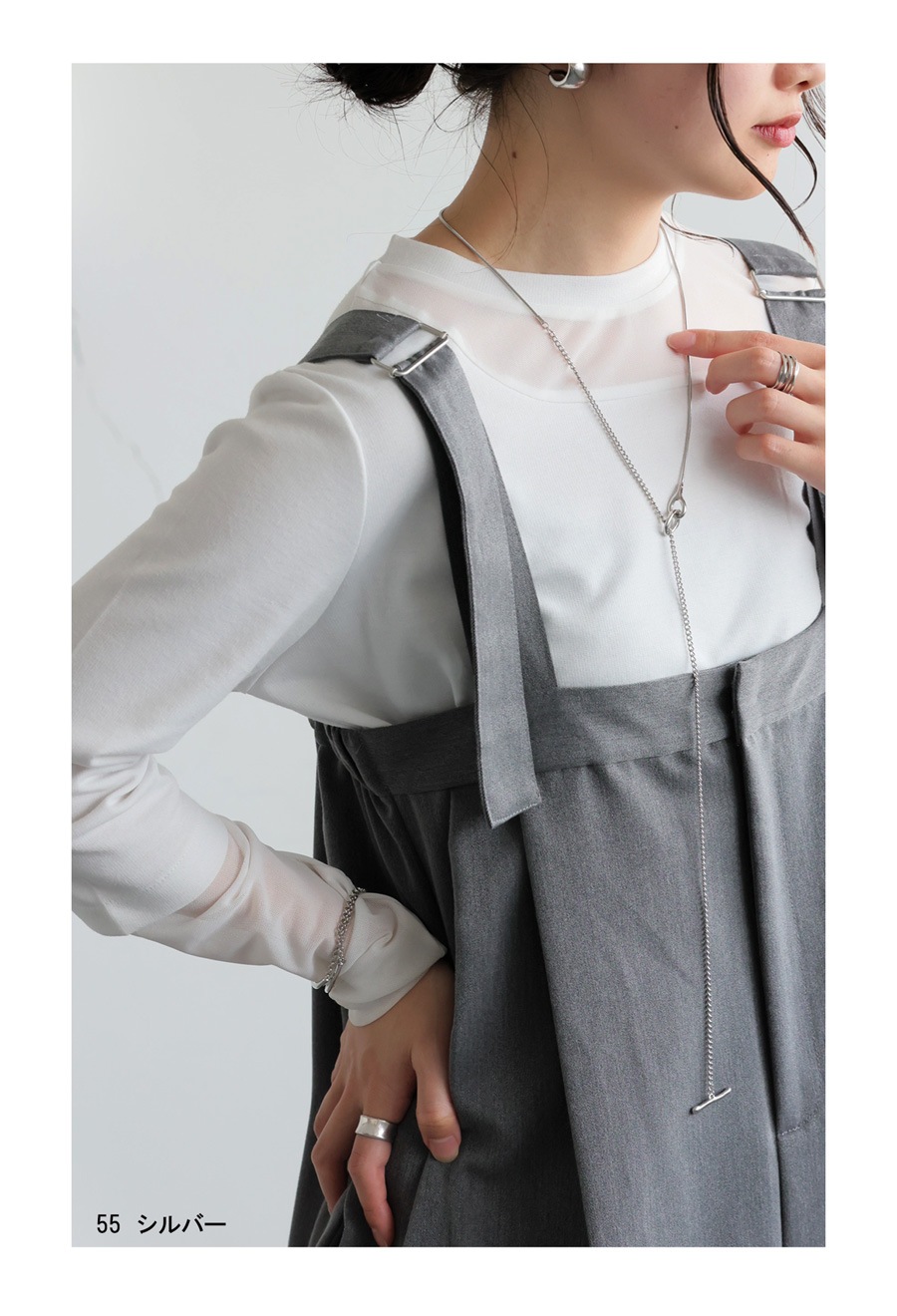 ひとつでも重ね付けでもバランス良く決まる長さで、コーデに合わせたアレンジが自由自在。