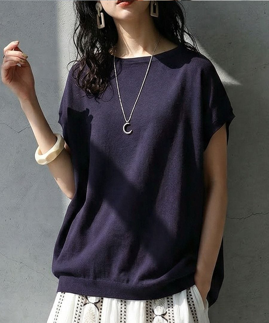 気になる二の腕をさりげなくカバーする絶妙な袖丈と、ほどよい丈感でタックインスタイルもすっきり決まります。